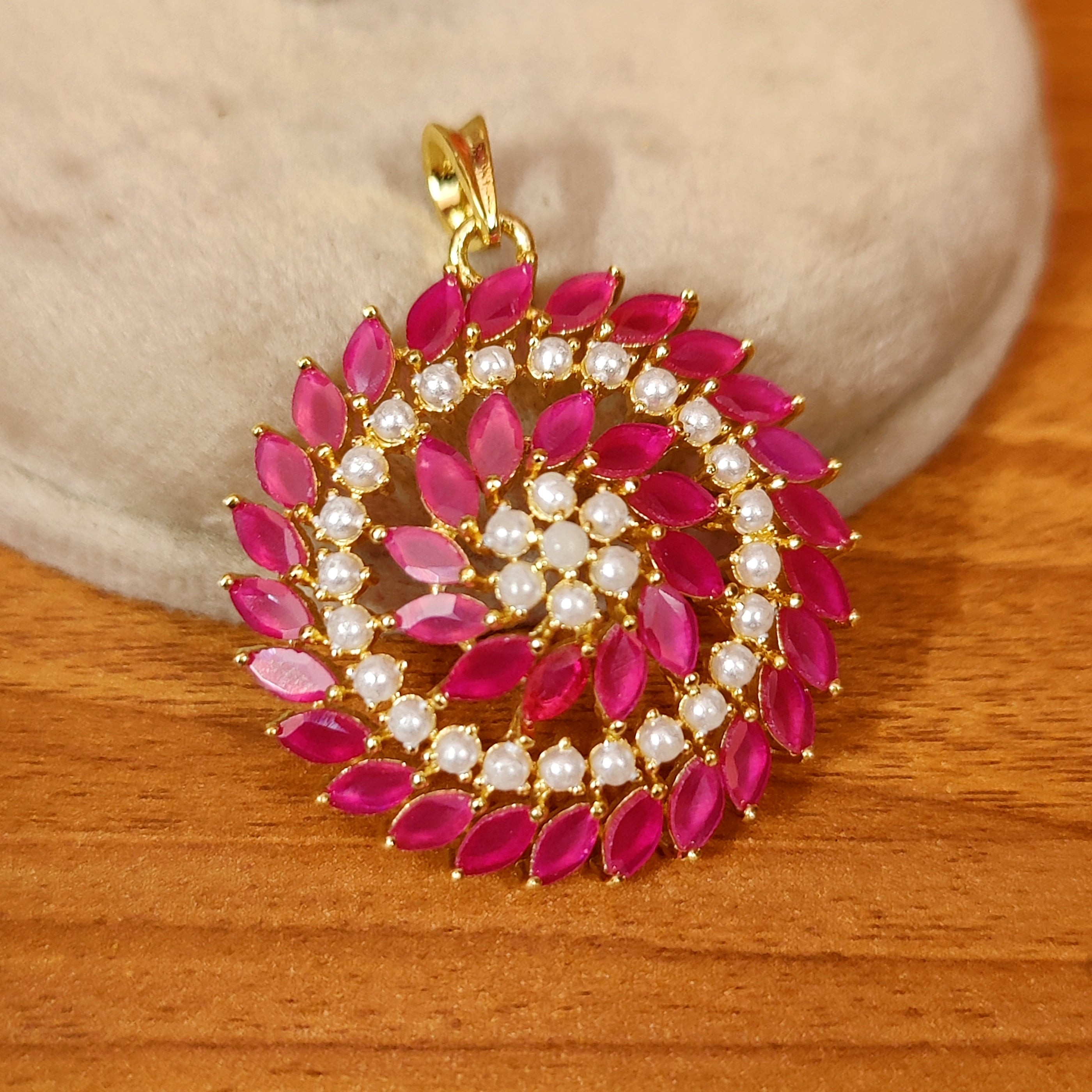 Indulge in the luxurious beauty of this stunning RUBY & EMERALD CZ STUDDED PENDANT SET. The radiant ruby, emerald & pearl stones, delicately encased in 18kt gold plated micron setting, exude elegance and refinement. Its light weight and fine craftsmanship make it comfortable to wear for any occasion. Experience the vibrant, multi-colored sparkle and elevate your style today!