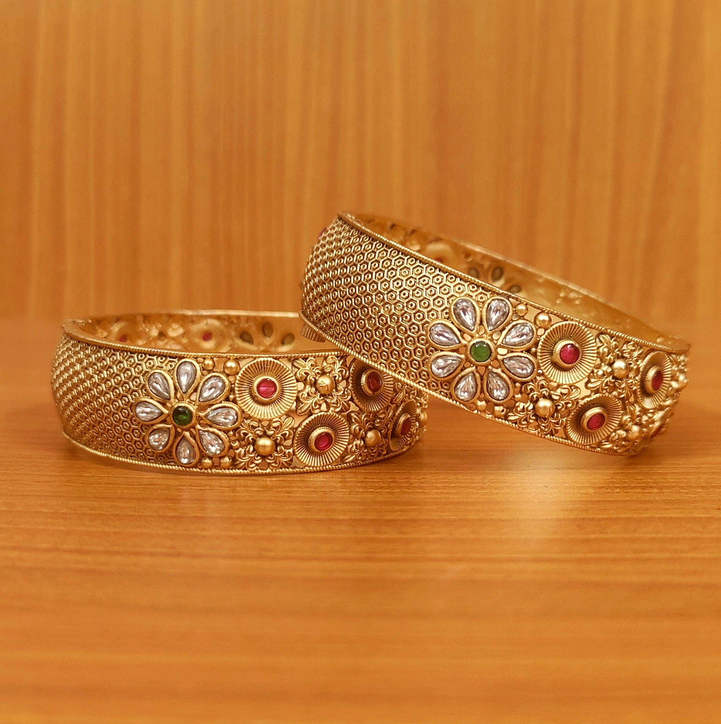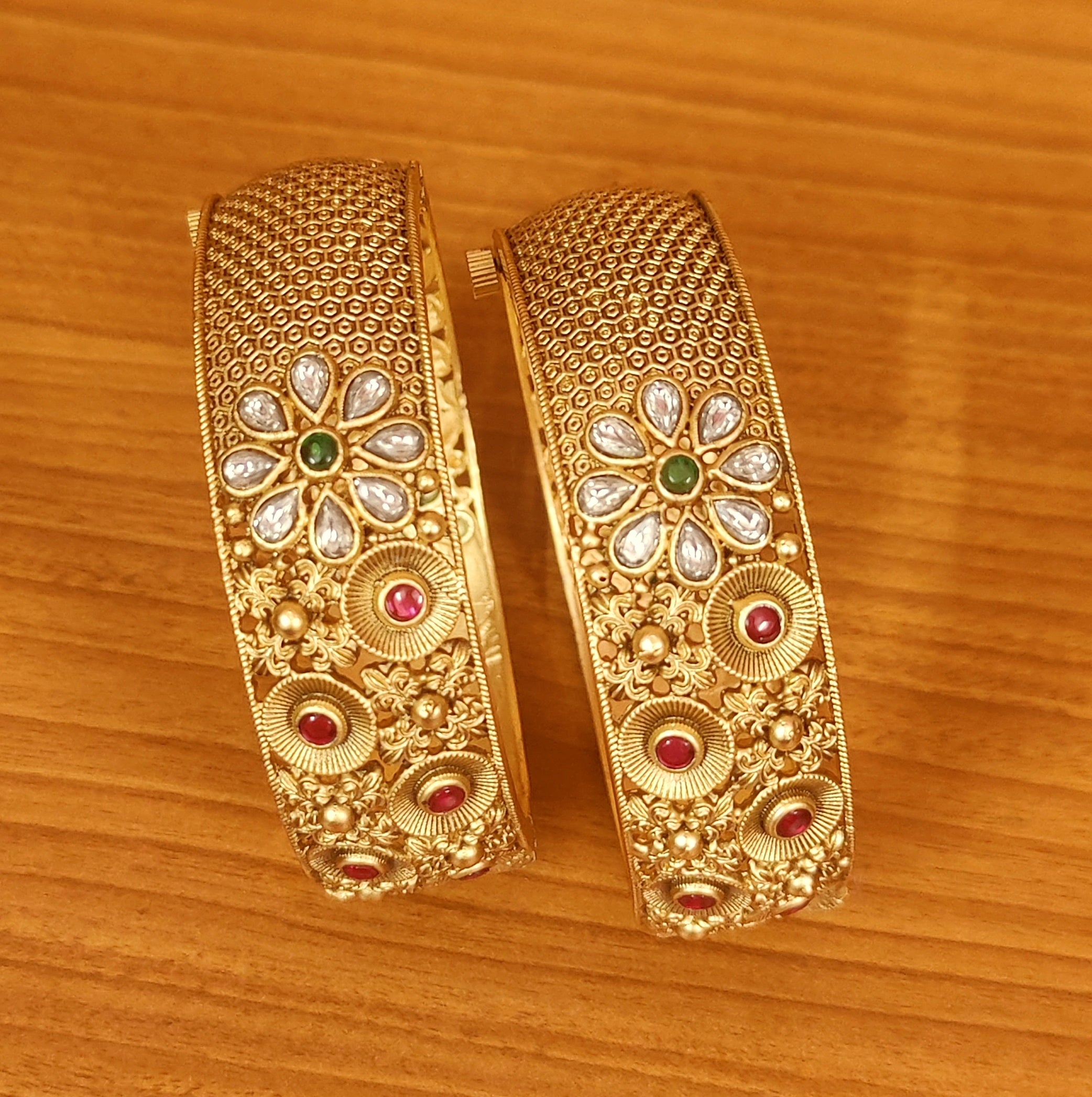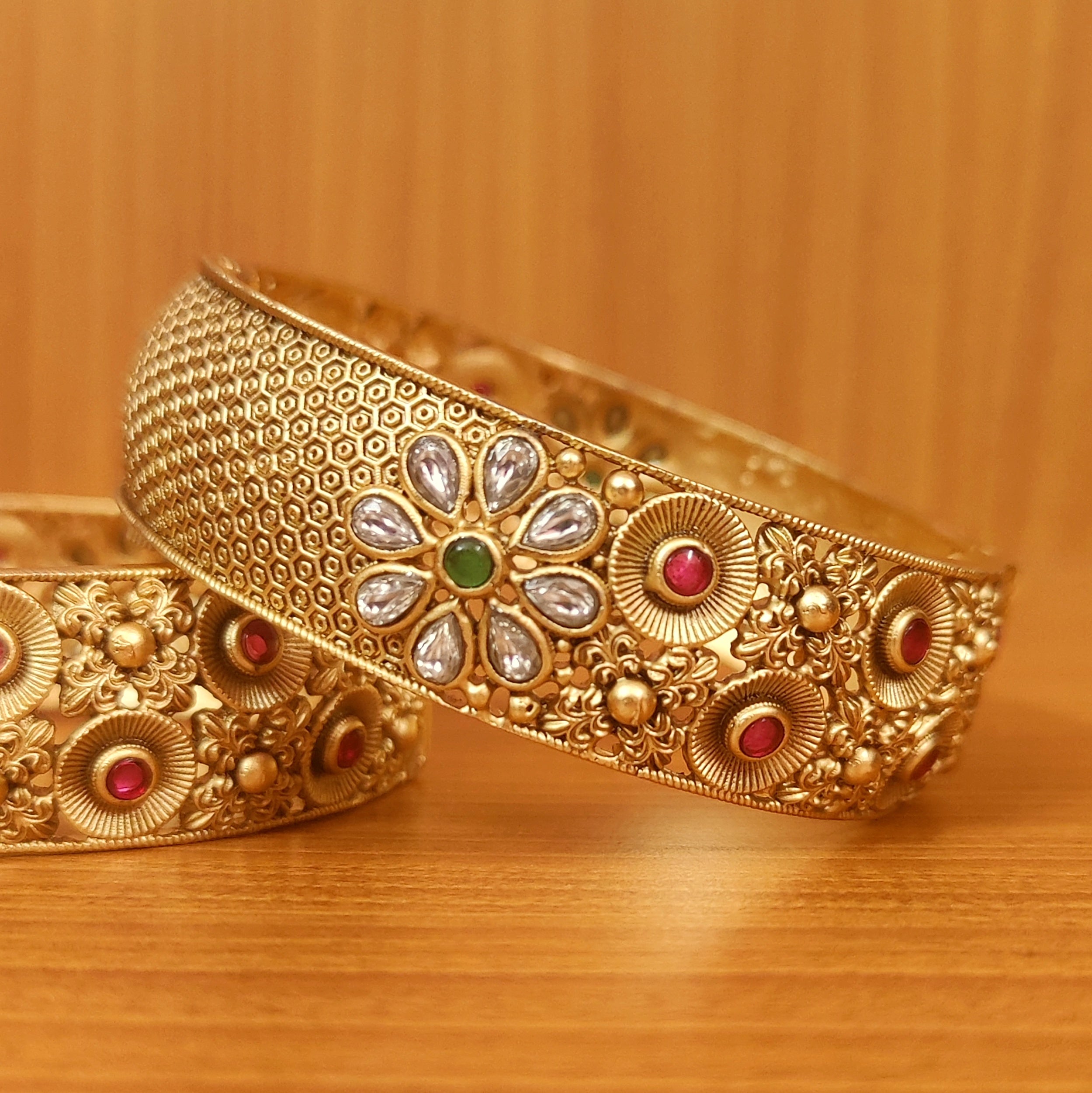 These beautiful matt gold bangles are handcrafted in copper alloy with imitation red & green colour kempu stones & kundan polki stones with intricate small gold details as seen in real gold bangles. These bangles are coated with 22 kt gold rajwadi plating that gives a real look to the design and these openable bangles comes with a set of 2 bangles.