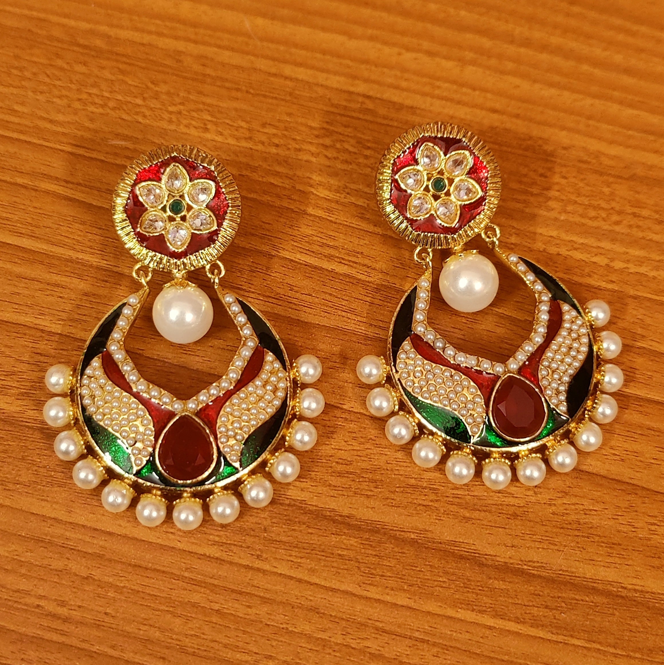 These meenakari pearl chandbali earrings are handcrafted in copper alloy with imitation pearls & polki stones of fine quality. These artistic yet modern earrings are plated with fine nickle free antique gold rhodium to avoid any allergies to the skin.