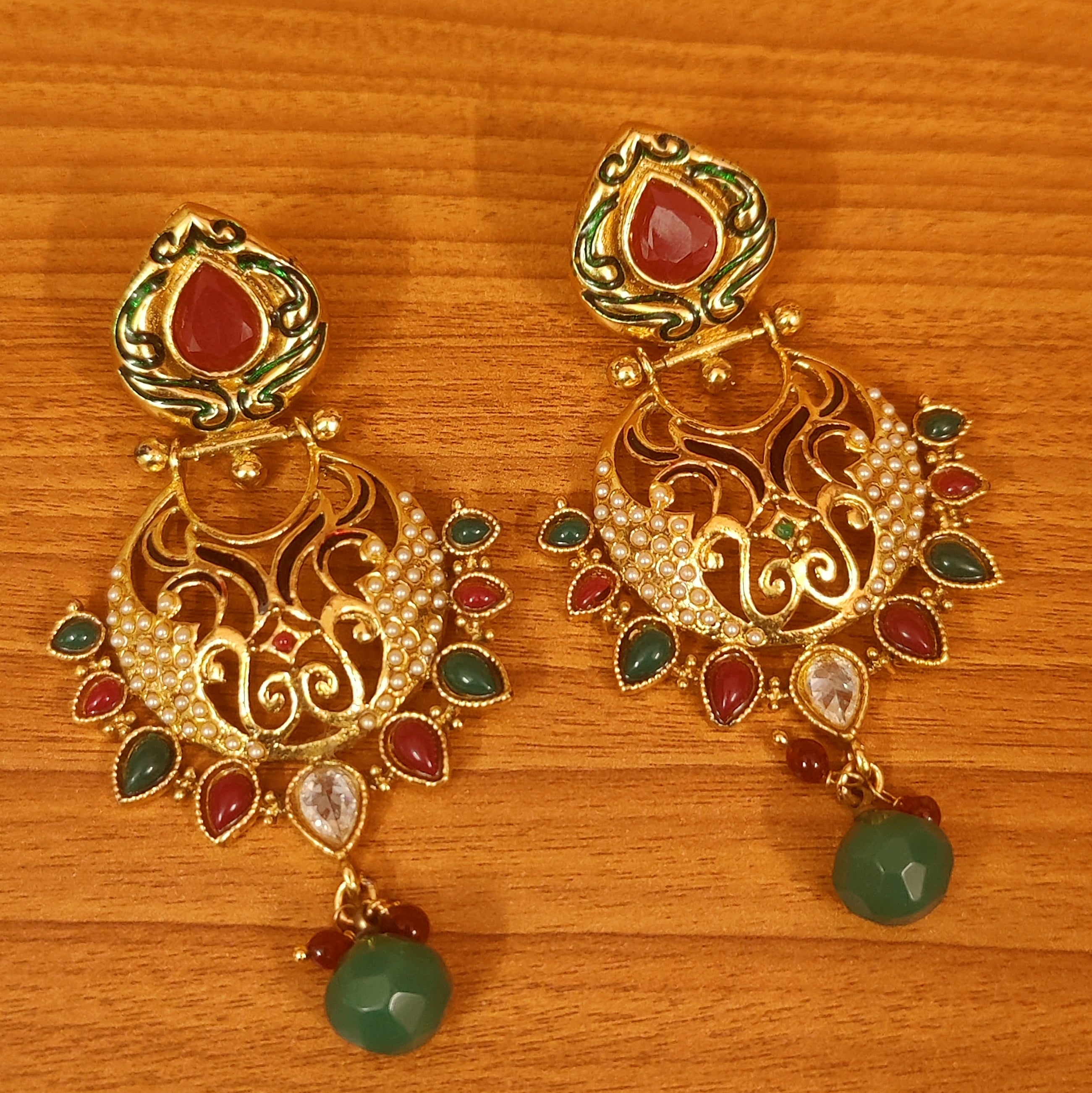These meenakari gold look earrings are handcrafted in copper alloy with imitation multicolour stones and pearls of very fine quality. These party wear gold look earrings are plated with 18kt antique gold plating which gives the design a real gold look , the earrings are light in weight and are perfect for occasional wear.