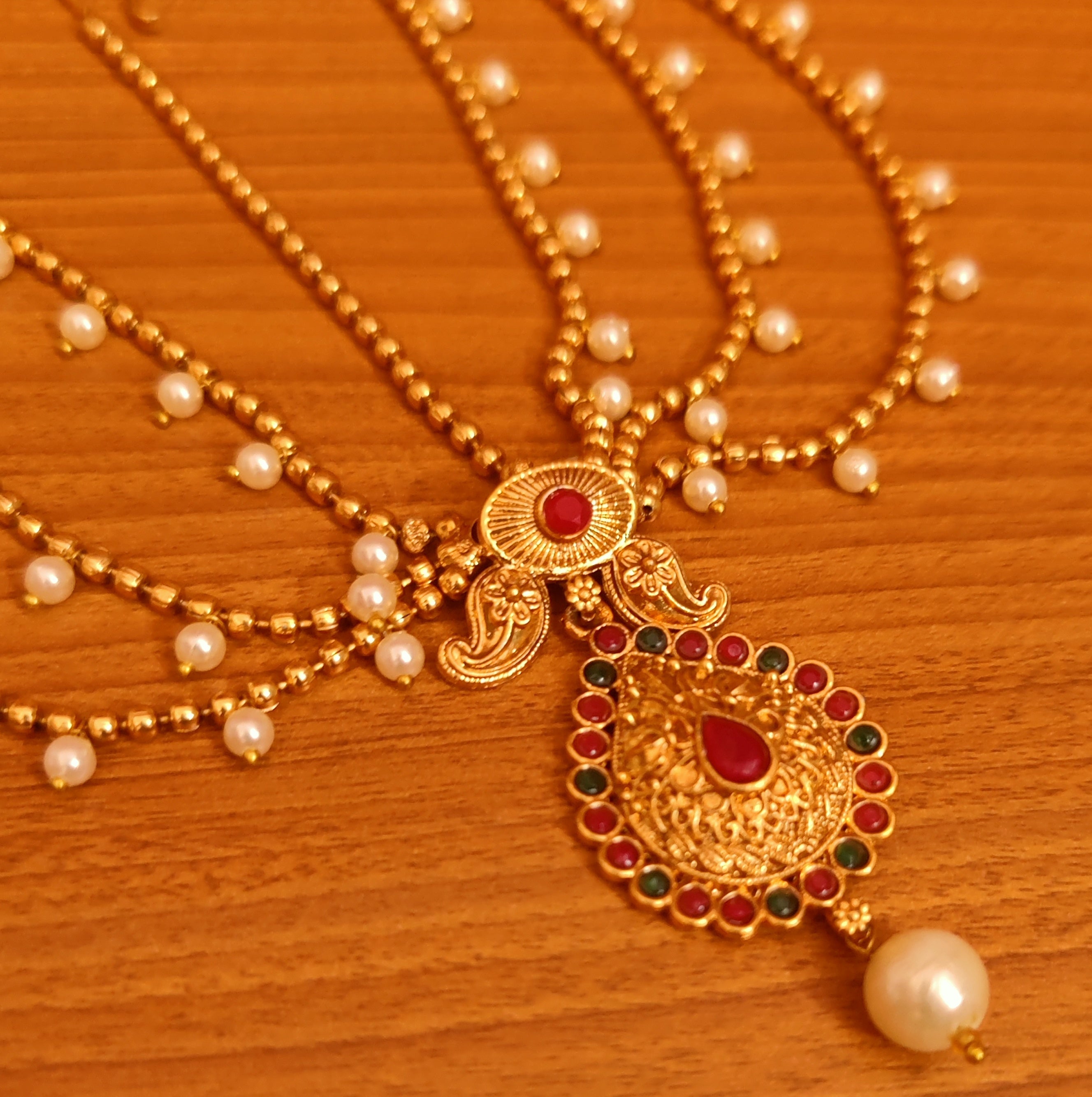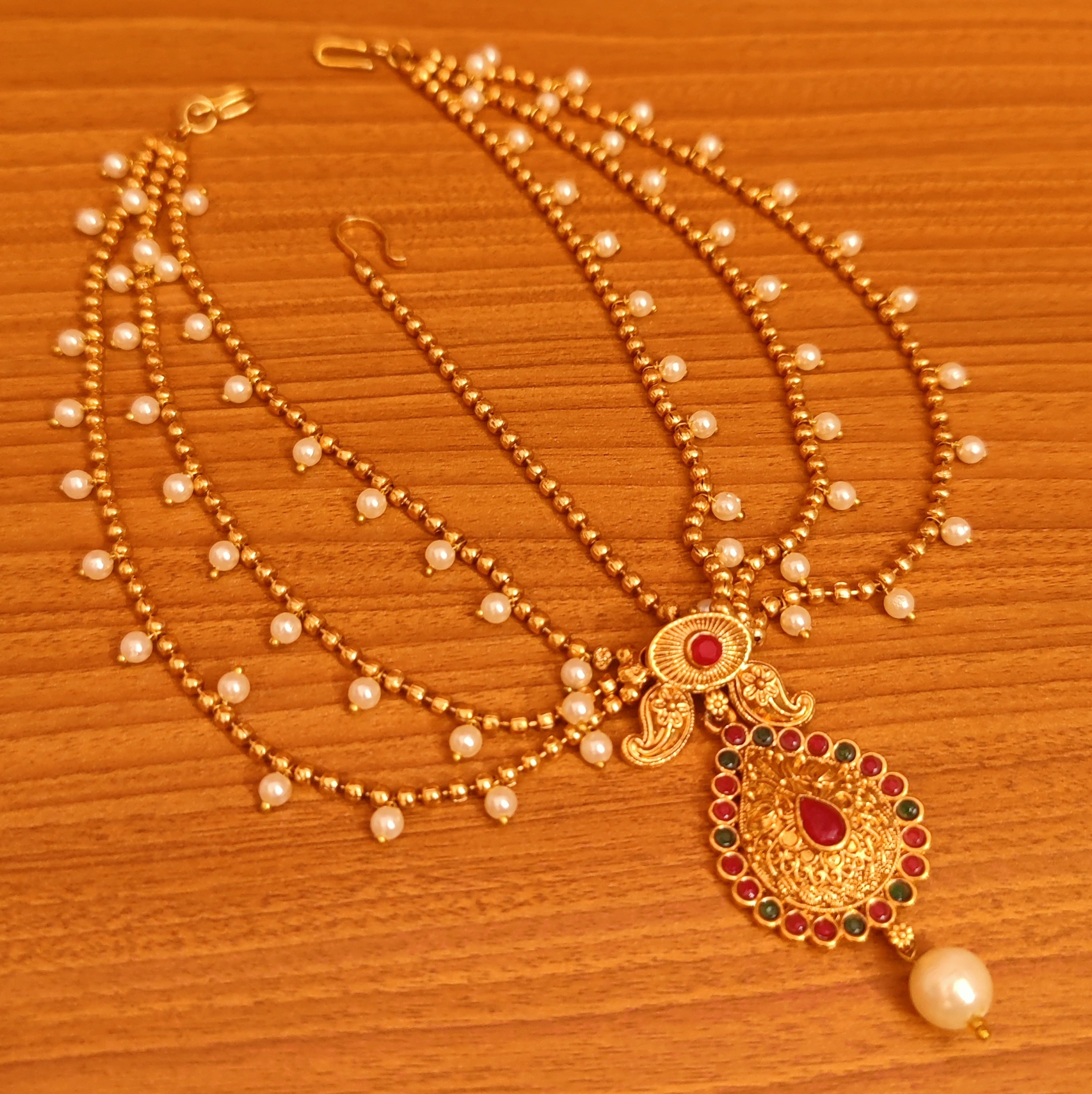 This beautiful mathapatti is handcrafted in copper alloy with imitation red & green colour stone and pearls of very fine quality . this maang tikka is coated with 18 kt gold polish which give it a real look . an absolutely stunning piece to own and is very light in weight.