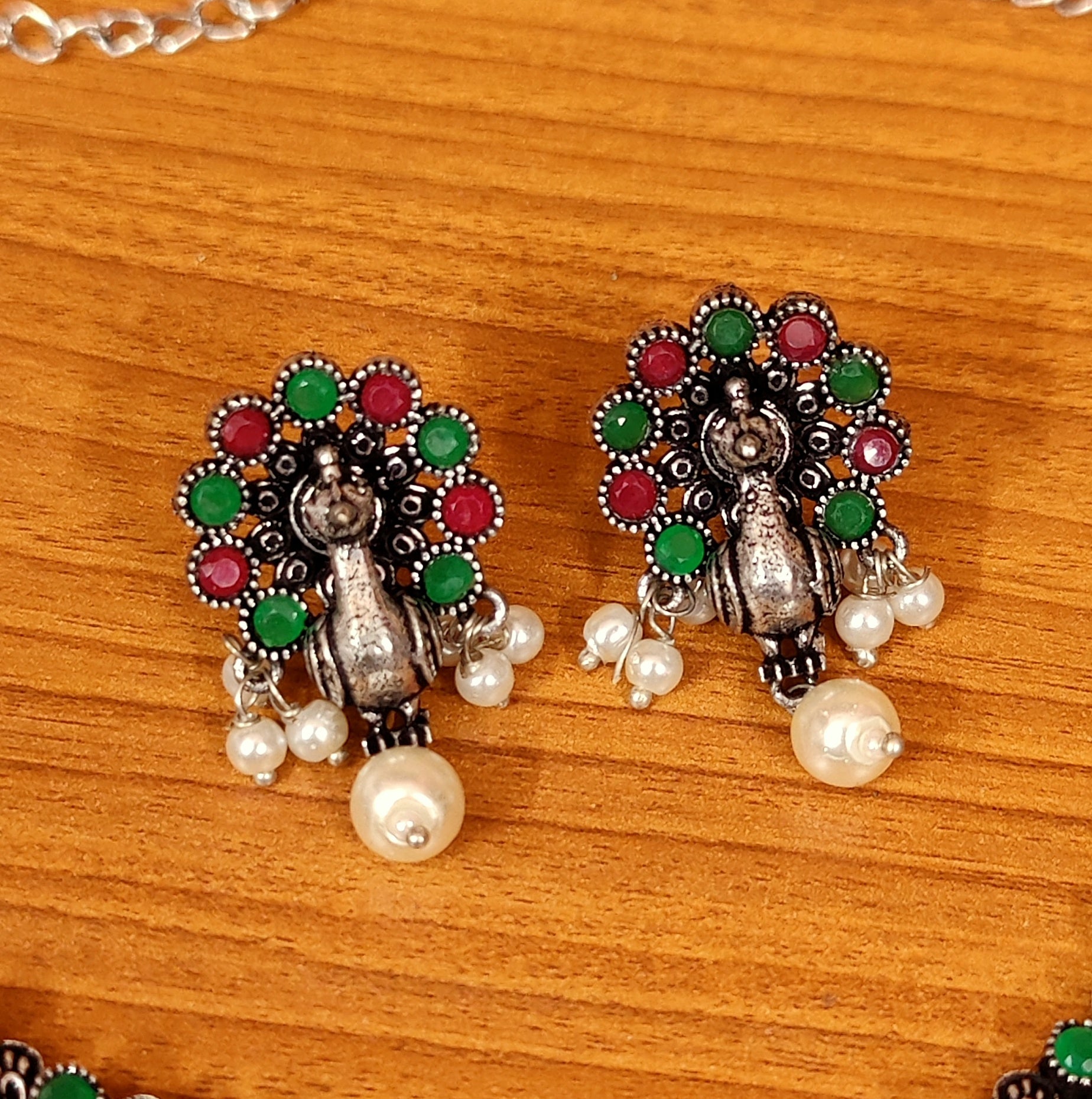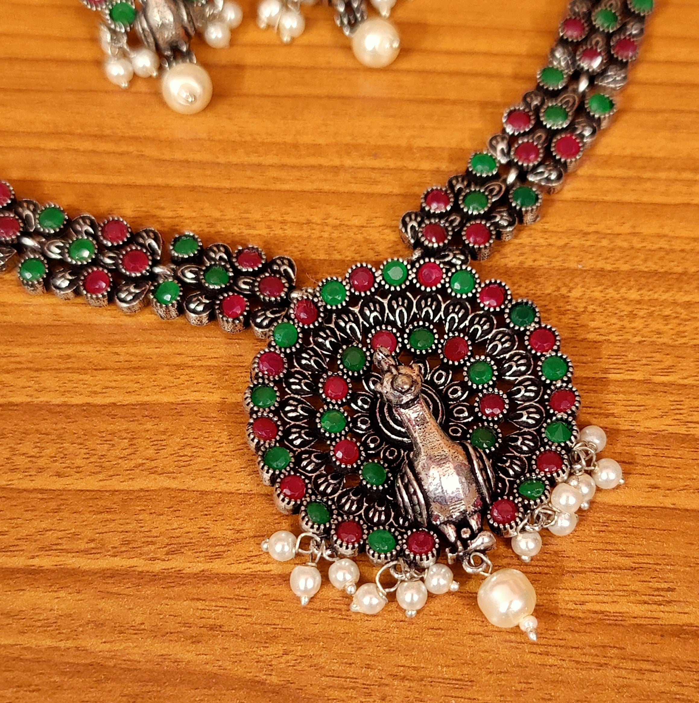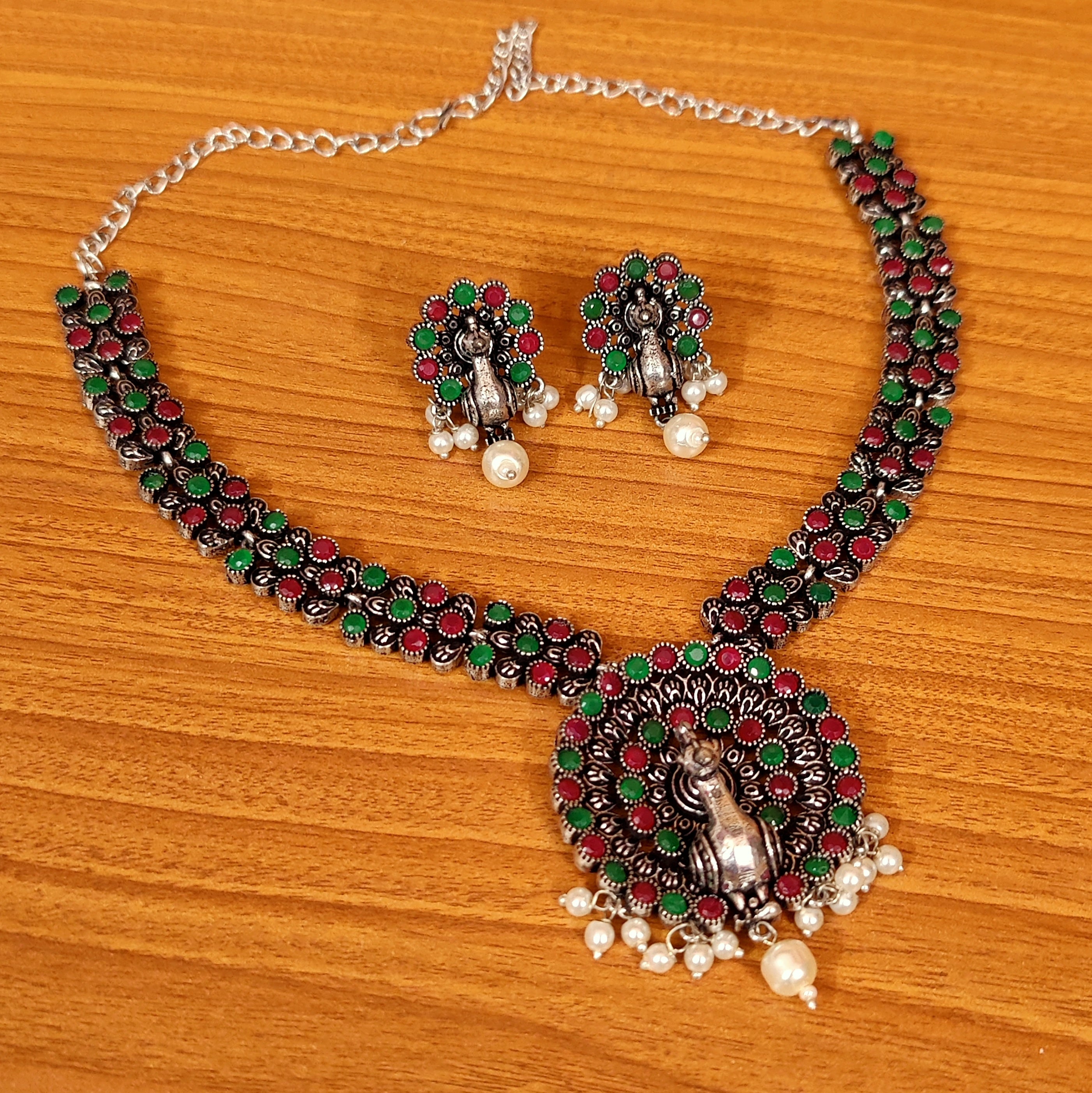 MULTICOLOUR PEACOCK OXIDISED SILVER NECKLACE SET