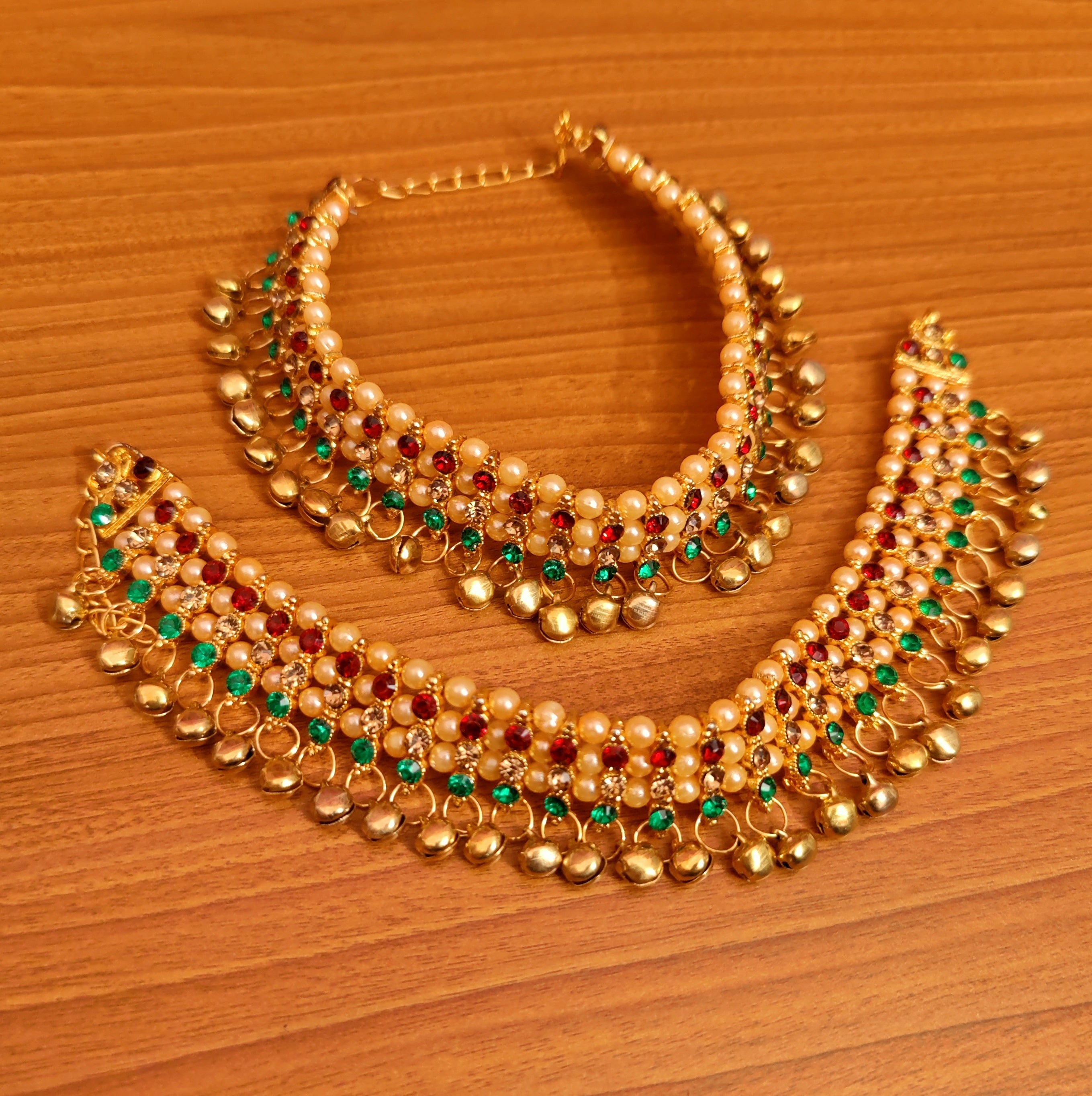 This beautiful anklets is handcrafted in copper alloy with imitation red & green colour zircon stone & creame pearls of very fine quality . this anklets is coated with 18 Kt gold polish which give them a unique look . an absolutely stunning piece to own and are very light in weight.