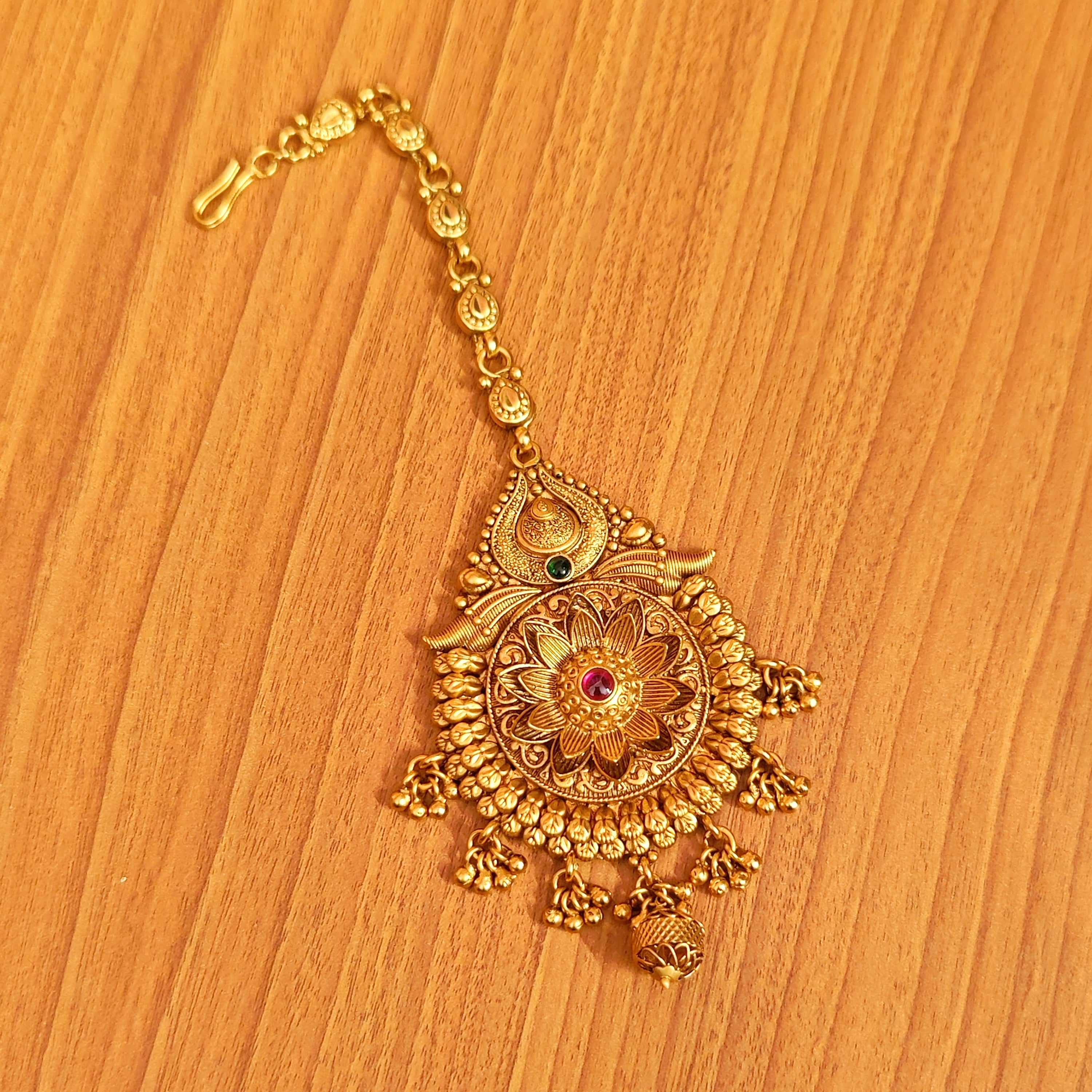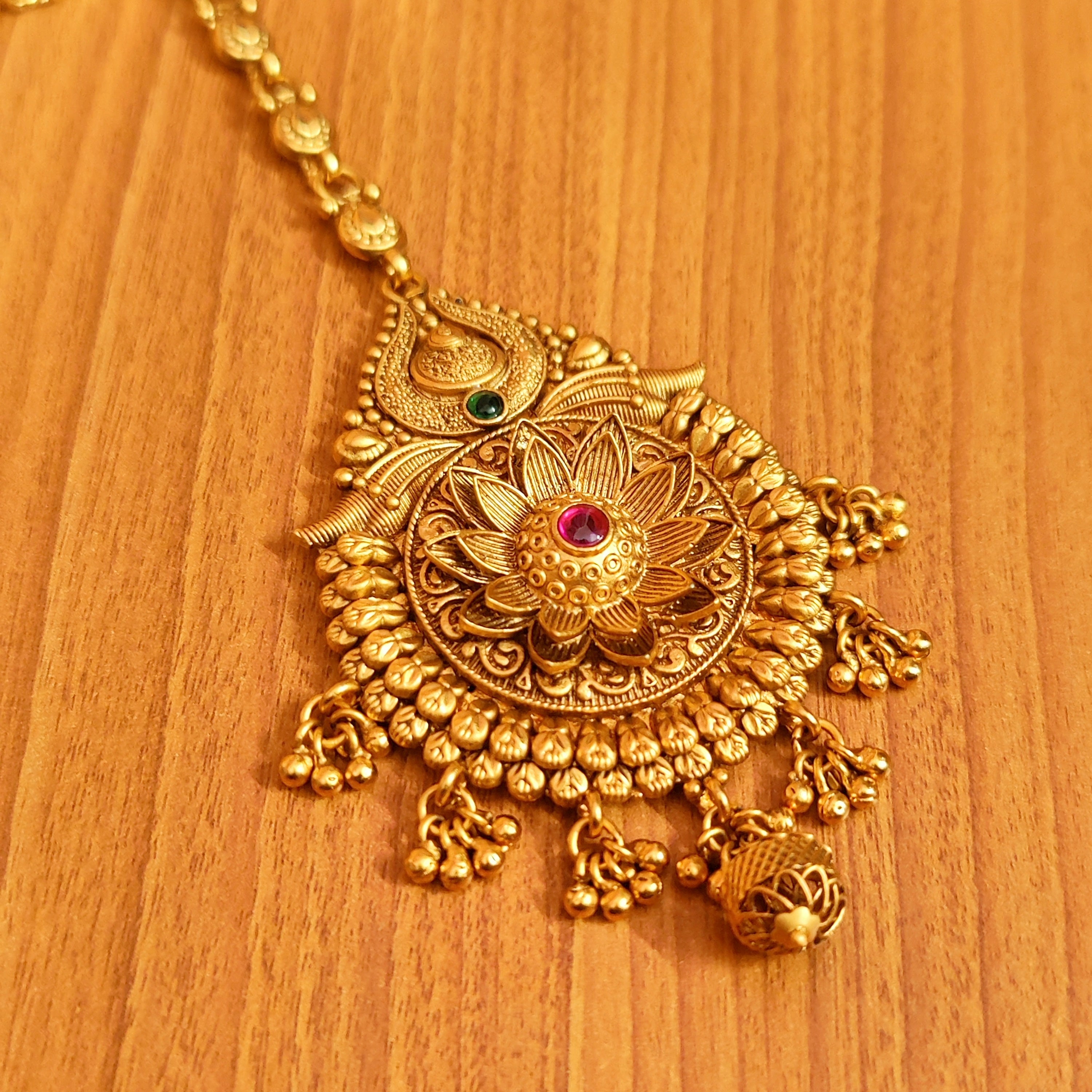 This beautiful bridal look mathapatti is handcrafted in copper alloy with minute & intricate gold work of very fine quality . This mathapatti is coated with 22 Kt matt gold plating which gives a very real look to the design . An absolutely gorgeous piece and is very light in weight.