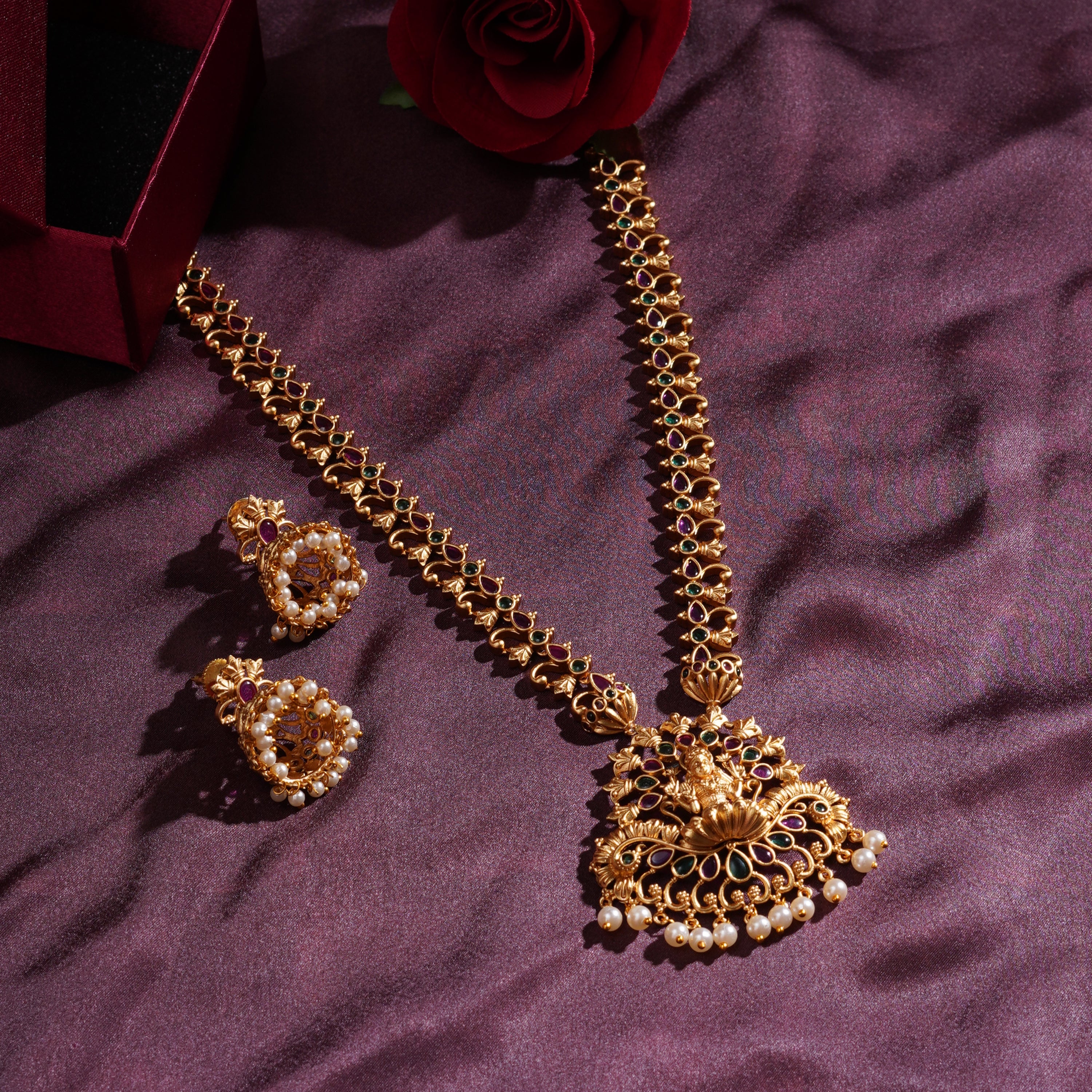Unlock the timeless beauty of our Gold Plated Antique Temple Look Necklace Set! With 22kt gold plating and fine intricate work, this light weight set exudes an ethnic charm perfect for weddings. Elevate any outfit with its temple inspired design and make a statement that will last a lifetime!