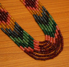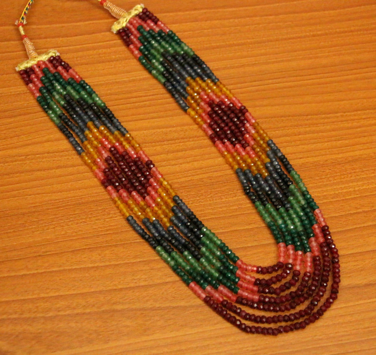 This semi precious 7 line necklace is handcrafted in imitation green, yellow , blue , red and pink quartz placed in a manner to make a barfi pattern , the necklace is very light in weight with an adjustable thread attached at the back . The necklace gives you the same exact look of the real precious necklace.