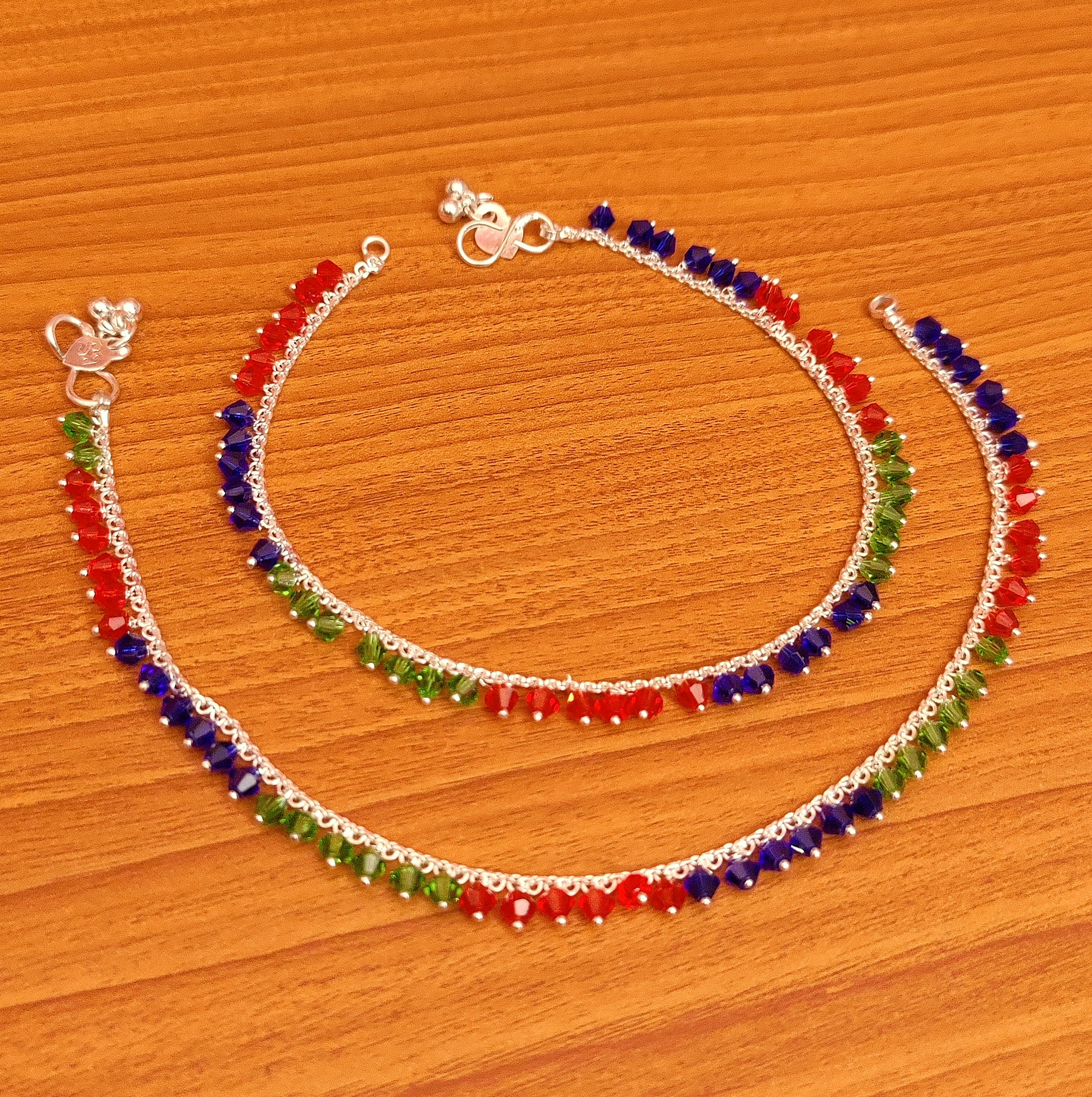 These anklets are handcrafted in copper alloy with imitation multi colour swarovski crystals beads of very fine quality , these anklets are very light in weight and platedin silver rhodium .