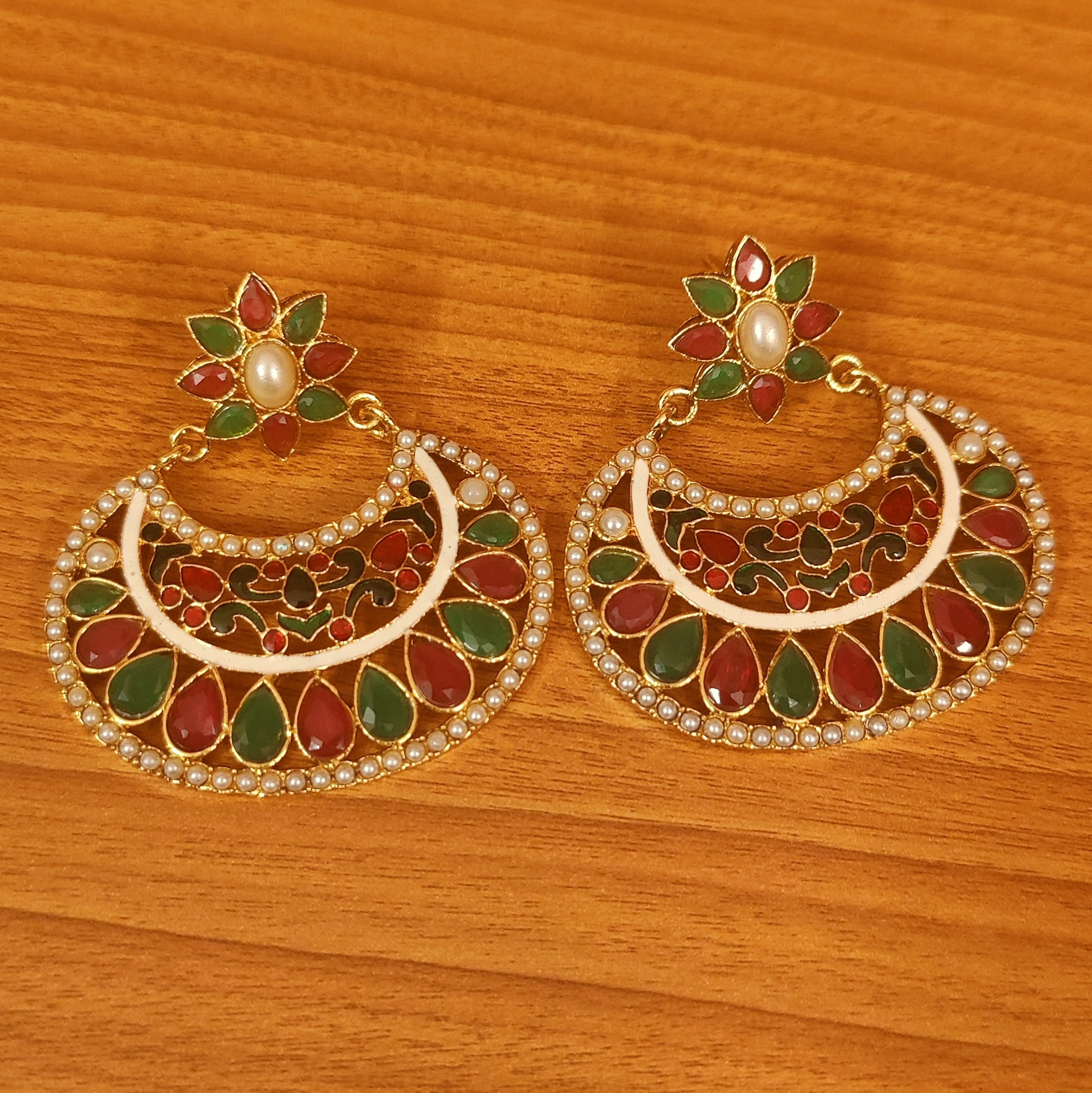 These meenakari chaandbaali earrings are handcrafted in copper alloy with ruby and emerald colour stones & pearls of fine quality. These artistic yet modern earrings are plated with fine nickle free antique gold rhodium to avoid any allergies to the skin.