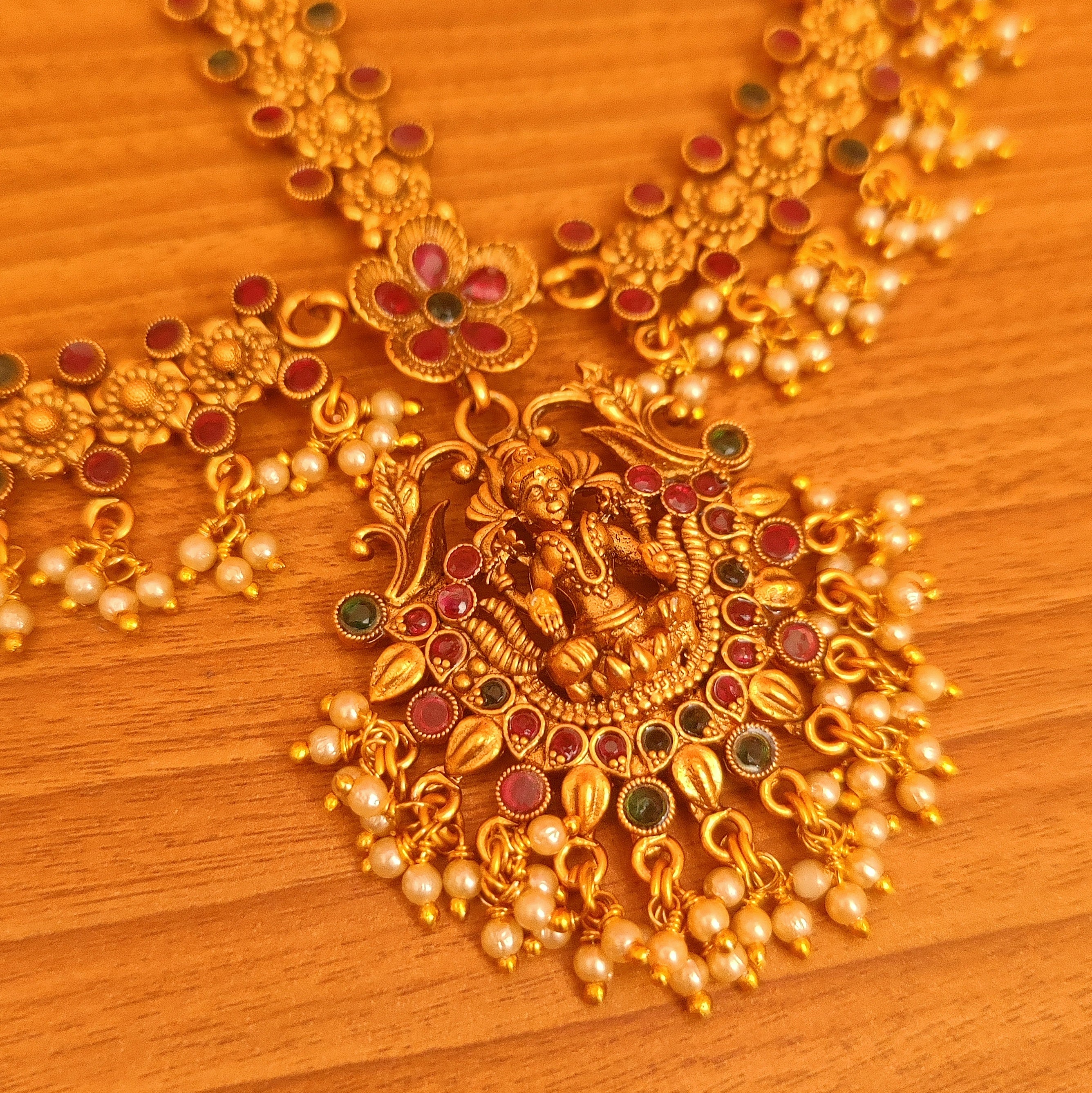 This goddess laxmi pattern mathapatti is handcrafted in copper alloy with imitation red & green colour stone and semi precious pearls work of very fine quality . this maang tikka is coated with 18 kt gold polish which give them a unique look . an absolutely stunning piece to own and are very light in weight.