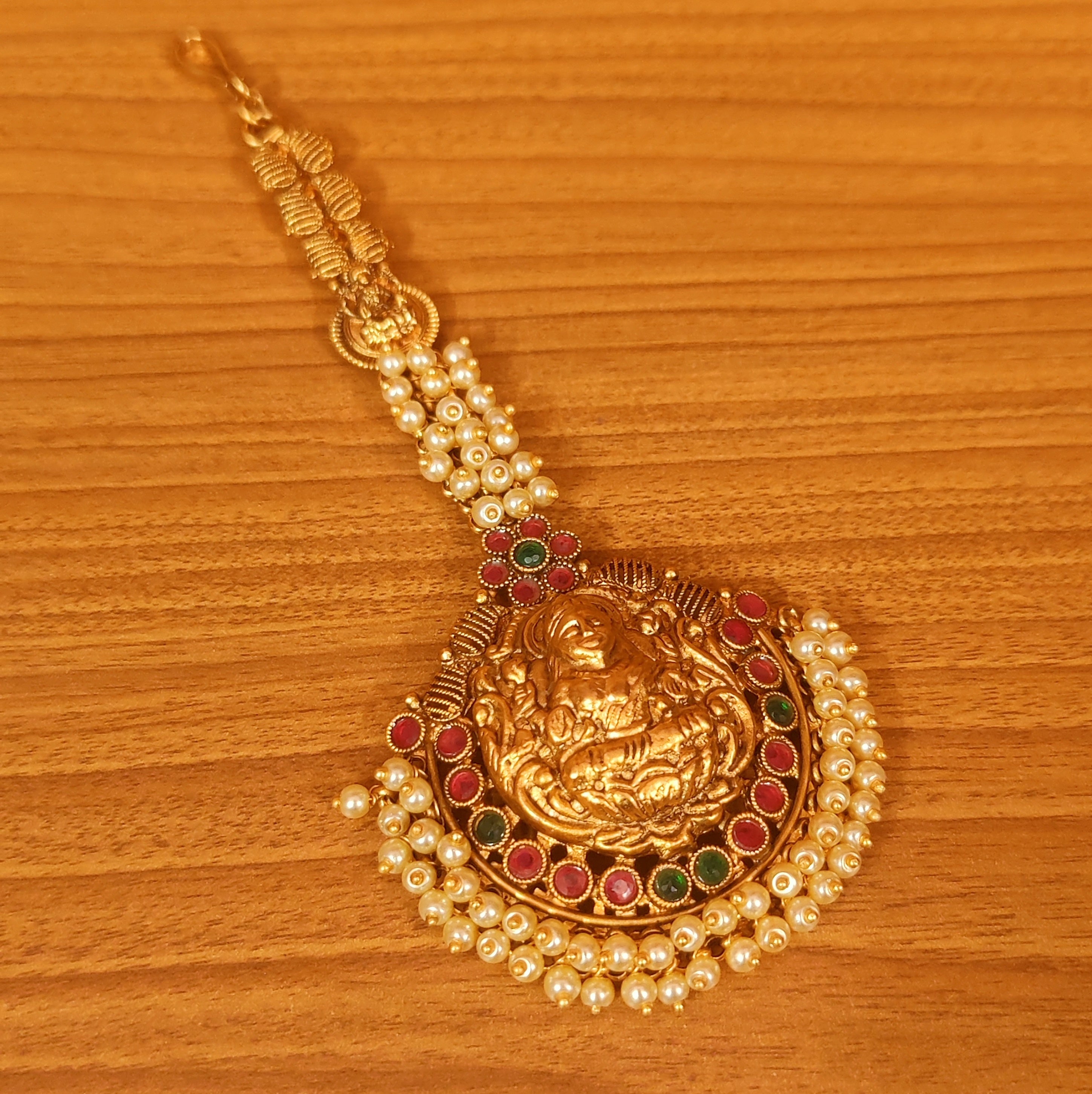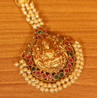 This matt gold look maang tikka is handcrafted in copper alloy with imitation red & green colour stones & pearls of very fine quality. This gorgeous maang tikka is plated with 22kt fine nickle free matt gold rhodium that gives a real gold look to the design.