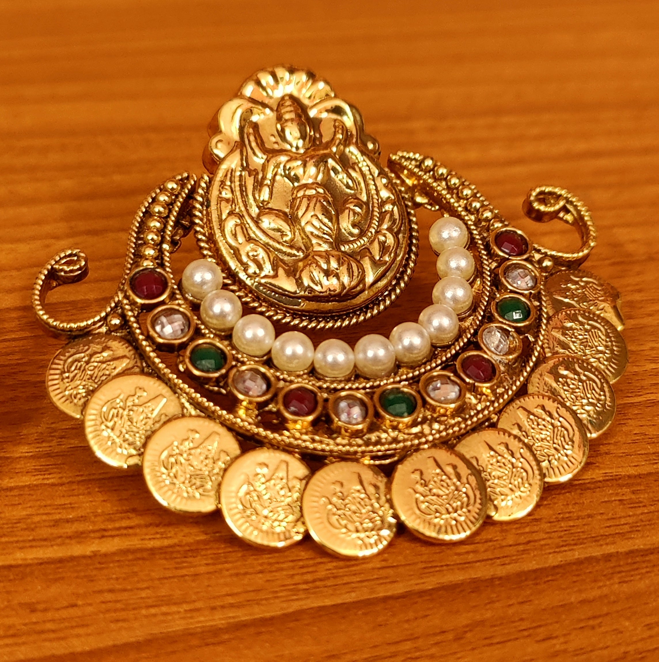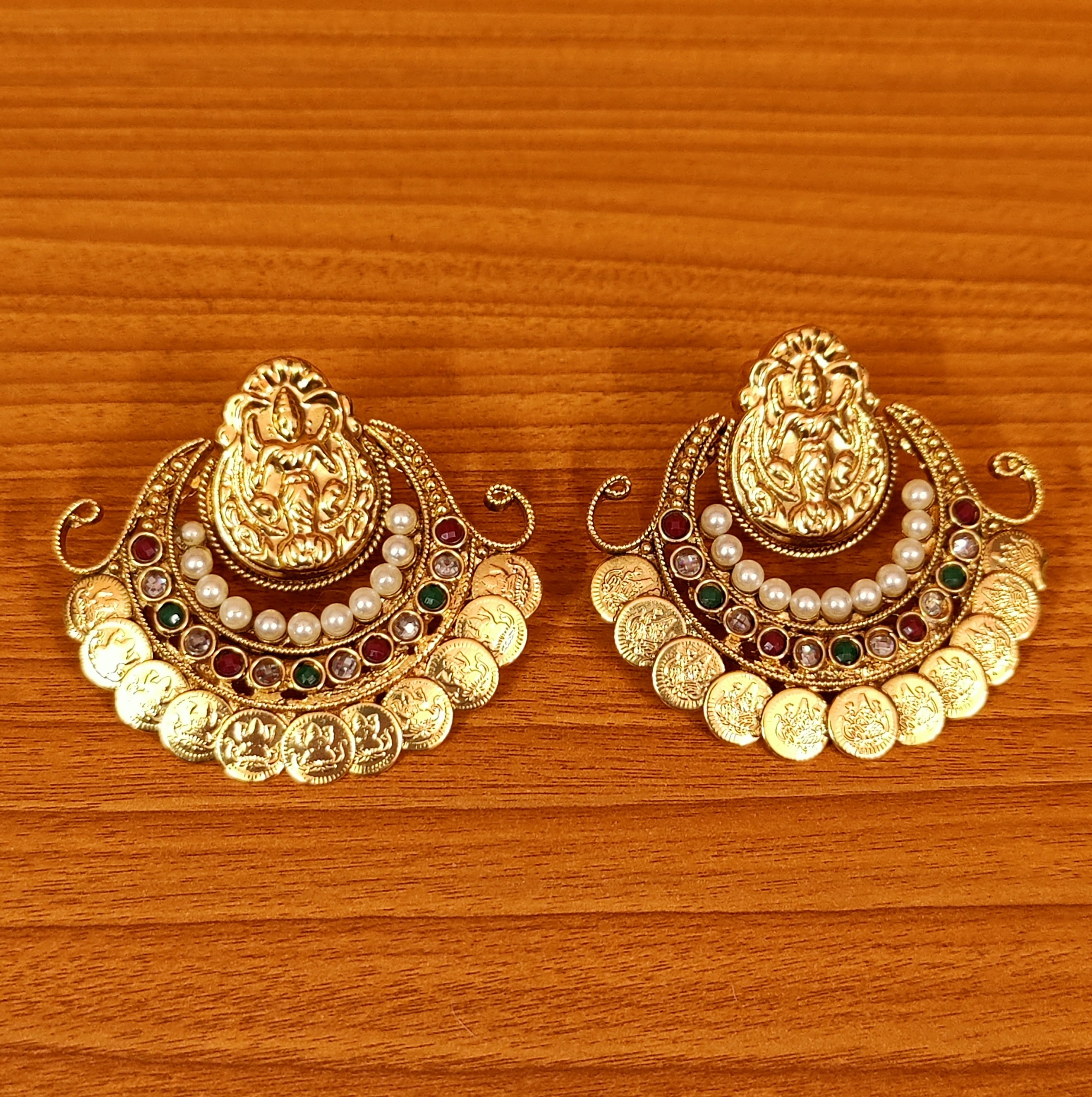 These multicolour chandbali earrings are handcrafted in copper alloy with imitation pearls & temple look coin polki work of very fine quality. These party wear chandbali's are plated with real 18kt fine nickel free gold rhodium to avoid any allergies to the skin. These earrings are very light weighed and can be worn with ethnic dresses.