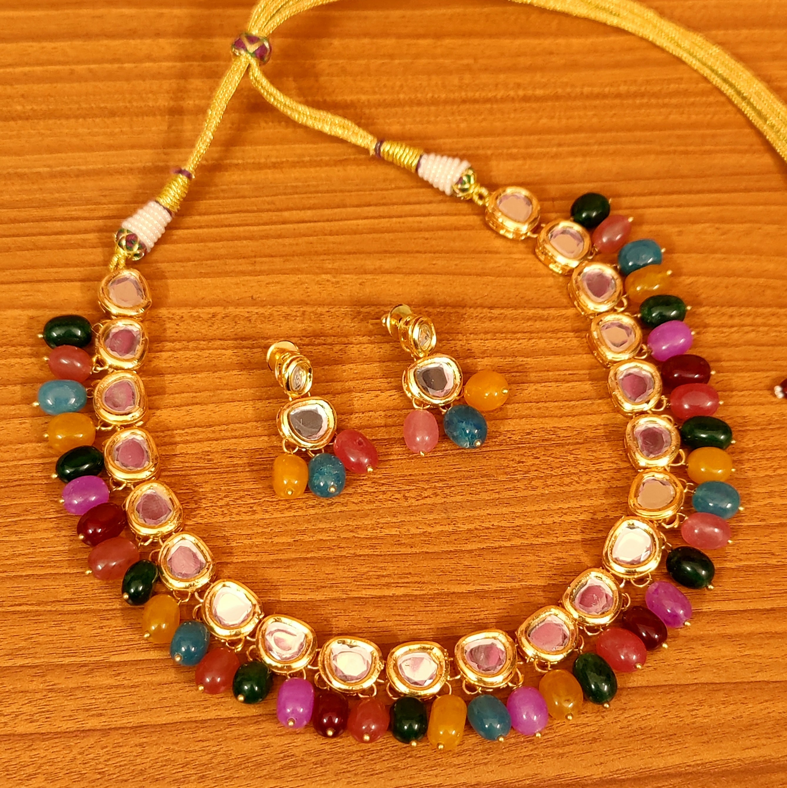 This kundan necklace set is handcrafted in silver & brass alloy with semi precious multicolour onyx stones and uncut kundan polki stones of very fine quality. This gorgeous necklace set is plated with 18kt fine nickle free gold rhodium that gives a unique look to the design. The necklace and the earrings are very light in weight and comes with an adjustable dori.