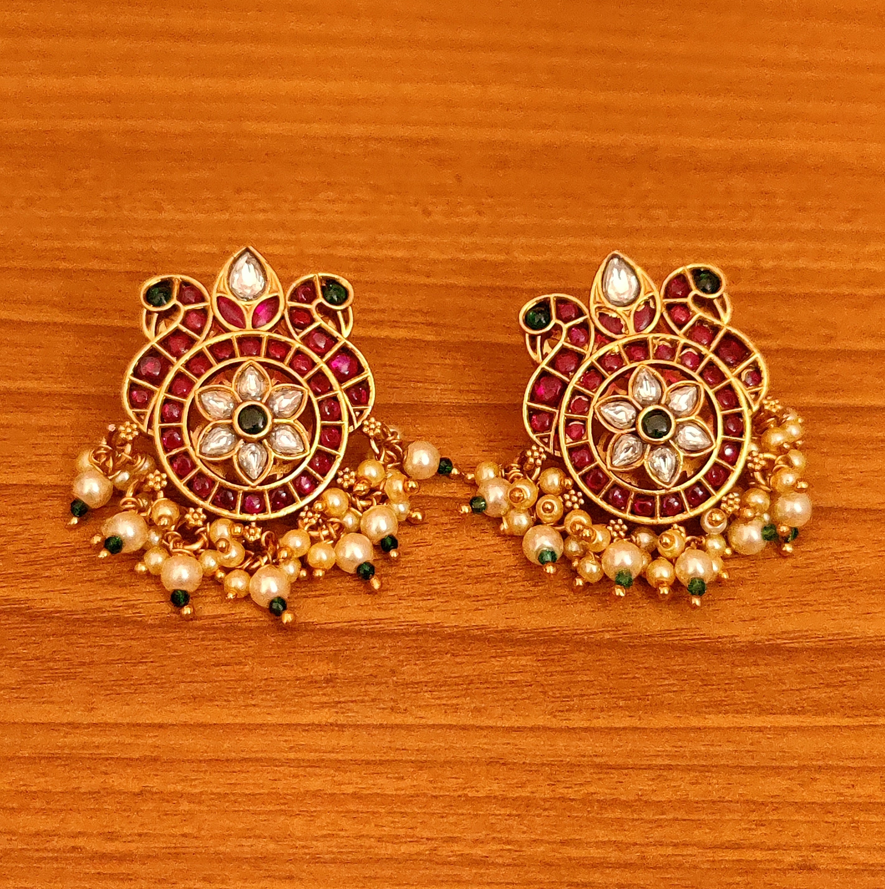 These beautiful matt gold polki earrings are handcrafted in brass alloy with imitation red & green colour stone & semi precious pearls and zircon work of very fine quality. these artistic yet modern earrings are plated with high quality gold rhodium. the earrings are very light in weight.