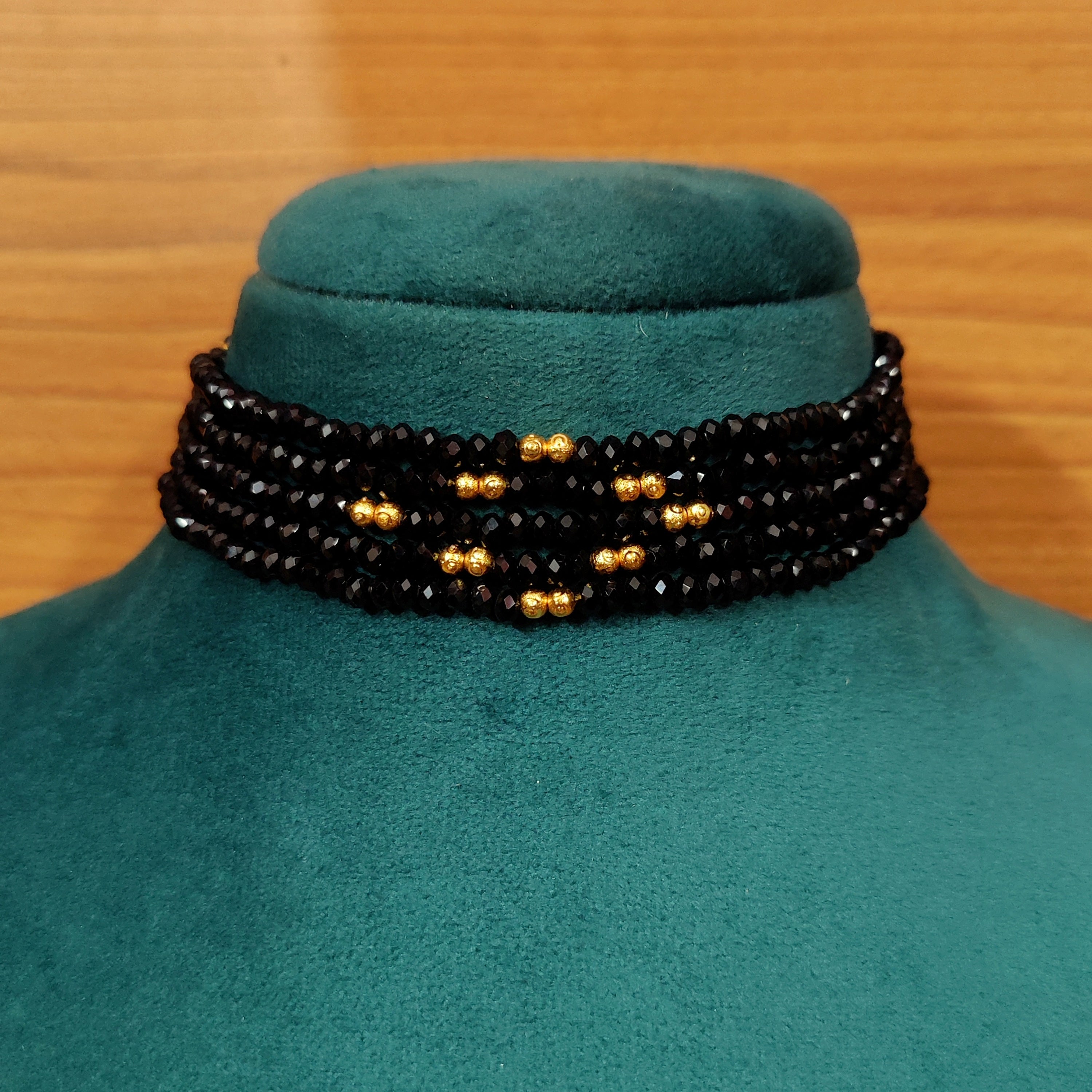 Flaunt your unique sense of style with this exquisite black crystal & gold beads choker necklace set. Crafted with multilayered beads, this luxury piece makes a subtle yet eye-catching statement that makes for a timeless addition to any wardrobe. Perfect for any special occasion.