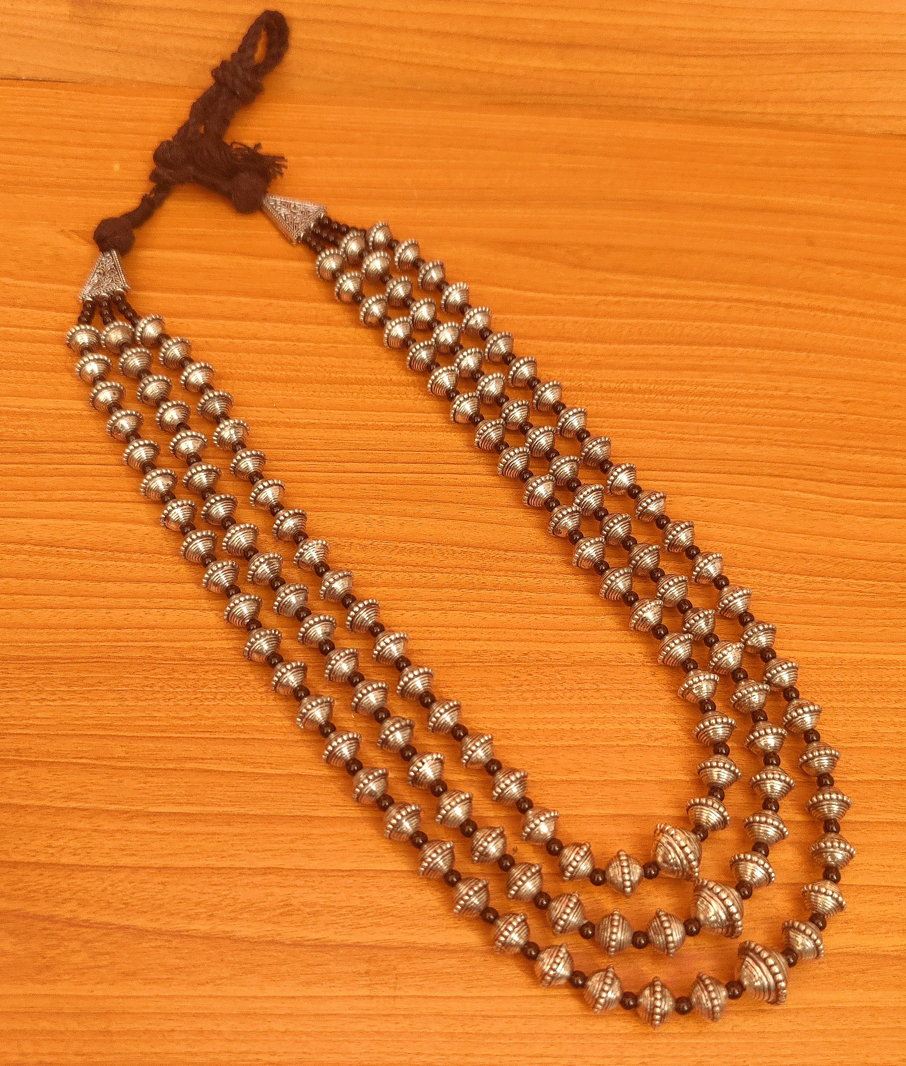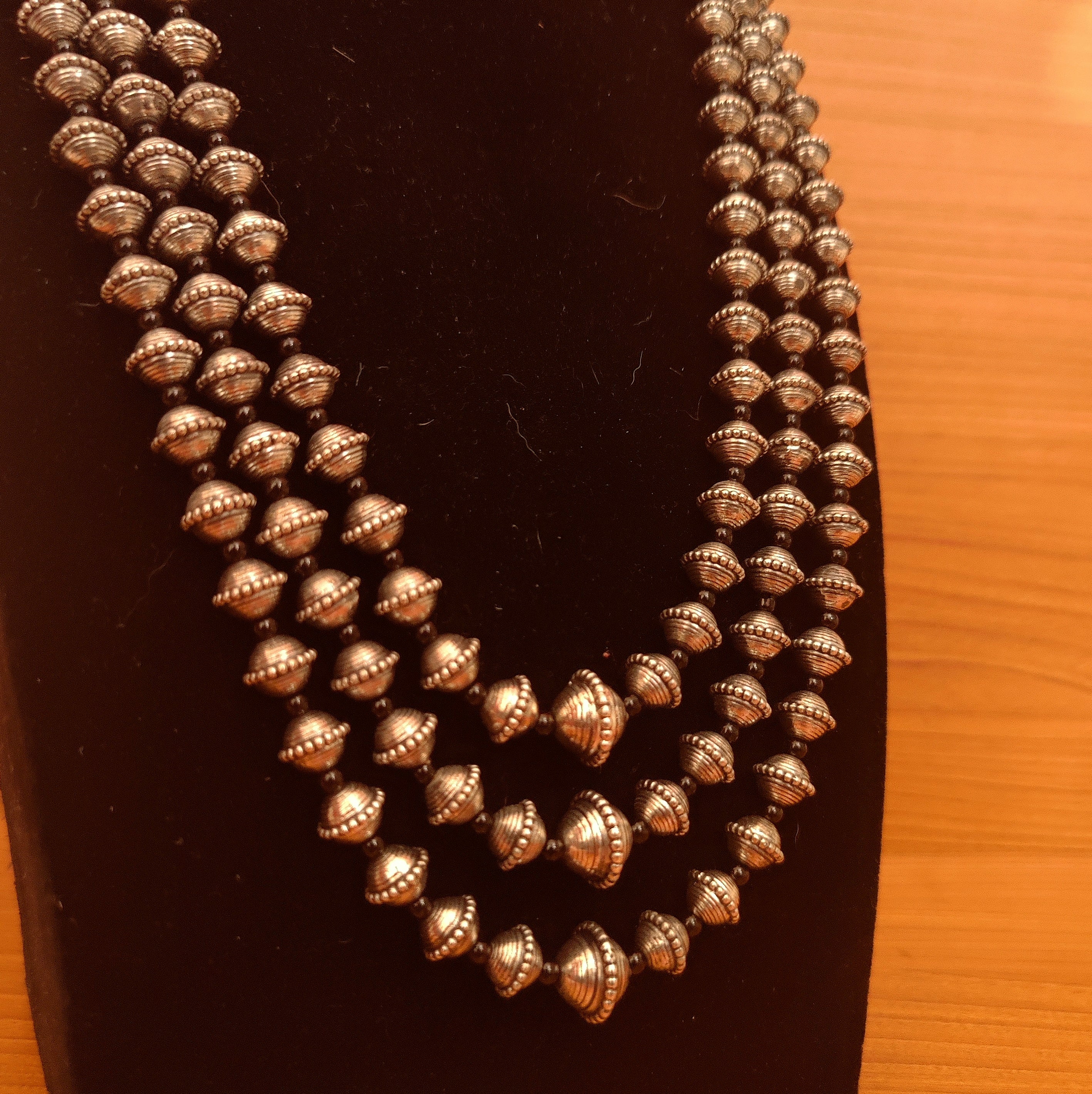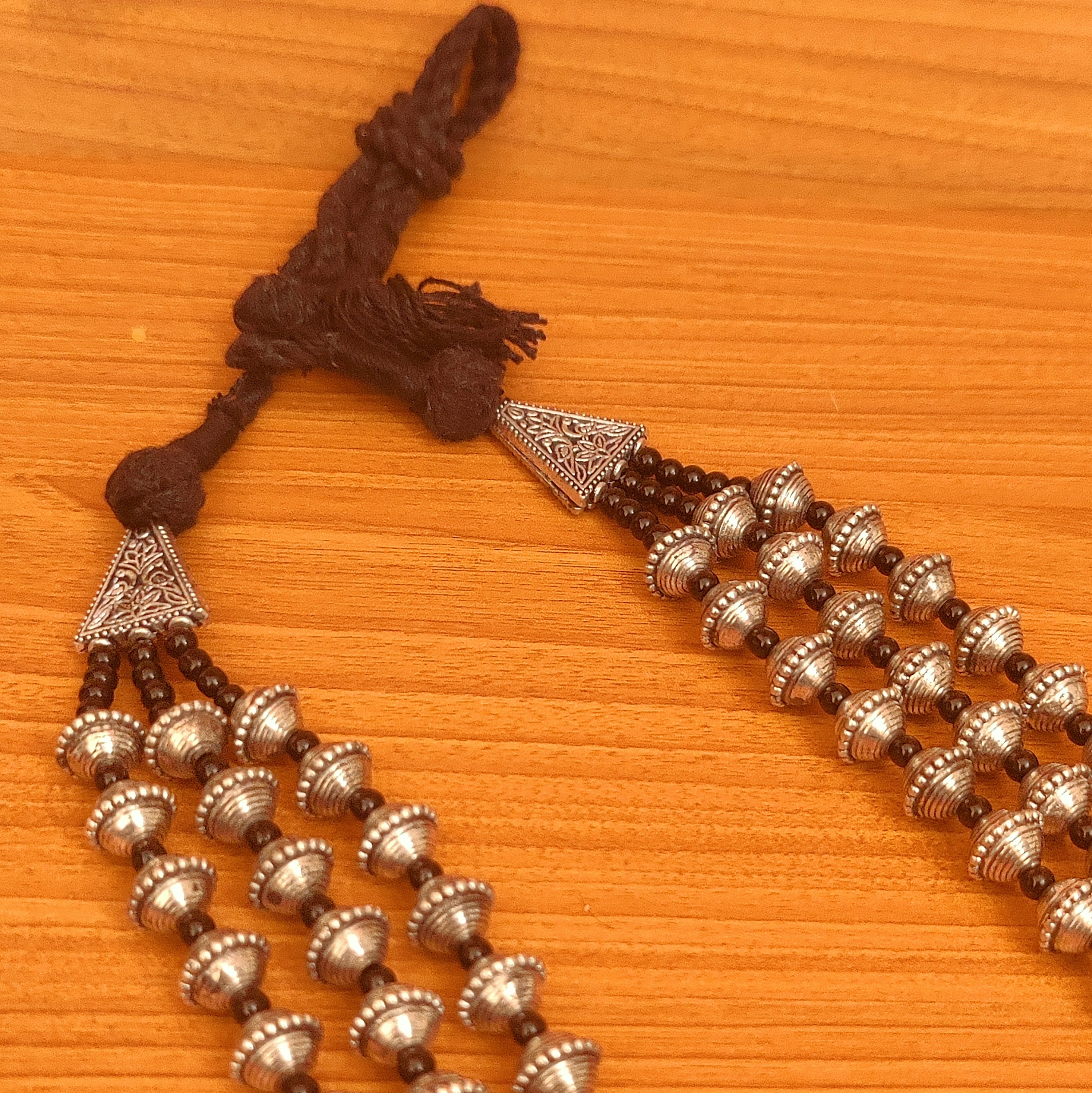 This necklace set is handcrafted in copper alloy with silver lookalike beads beaded with black thread and black beads . The necklace is very light in weight and looks like a real silver beaded necklace . Made in german silver