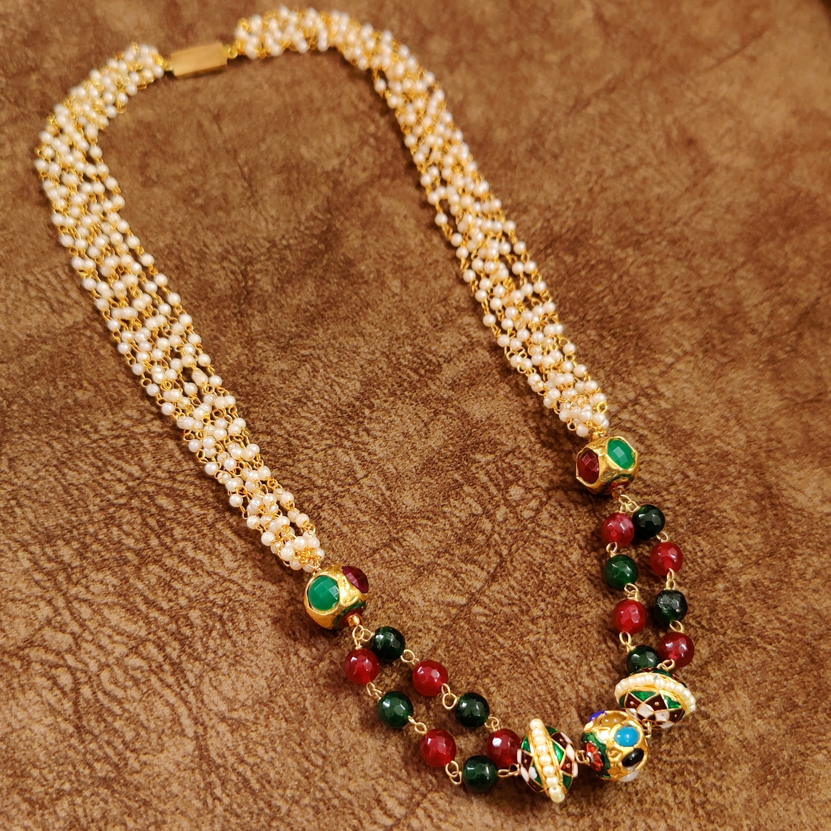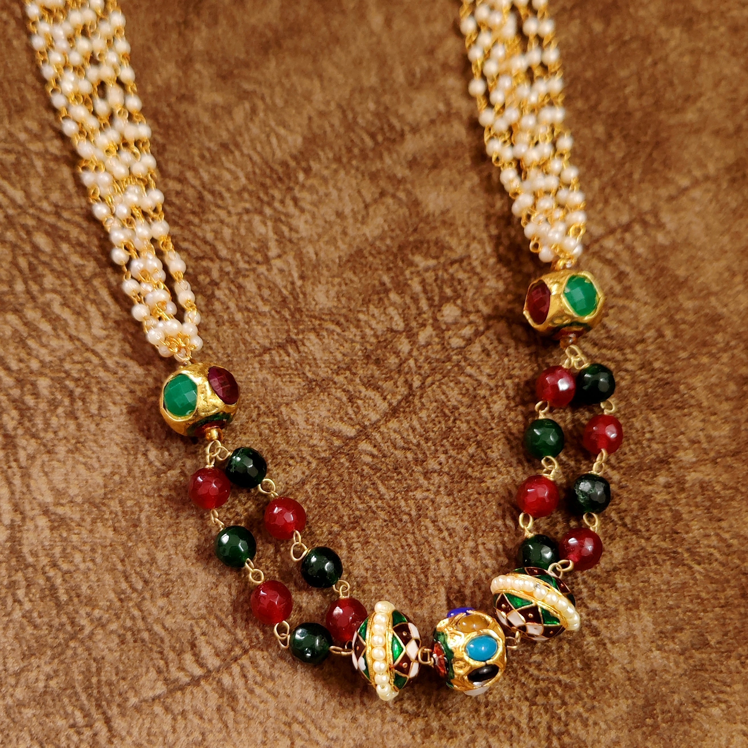 This navratan look necklace is handcrafted in copper alloy with imitation pearls , navratan studded beads, meenakari beads , semi precious red and green quartz of very fine quality , the necklace is very light in weight.