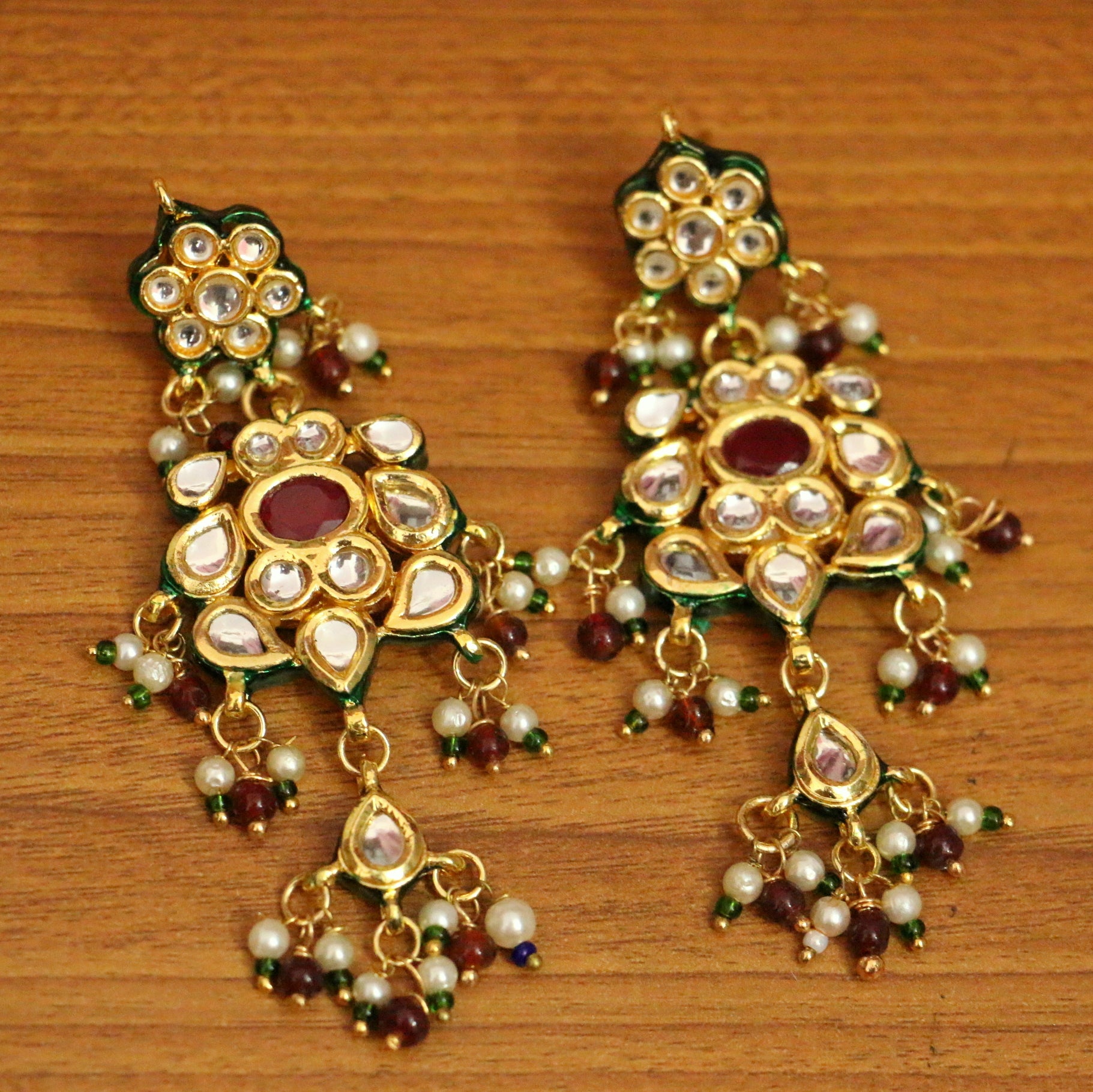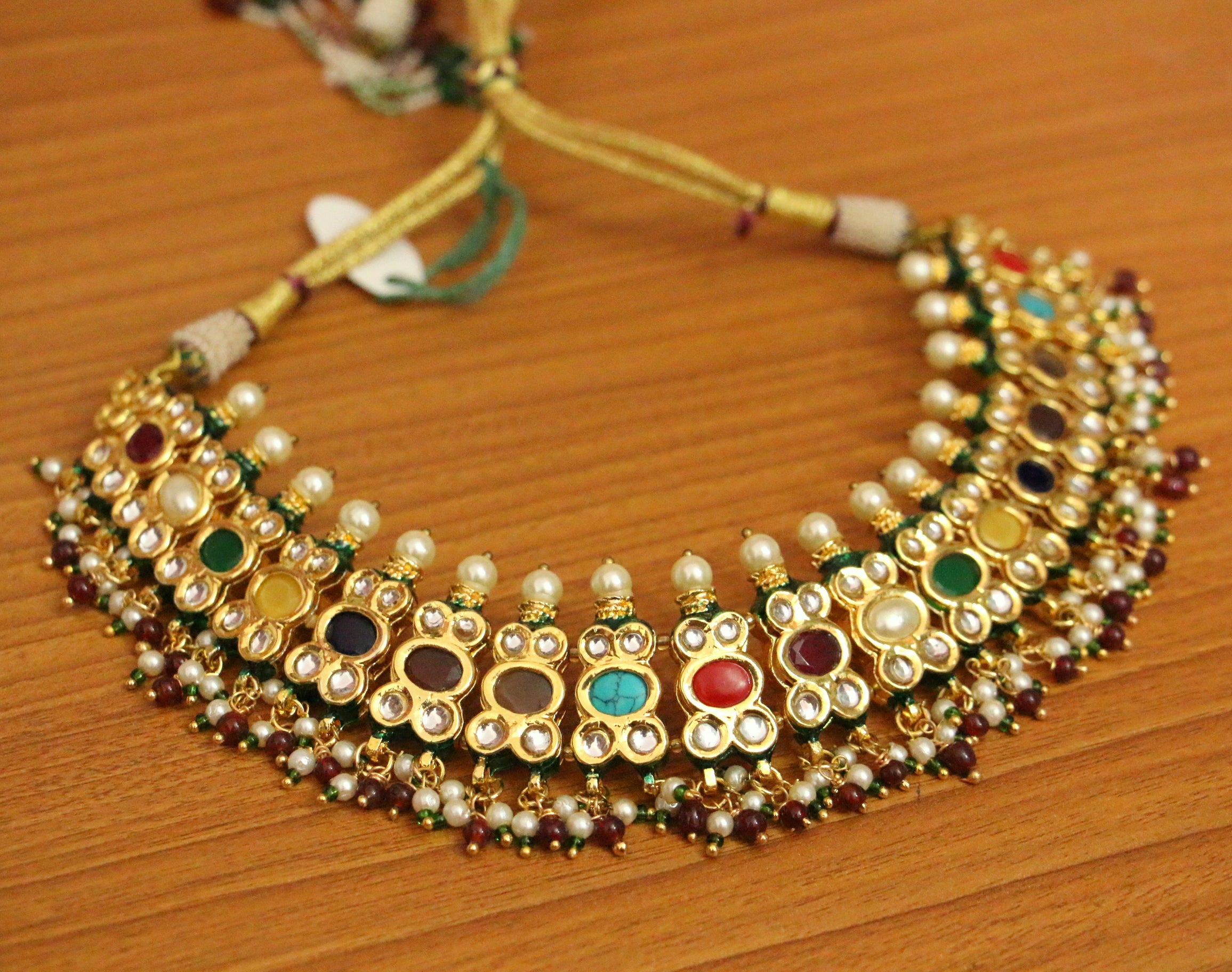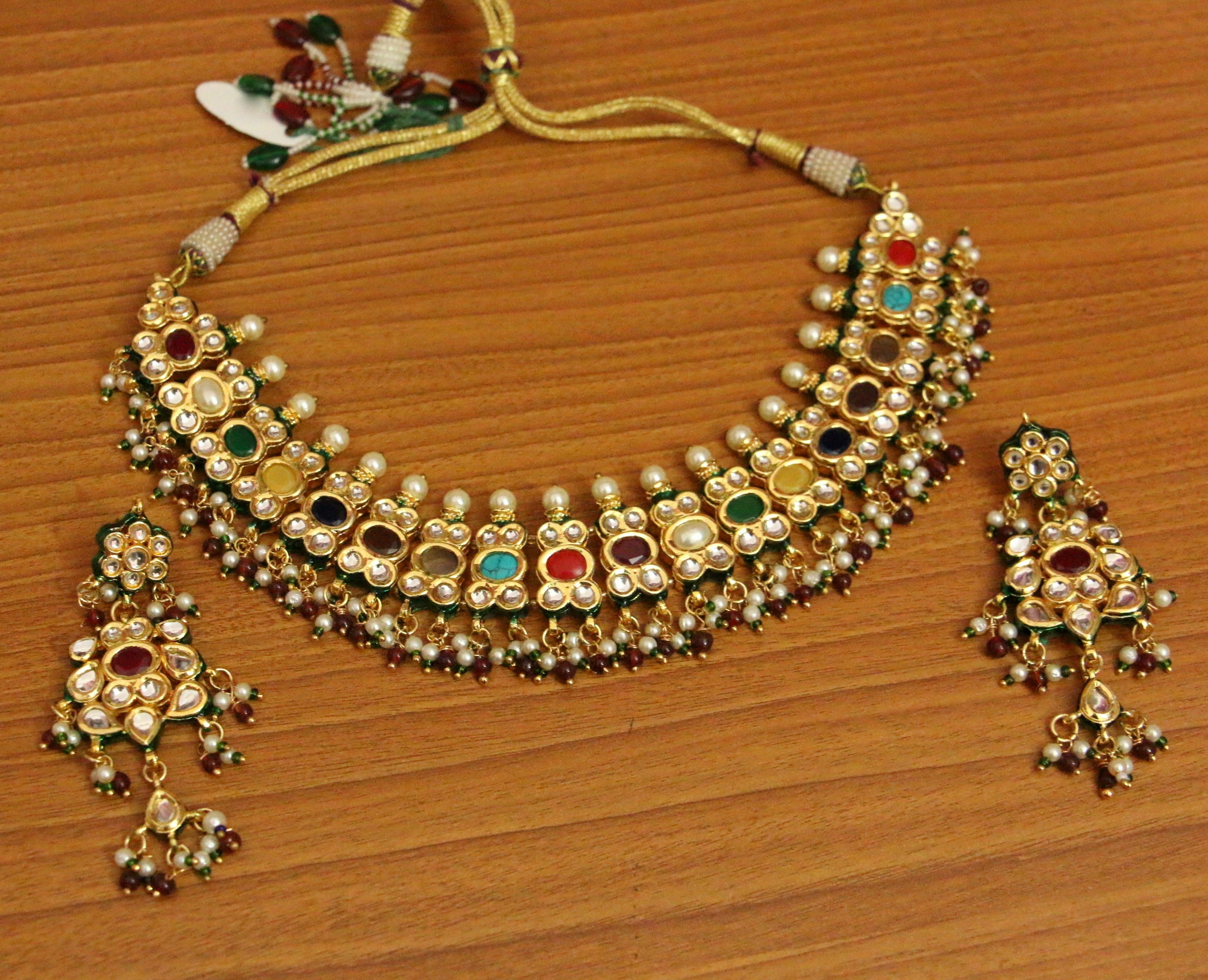 This multicolour kundan polki necklace set Is handcrafted in silver alloy with imitation navratan stones and semi precious beads & pearls. the necklace set is coated with 18kt gold plating and nickle free plating to avoid allergy to the skin.