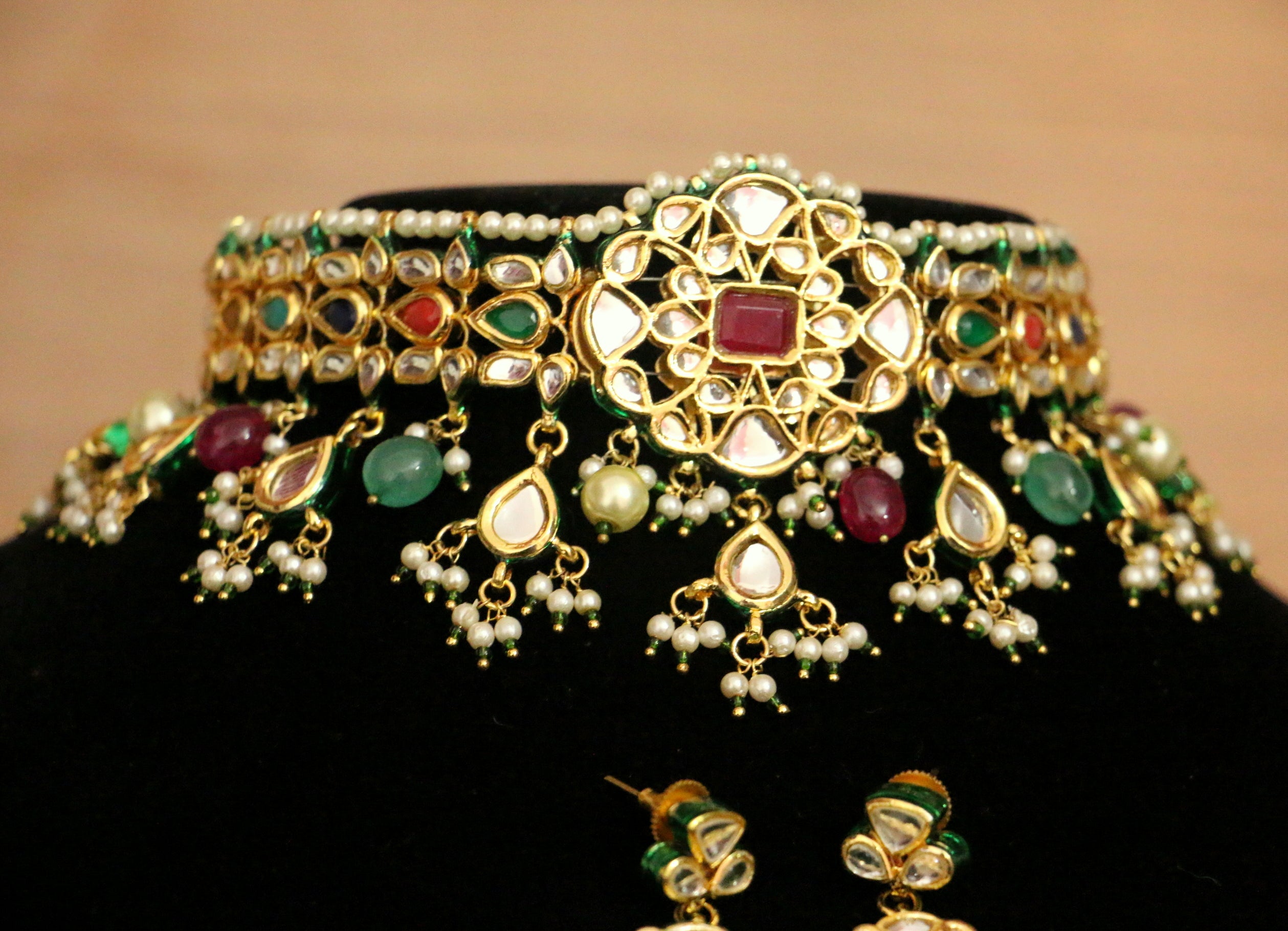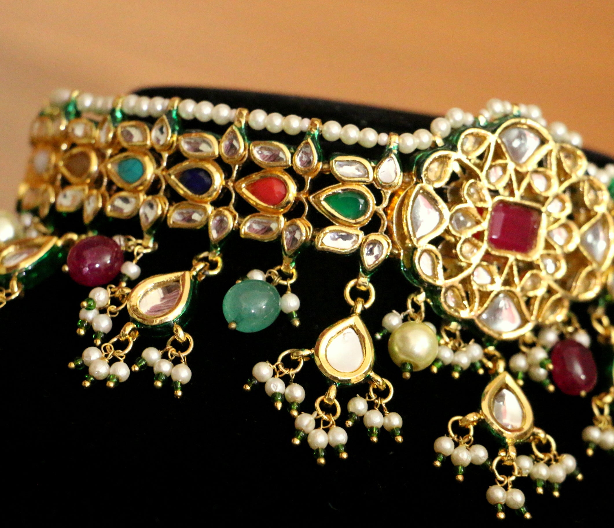 This multicolour kundan polki necklace set Is handcrafted in silver alloy with imitation navratan stones and semi precious onyx beads & pearls. the necklace set is coated with 18kt gold plating and nickle free plating to avoid allergy to the skin.