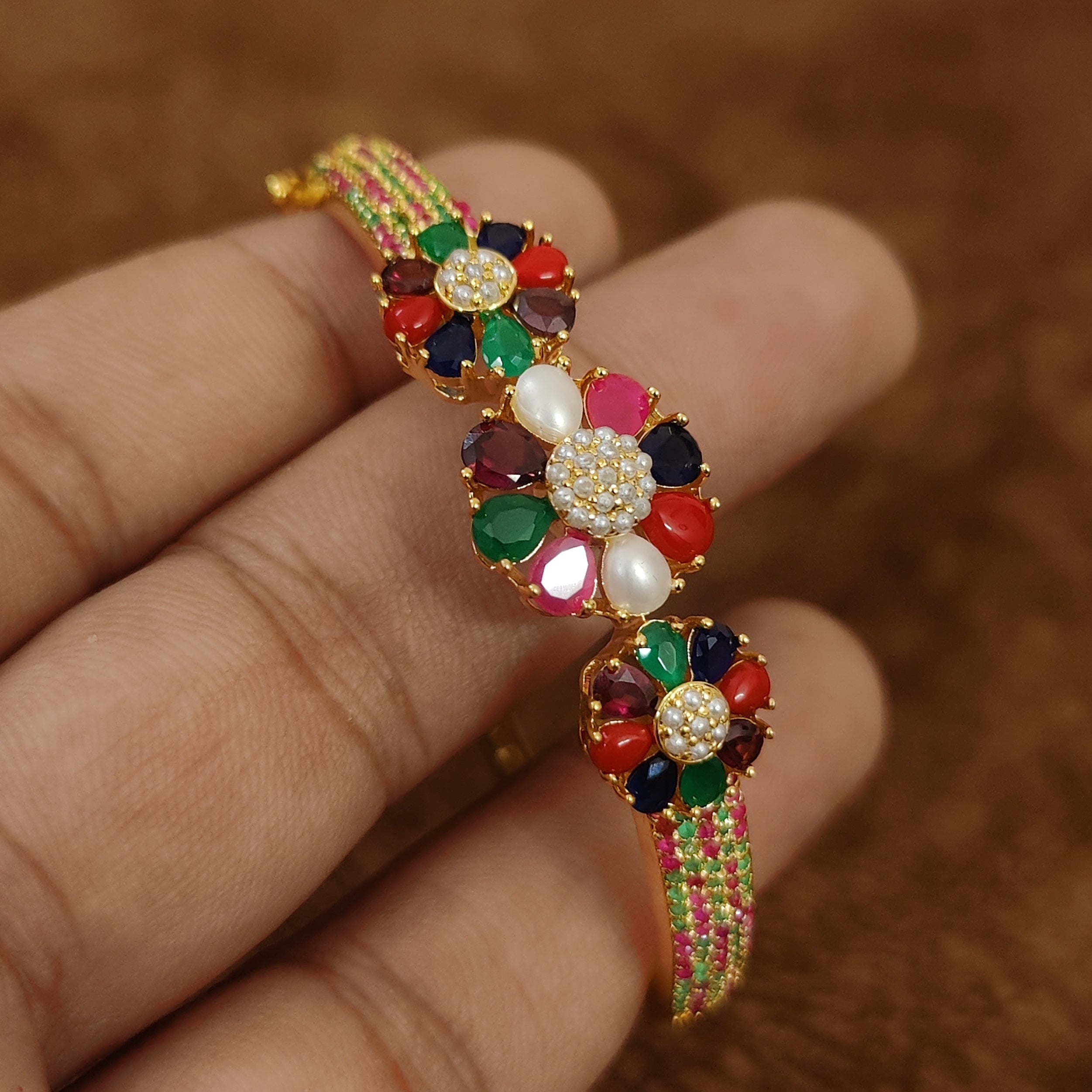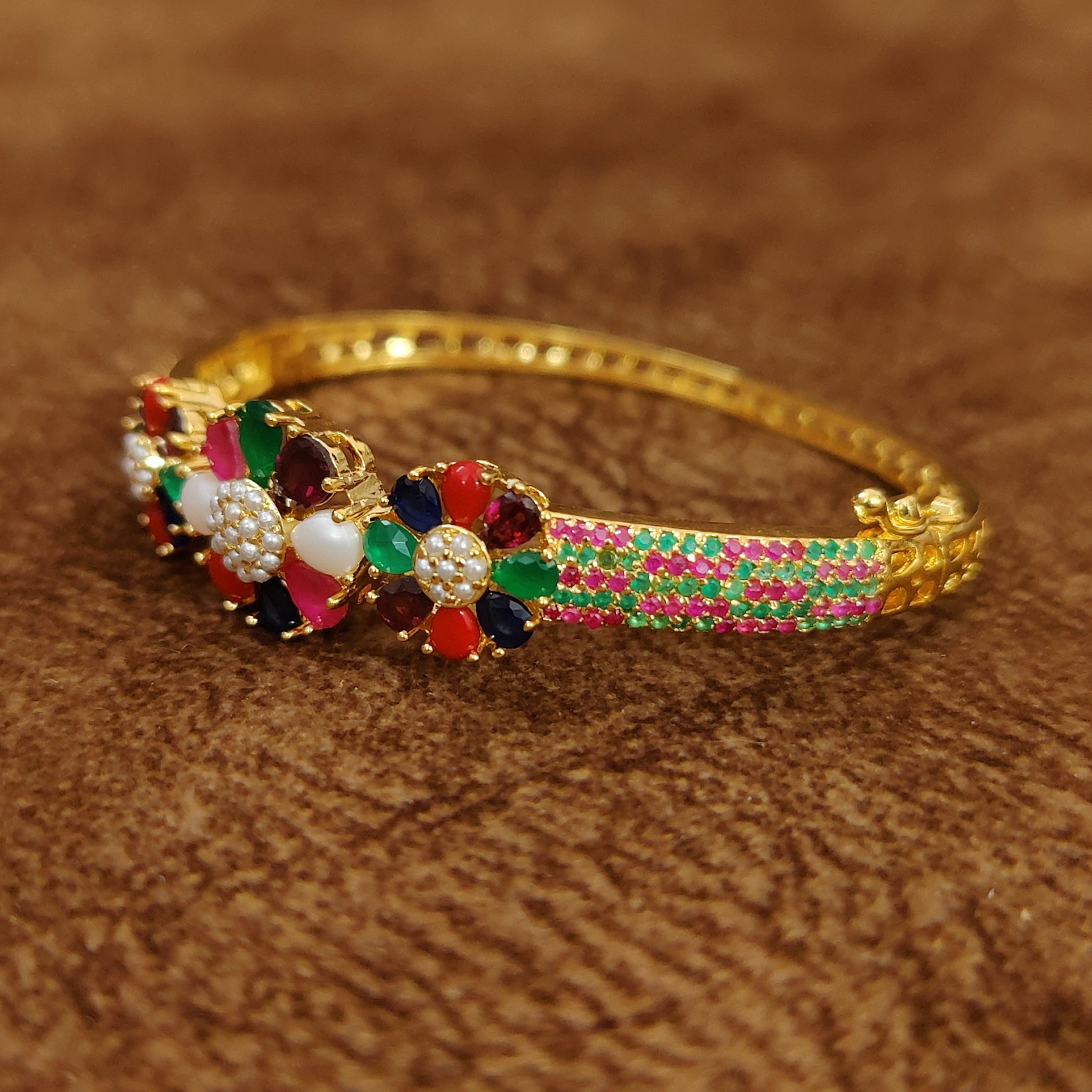 Add a splash of color to your wrist with this Navratan Look Gold Plated CZ Studded Bracelet. Featuring vibrant multicolored stones set in a sleek gold-plated finish, this bracelet reflects the charm of traditional Navratan designs. The sparkling CZ stones add a touch of elegance, making it a perfect accessory for both festive and formal occasions.