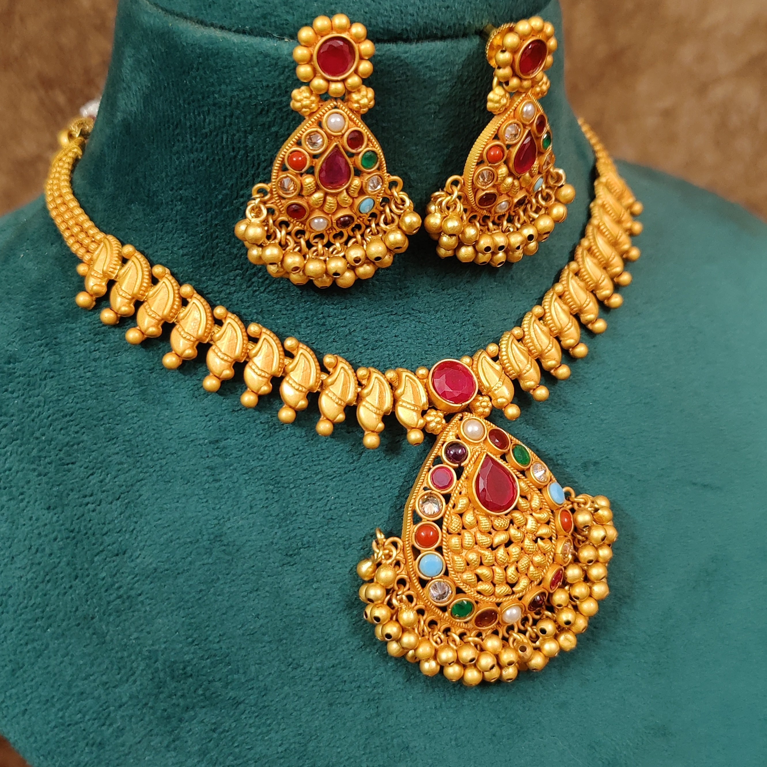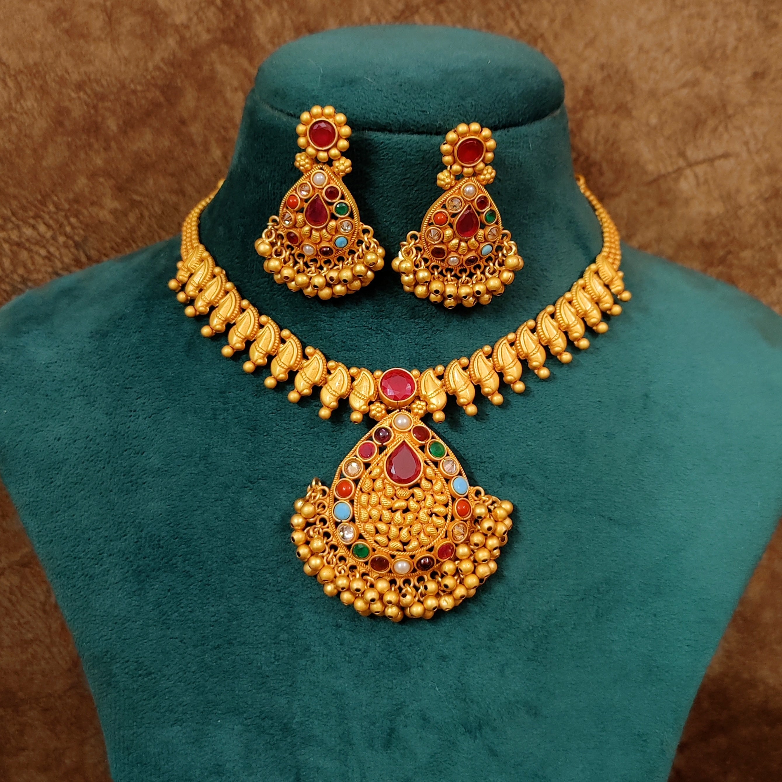 NAVRATAN MATT GOLD PLATED PARTY WEAR NECKLACE SET