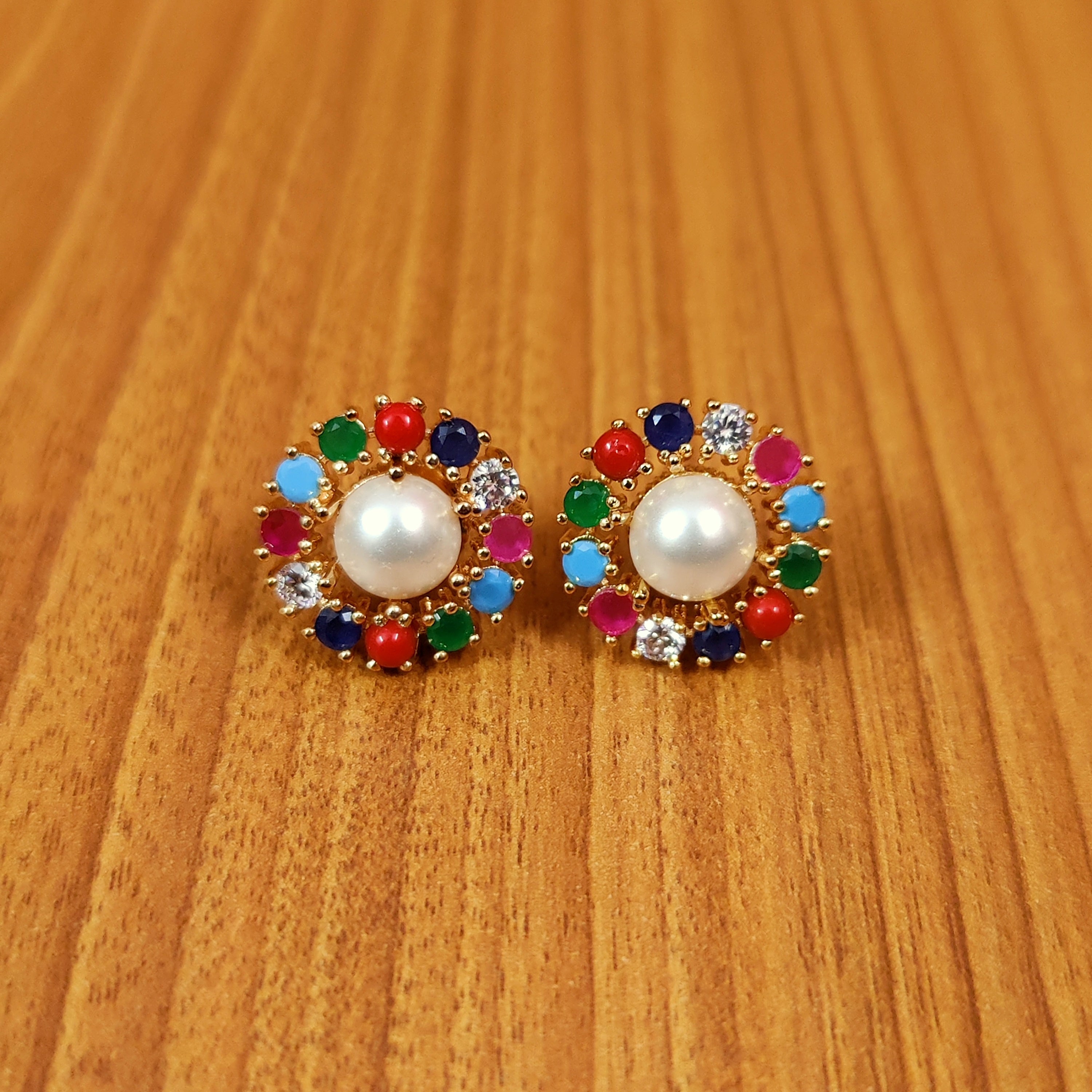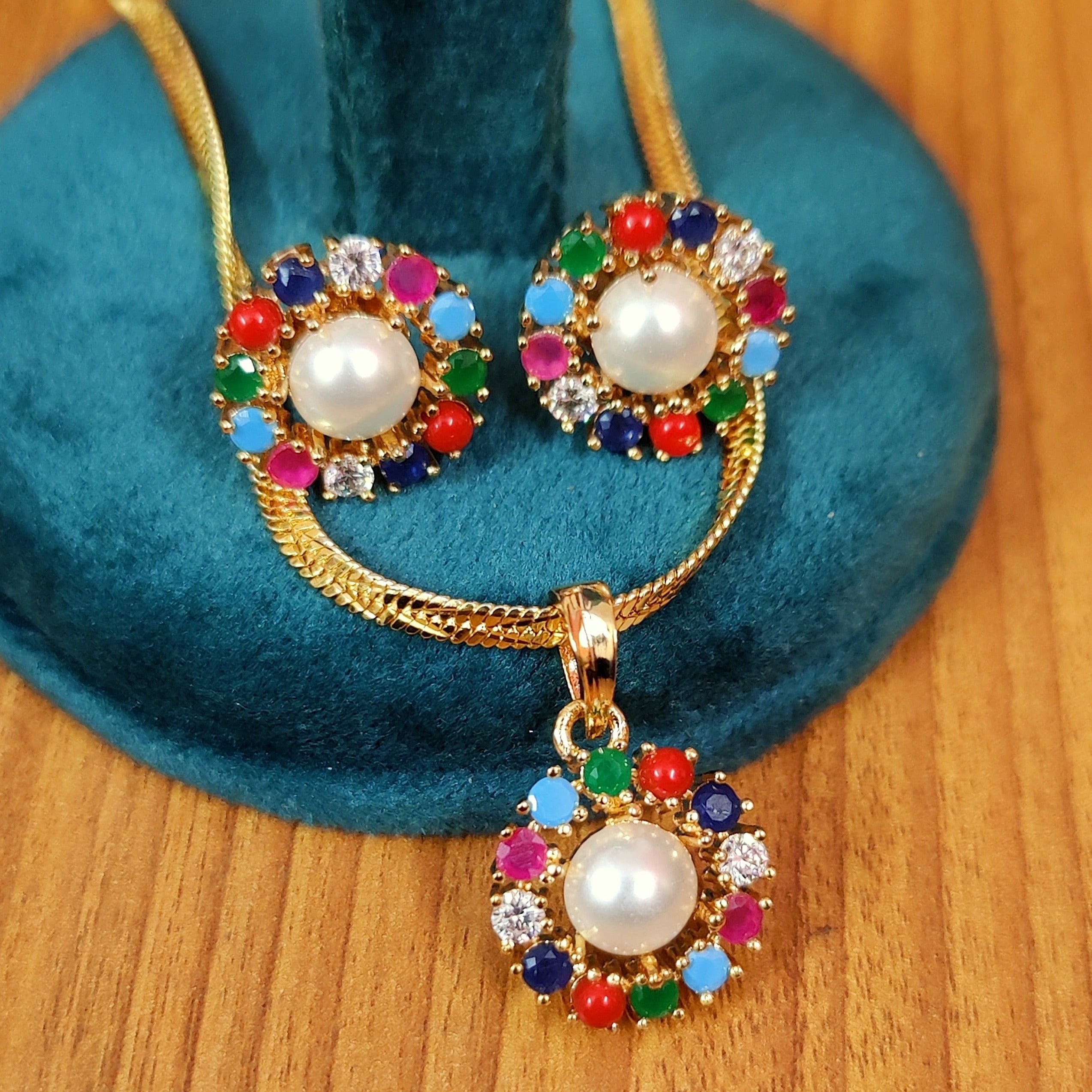 Elevate your style with our Navratan Look Round Pendant with Chain! This stunning round shape pendant set features vibrant multicolour stones and comes with a perfect matching pair of earrings. Each piece is gold plated with 18kt gold, giving it a unique and trendy look. Perfect for weddings, occasions, parties, or any special day, this pendant set will add a touch of elegance to your outfit. Don't miss out on this trending piece, complete with a matching chain for a complete look!