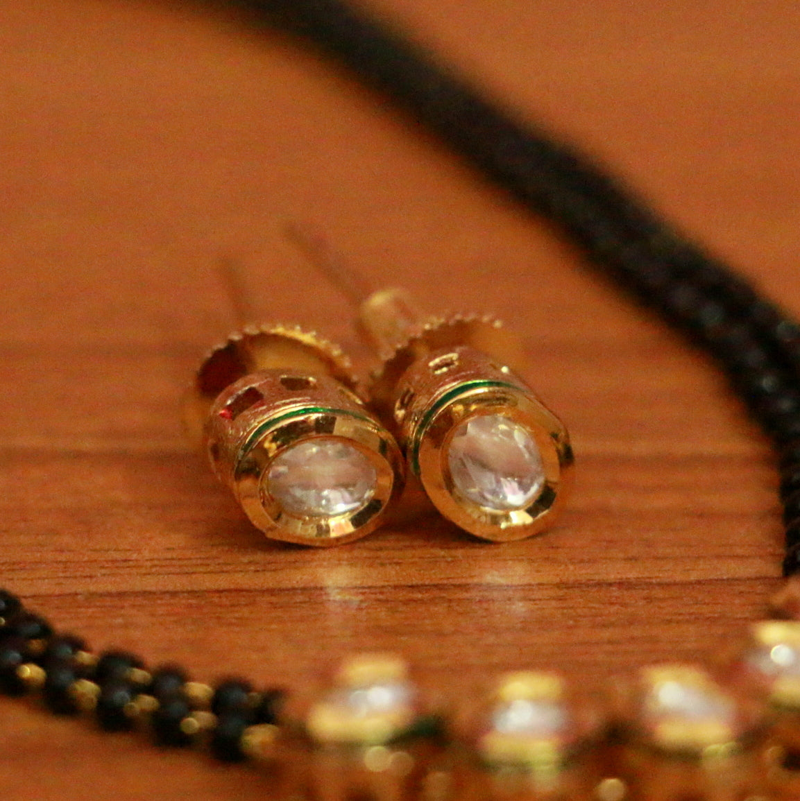 This beautiful mangalsutra is handcrafted in brass alloy with imitation kundan with meenakari work of very fine quality . this mangalsutra is coated with 18 kt gold polish which give them a unique look . an absolutely stunning piece to own and are very light in weight.