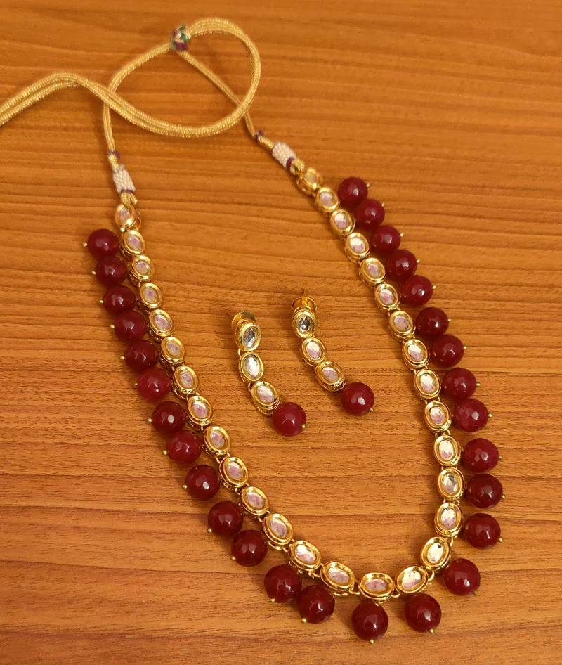 This Kundan Polki Necklace Set Is Handcrafted In Brass Alloy With Red Colour Beads And Kundan With Meenakari Work Of Fine Quality , The Necklace Set Is Plated With 18kt Nickle Free Gold Plating Which Gives It A Real Look .
