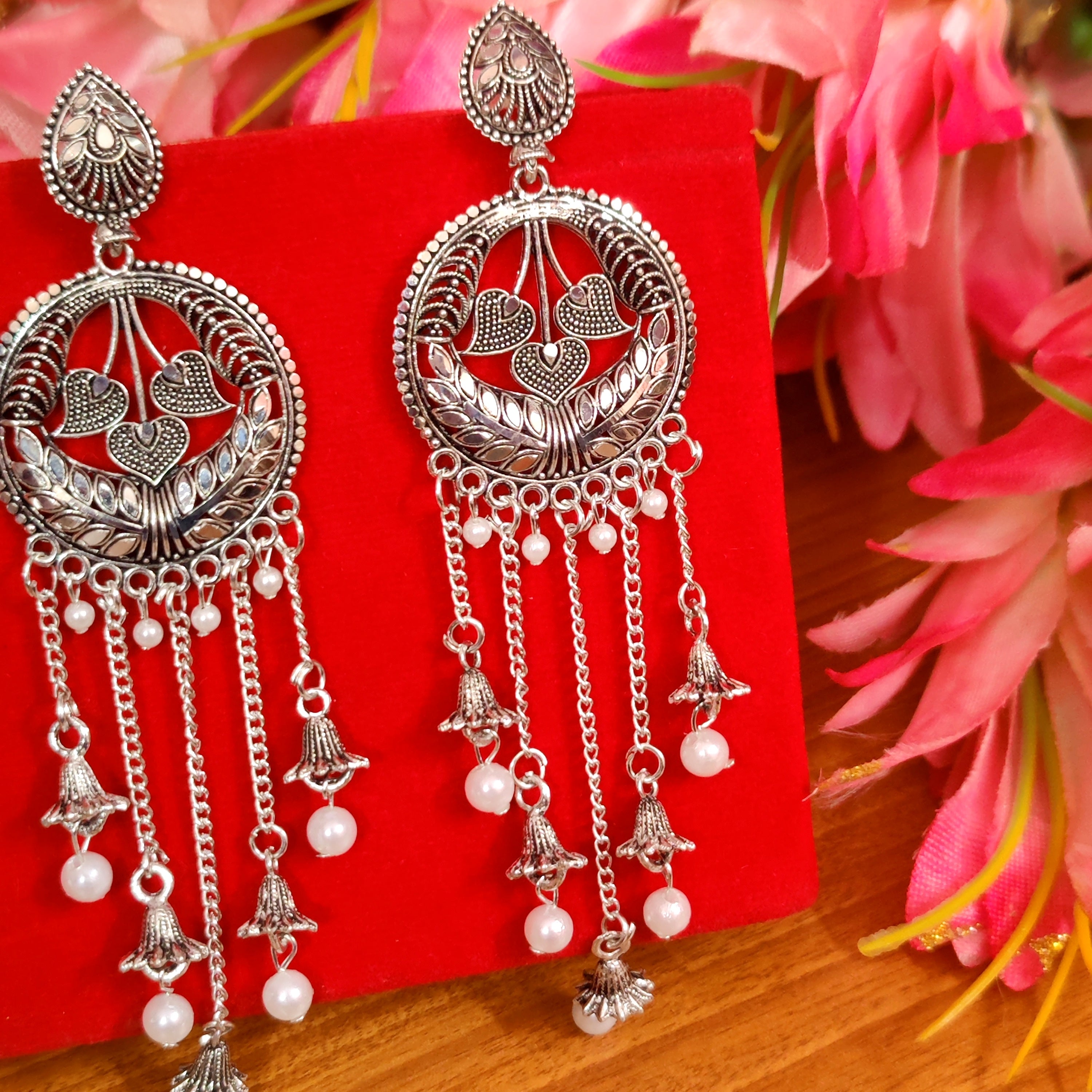 Add traditional beauty to your look with these silver look alike long danglers . Crafted with lightweight oxidised silver and adorned with pearls, these earrings look like real silver and will bring a touch of elegance and luxury to your look. Handmade in India and perfect for any occasion, what are you waiting for?