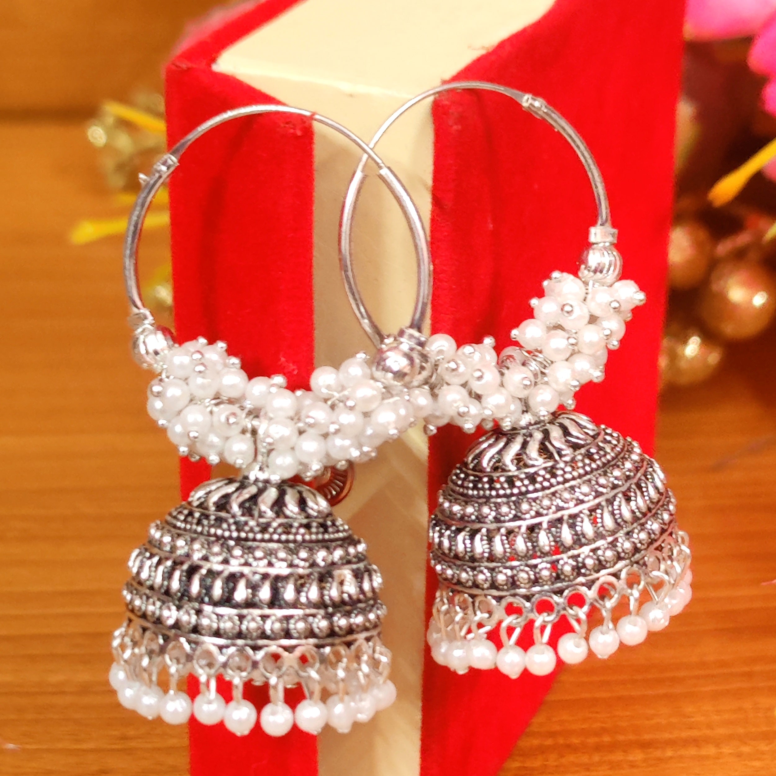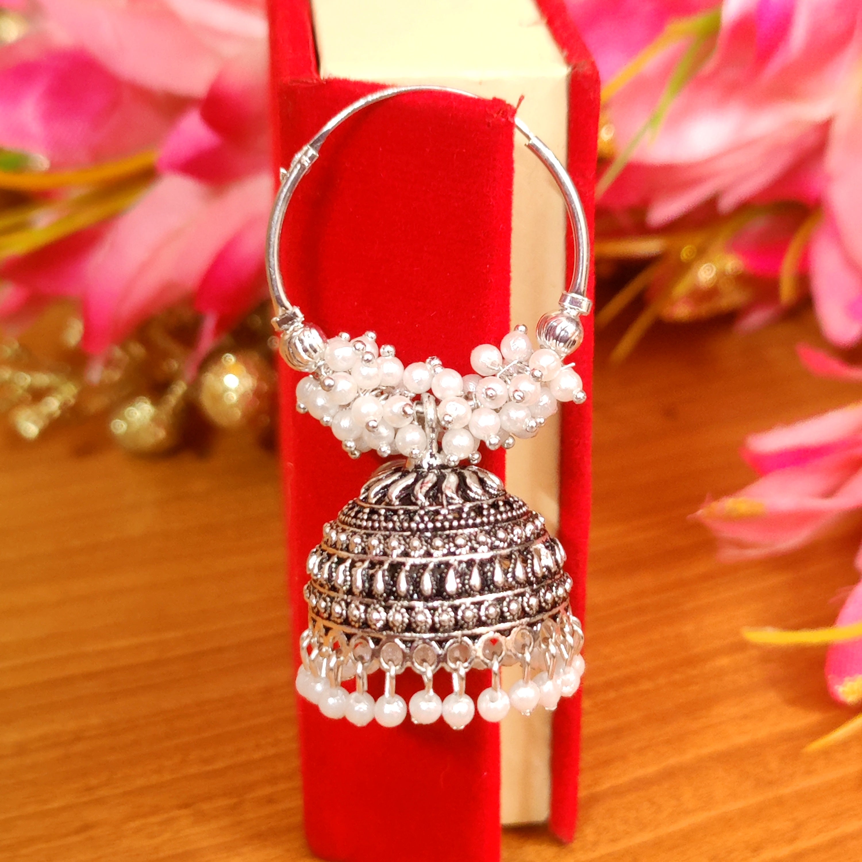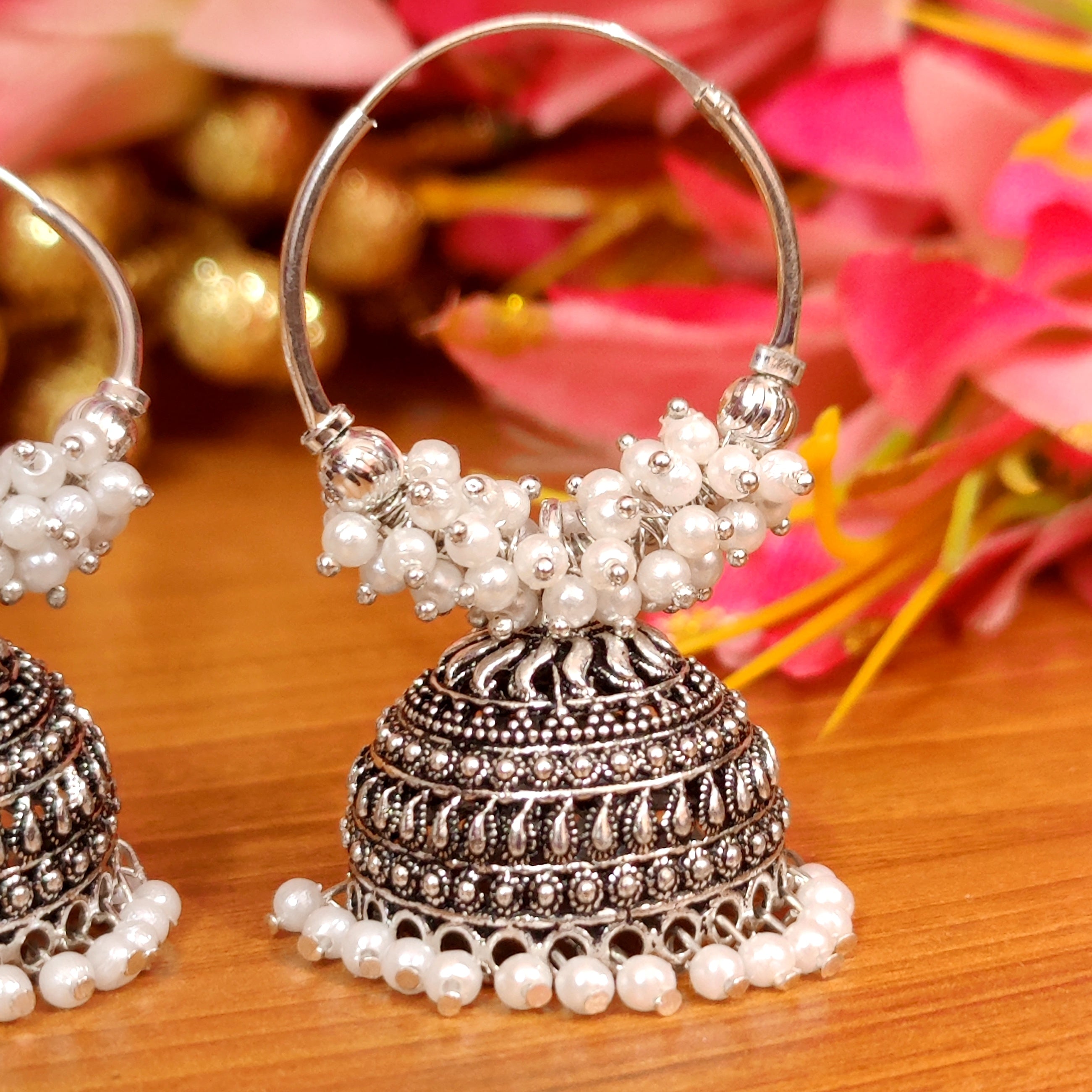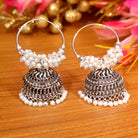 Add a touch of sparkle to your everyday look with these gorgeous handcrafted oxidised Silver Pearl Hoops. Crafted with light weight pearls and oxidised plating, these earrings look just like silver and will turn heads wherever you go! Experience the elegance of pearl jhumka's without the added weight.