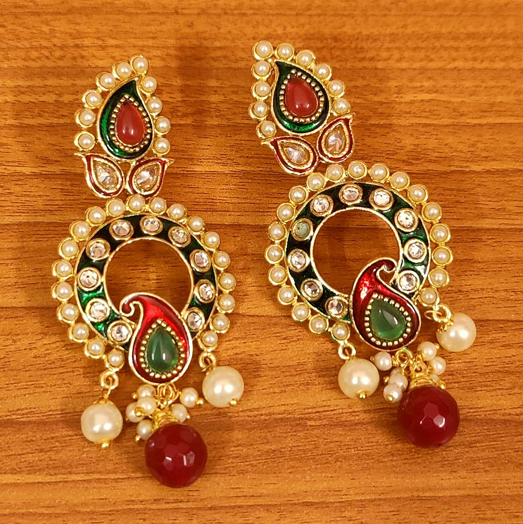 These multicolour meenakari earrings are handcrafted in copper alloy with imitation multicolour stones& pearls of very fine quality. These party wear earrings are plated with 18 kt antique gold plating which gives the design a real gold look , the earrings are light in weight and are perfect for occasional wear.