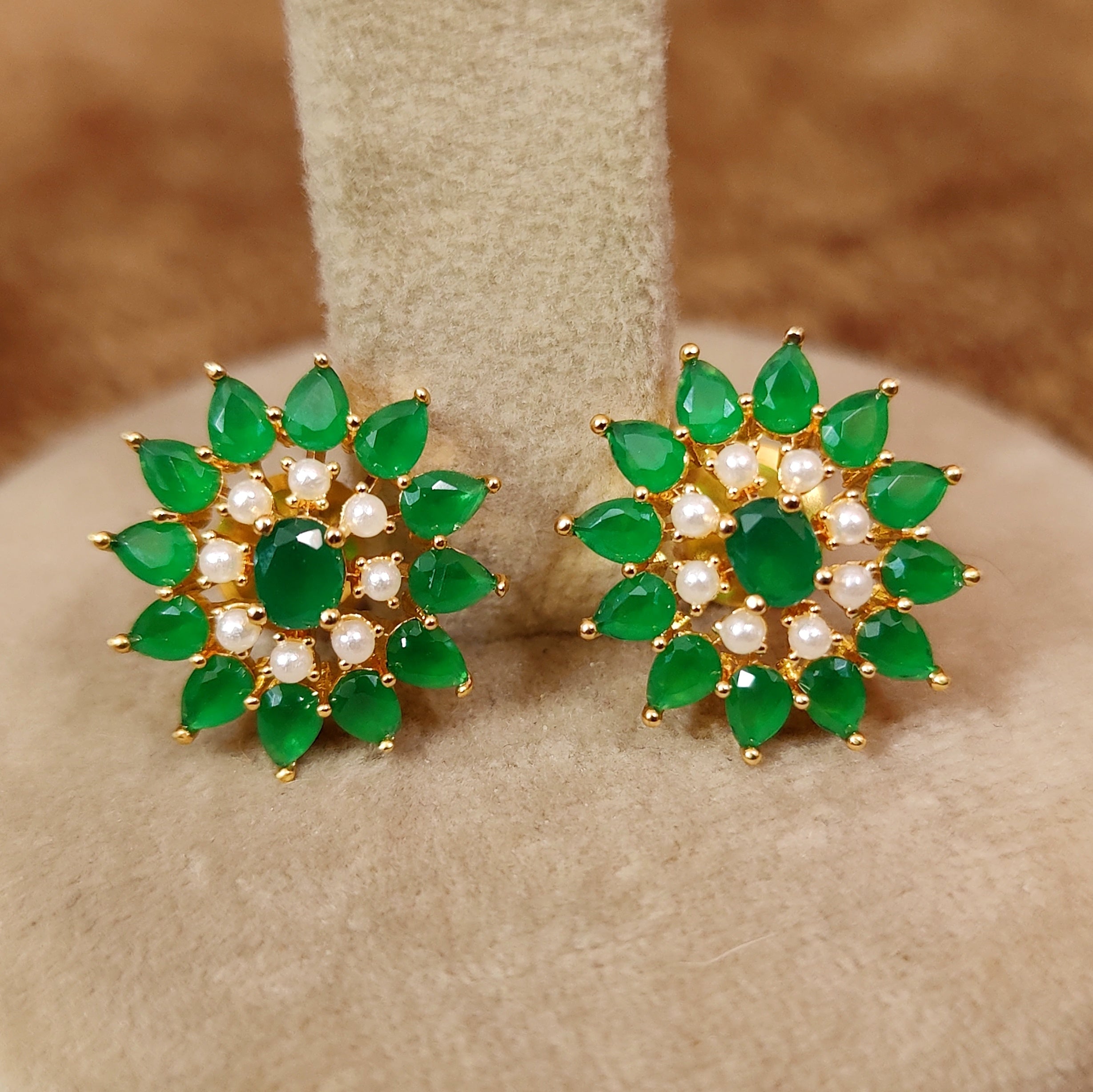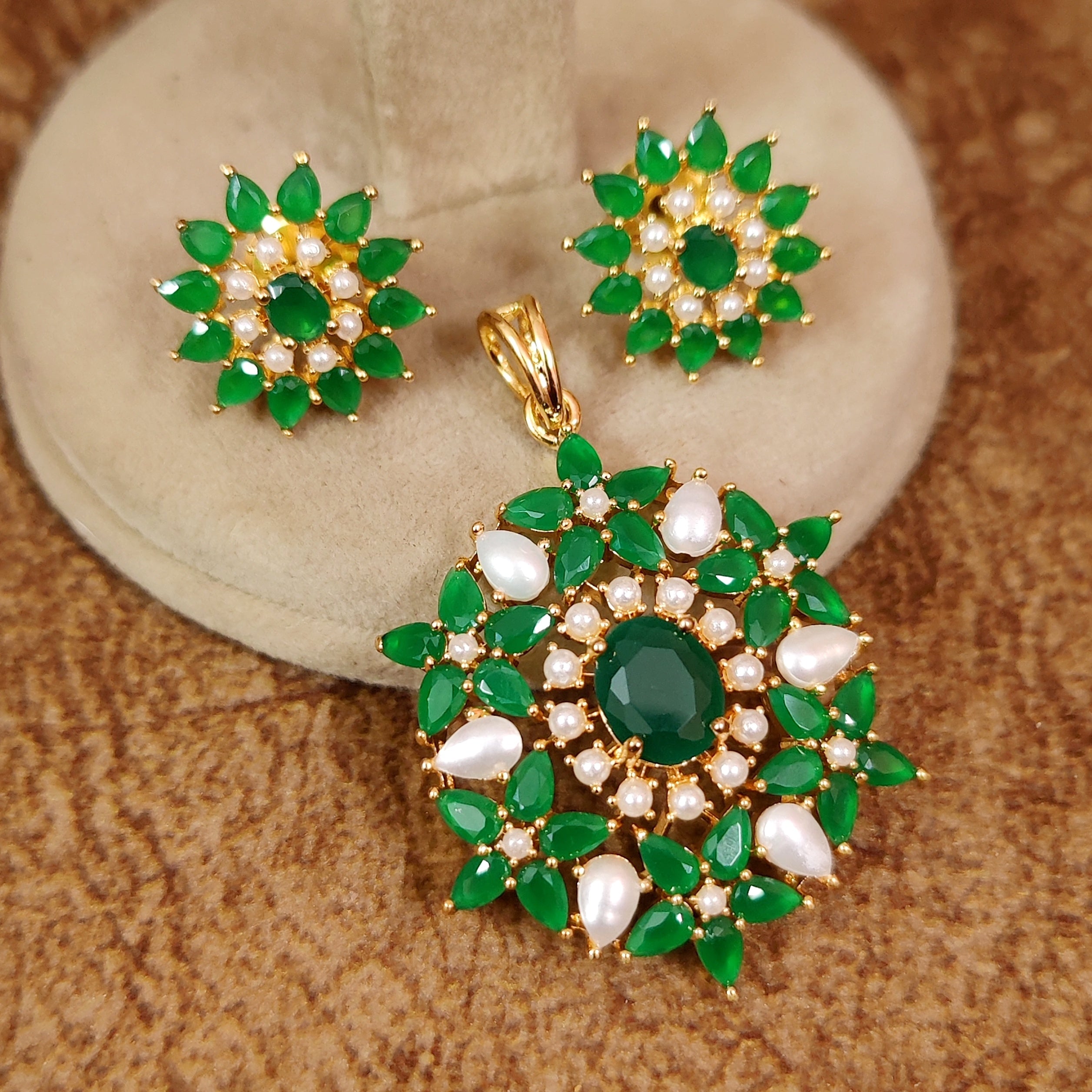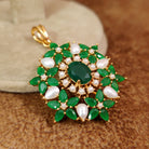 PEARL & EMERALD STONE FLOWER STUDDED PREMIUM PENDANT SET