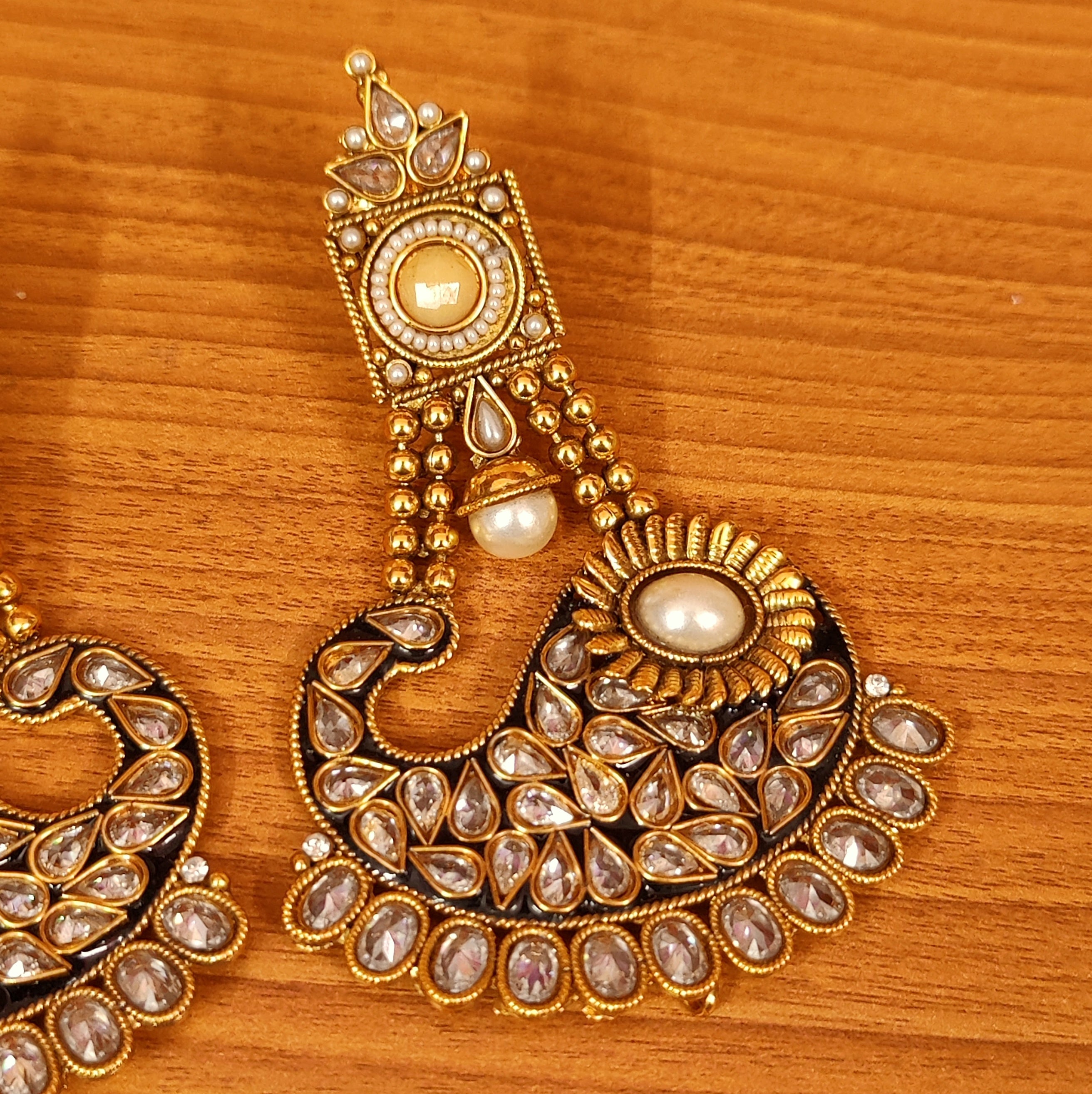 These gold plated earrings are handcrafted in silver alloy with imitation pearls and polki stones of very fine quality. These party wear long earrings are plated with 22kt antique gold plating which gives the design a real gold look , the earrings are light in weight and are perfect for occasional wear.