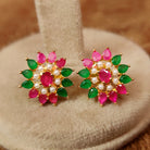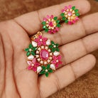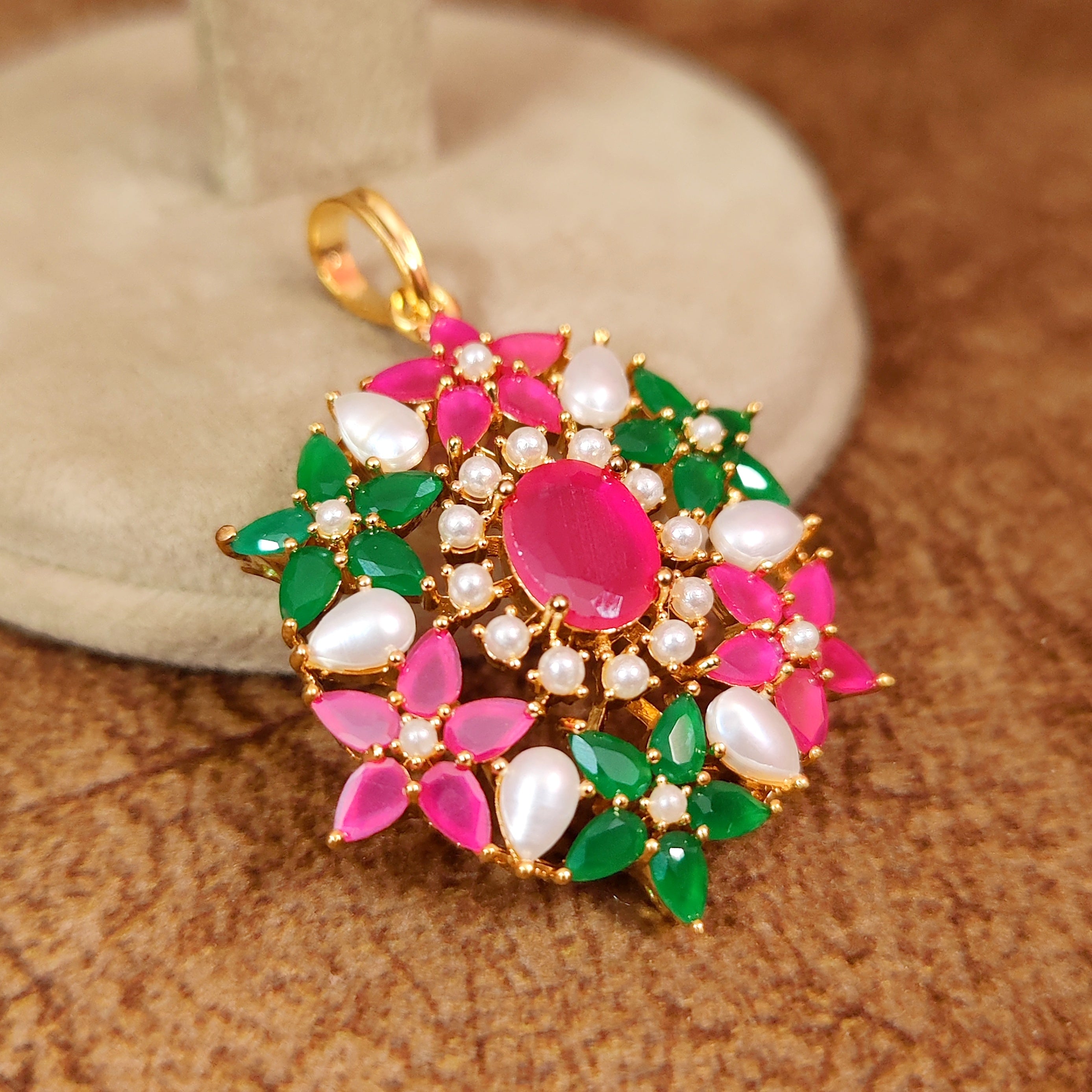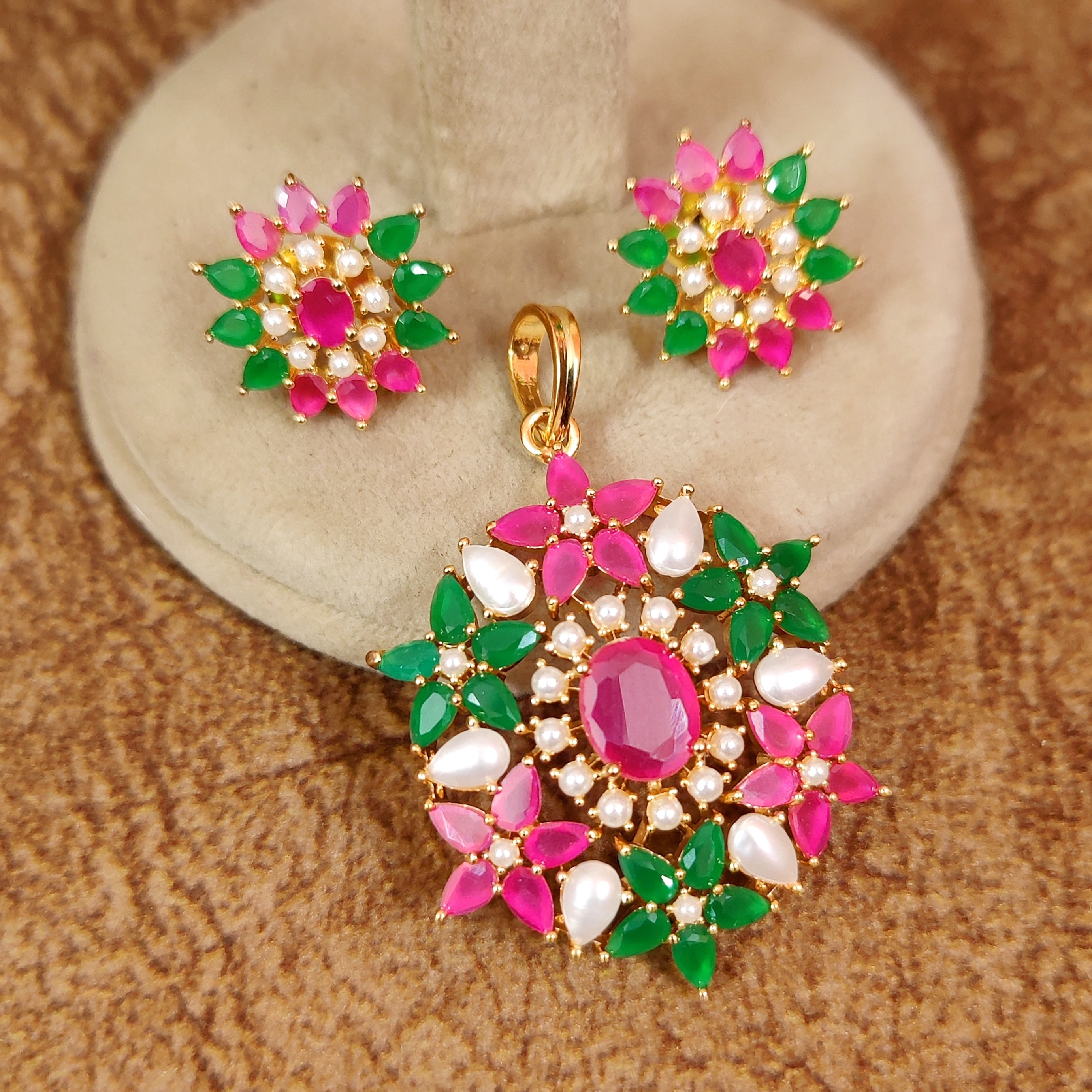 This flower pattern pandant set is handcrafted in silver alloy with imitation emerald & ruby colour quartz with cz stones of very fine quality. This beautiful pendant set is plated with fine nickle free gold rhodium to avoid any allergies to the skin.  The Light weight earrings add a certain wholeness to the Premium Pendant Set.This Premium Pendant Set will add a a great deal of Dazzle in your jewellery collection.