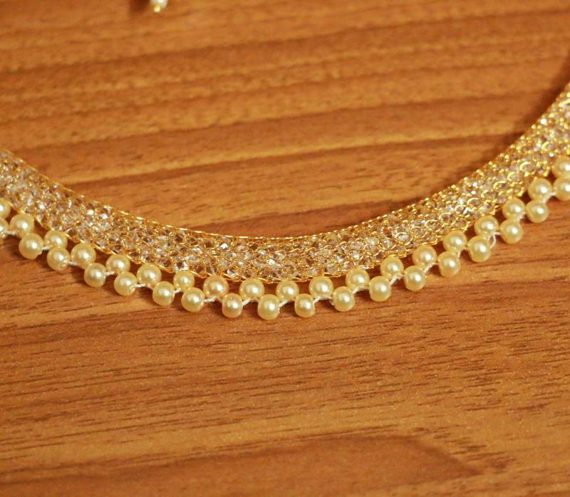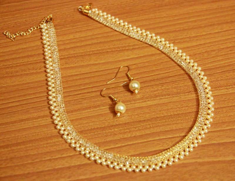 This necklace set is handcrafted in brass alloy with pearl beads & zircon of fine quality , the necklace set is plated with 18kt nickle free gold plating which gives it a real look .