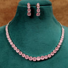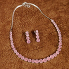 This single line necklace set is handcrafted in silver alloy with imitation mint green colour quartz in round shape of very fine quality . this necklace set is coated with 18 kt white gold rhodium plating that gives a real gold look . an absolutely stunning piece to own and are light in weight.