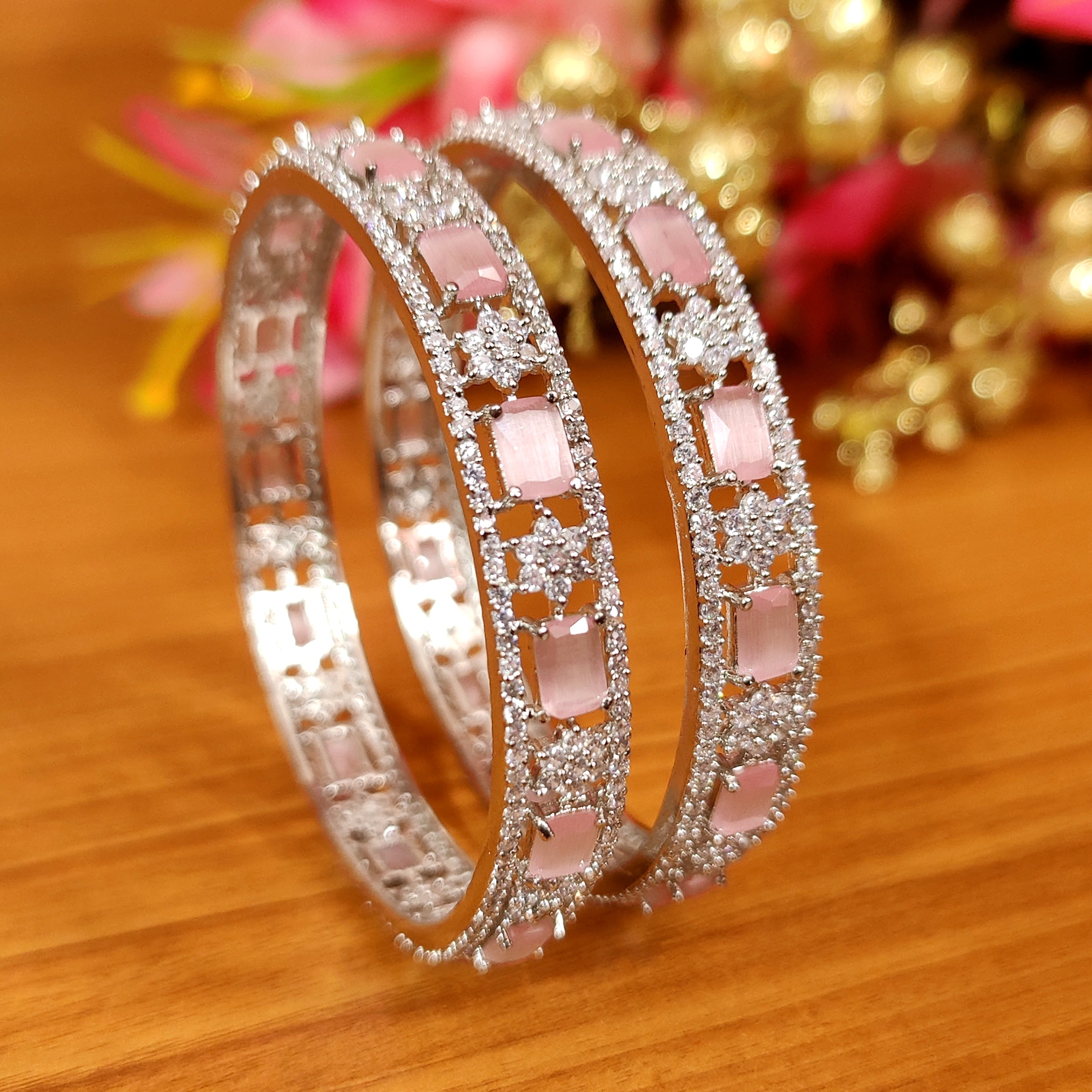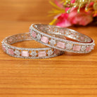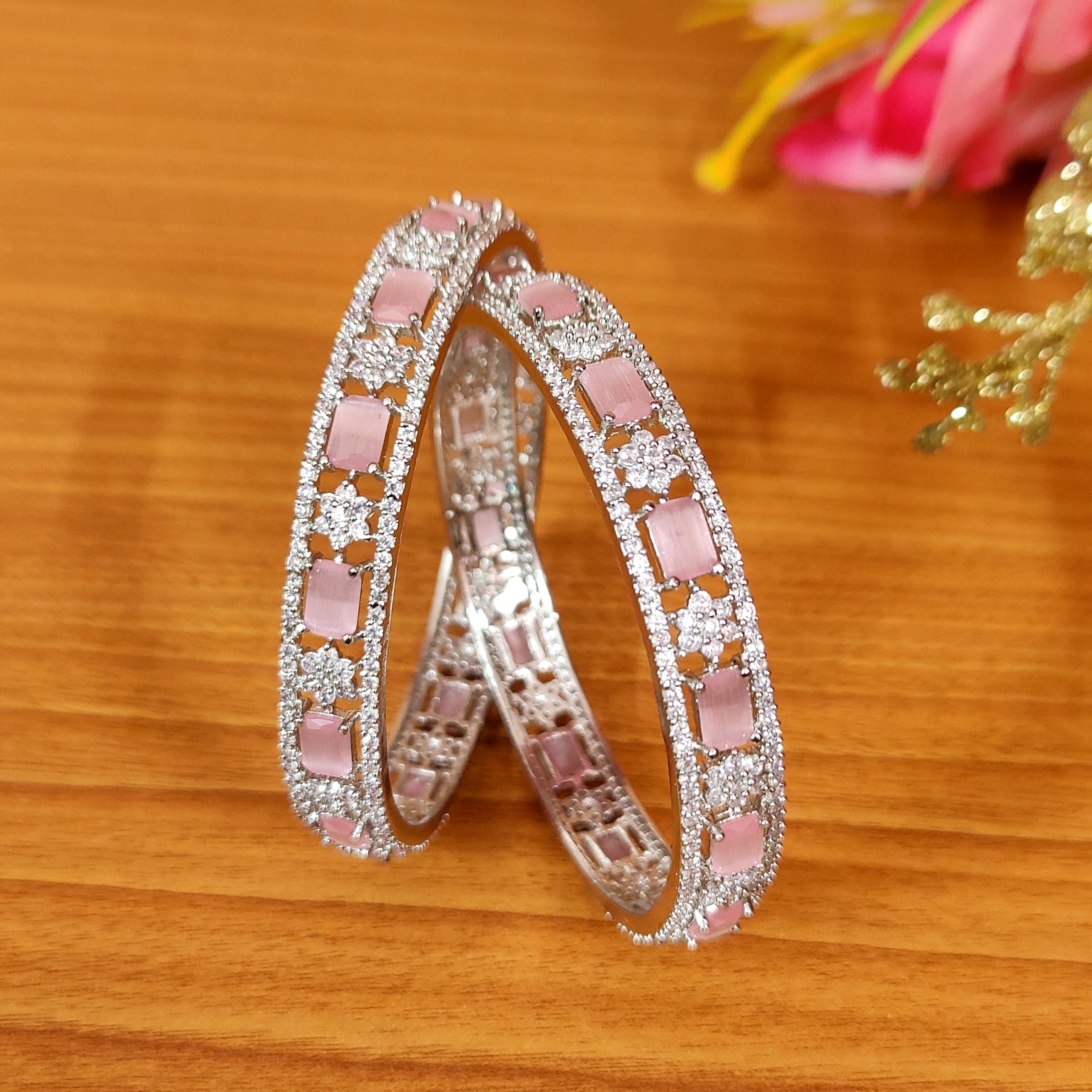 Add a soft touch of luxury to your collection with the Pink Onyx CZ Diamond Look Silver Bangles from Sanvi Jewels. These elegant bangles feature blush pink onyx-look cubic zirconia stones, designed to mimic diamond brilliance, set in a sleek silver-plated frame. Perfect for festive occasions, weddings, or elevating your everyday look, these bangles offer a graceful blend of charm and sophistication.