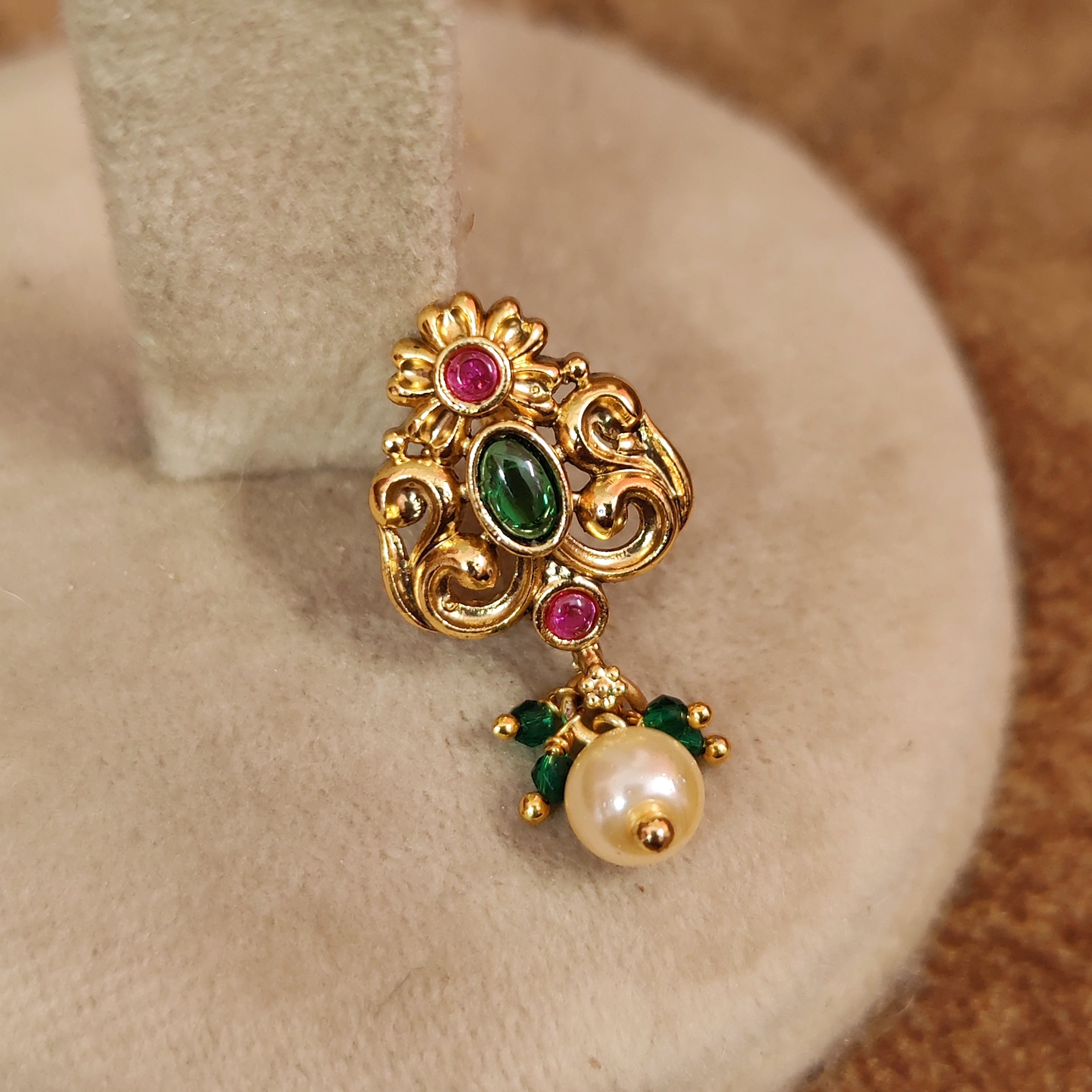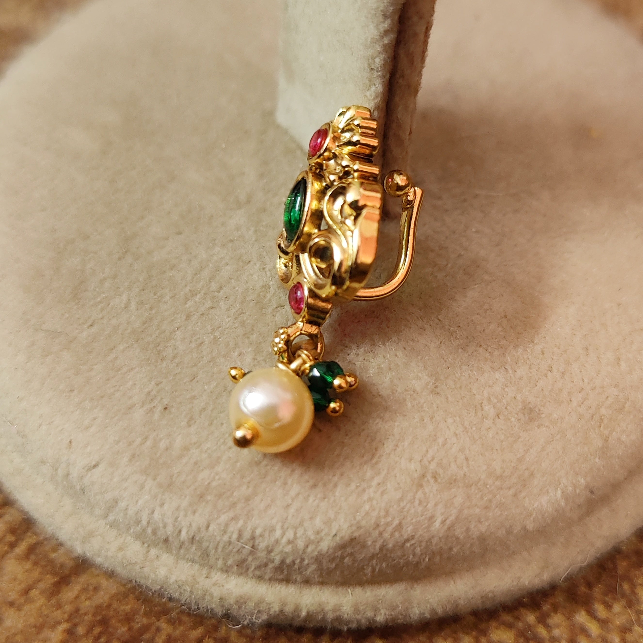 Elevate your traditional look with this Premium Antique Gold Plated Kemp Stone Pressable Nose Pin. Designed with intricate craftsmanship, this nose pin features authentic Kemp stones set in an antique gold-plated finish, exuding timeless elegance. The pressable design ensures a secure and comfortable fit without the need for piercing. Perfect for weddings, festive occasions, and ethnic wear, this nose pin is a must-have for those who love classic Indian jewelry. Shop now for a touch of heritage charm!