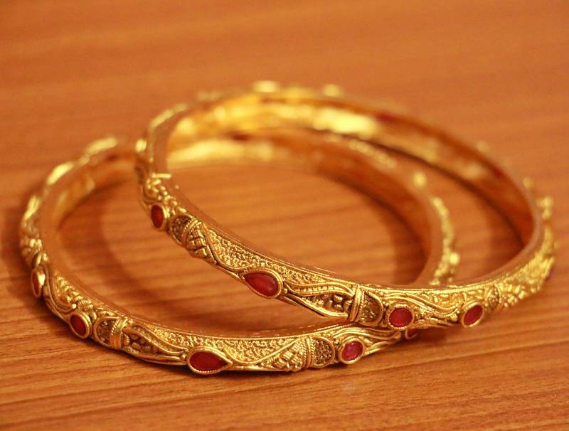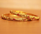 These gold look bangles are handcrafted in copper alloy with imitation red ruby work of very fine quality. These artistic yet modern bangles are plated with fine nickle free gold rhodium to avoid any allergies to the skin.