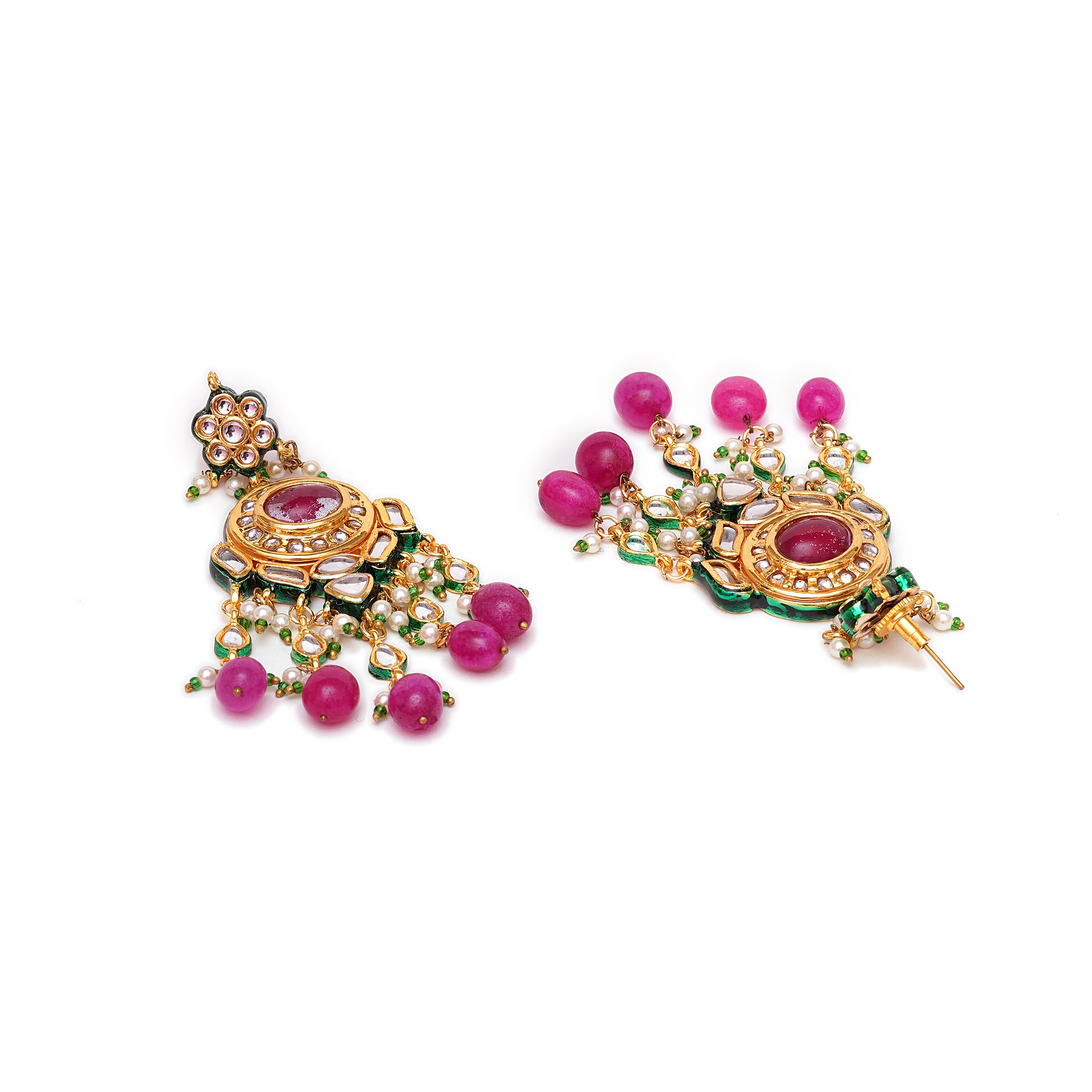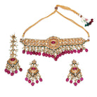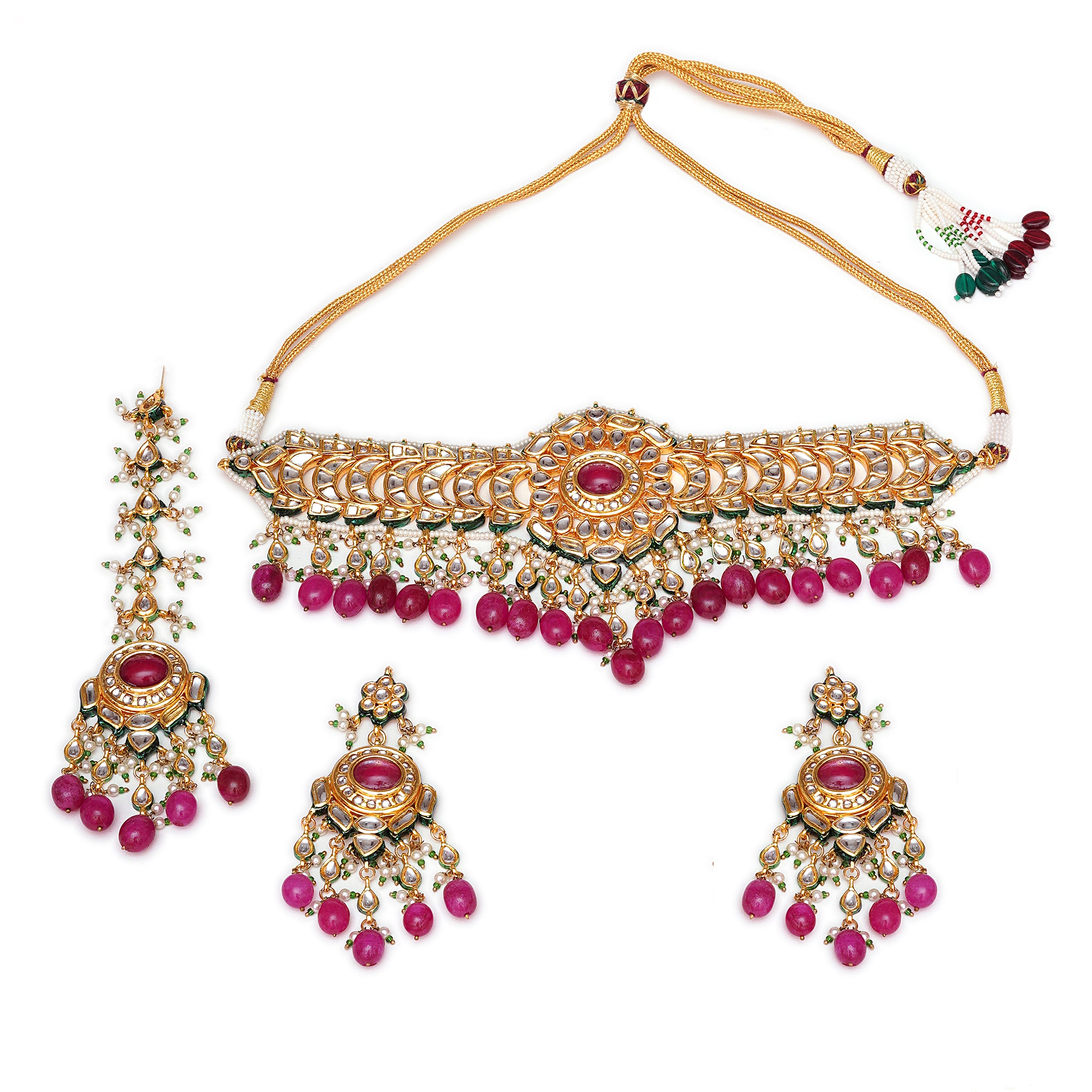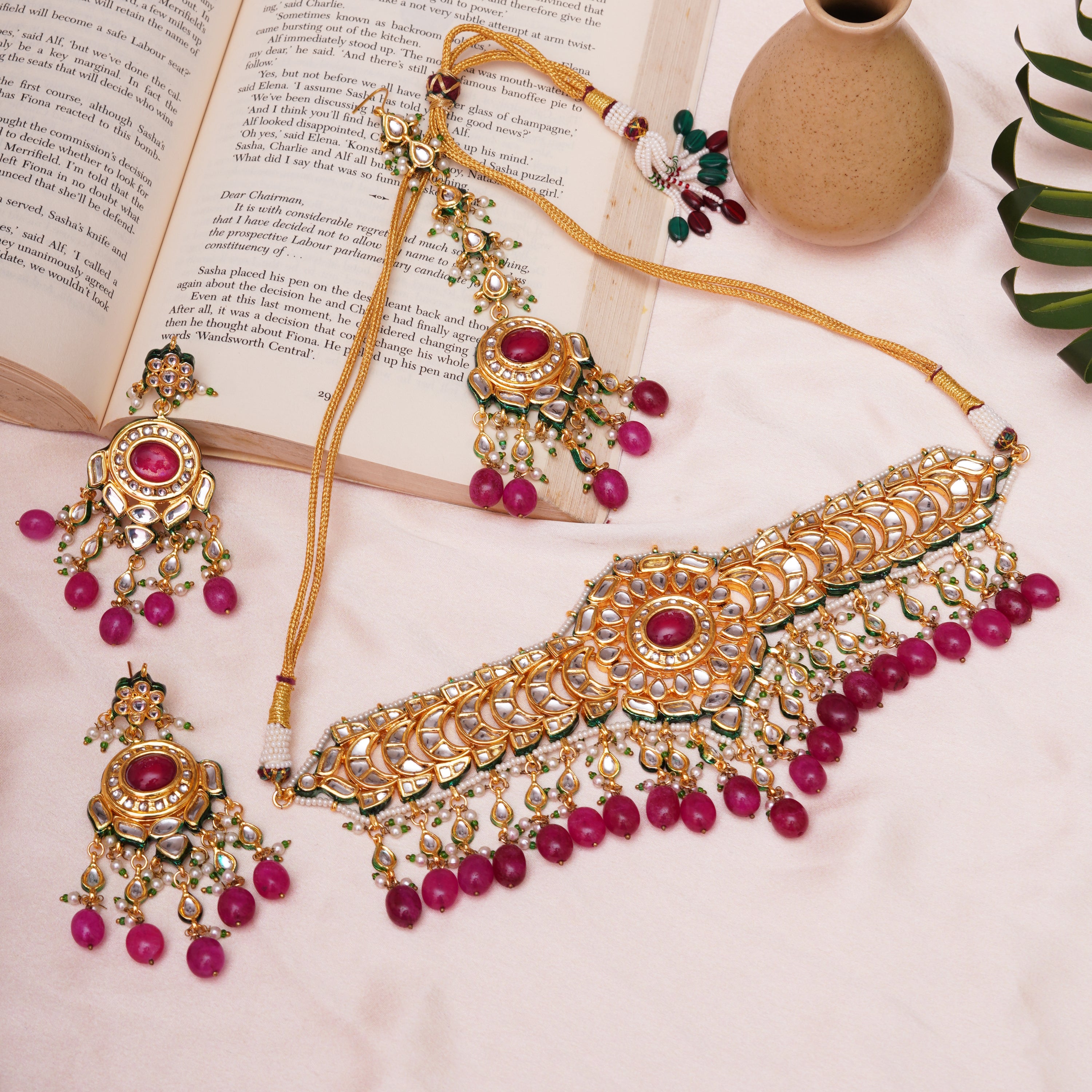 Elevate your style with our multicolour kundan polki necklace set ! Adorned with red and green stones, kundan polki stones, and meenakari work, this set is an 18kt gold plated treasure. The perfect matching earrings complete the unique look, perfect for weddings, parties, and special occasions. Embrace the trend and make your day even more special!