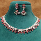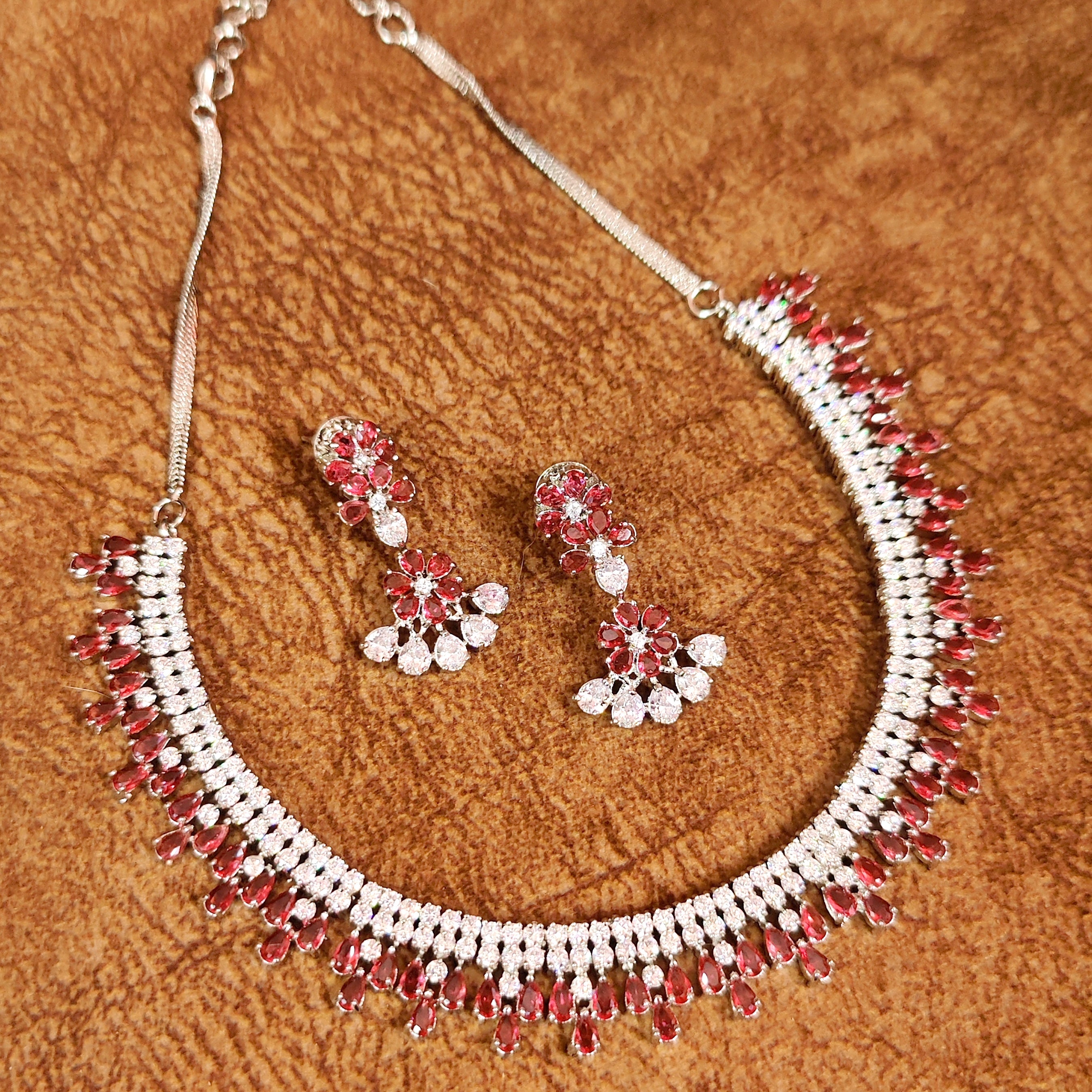 This single line necklace set is handcrafted in silver alloy with imitation mint green colour quartz in round shape of very fine quality . this necklace set is coated with 18 kt white gold rhodium plating that gives a real gold look . an absolutely stunning piece to own and are light in weight.