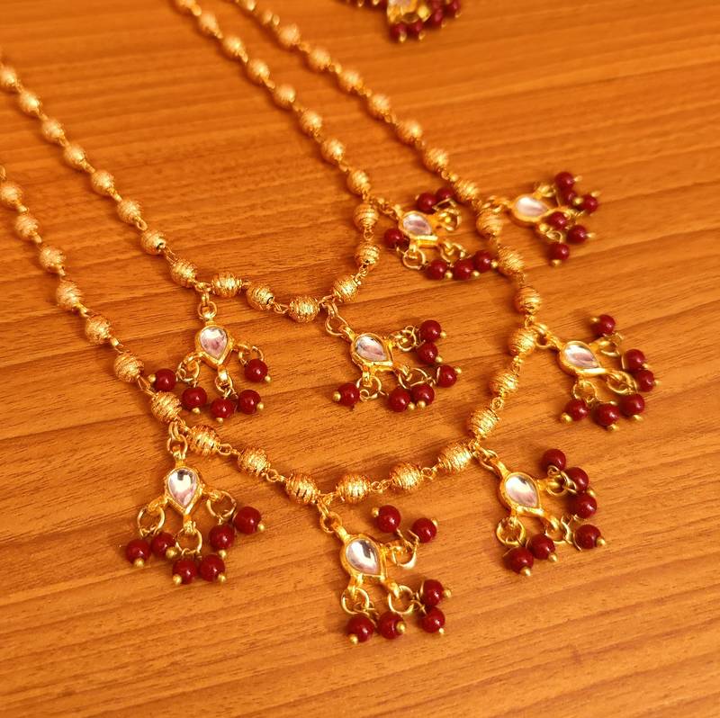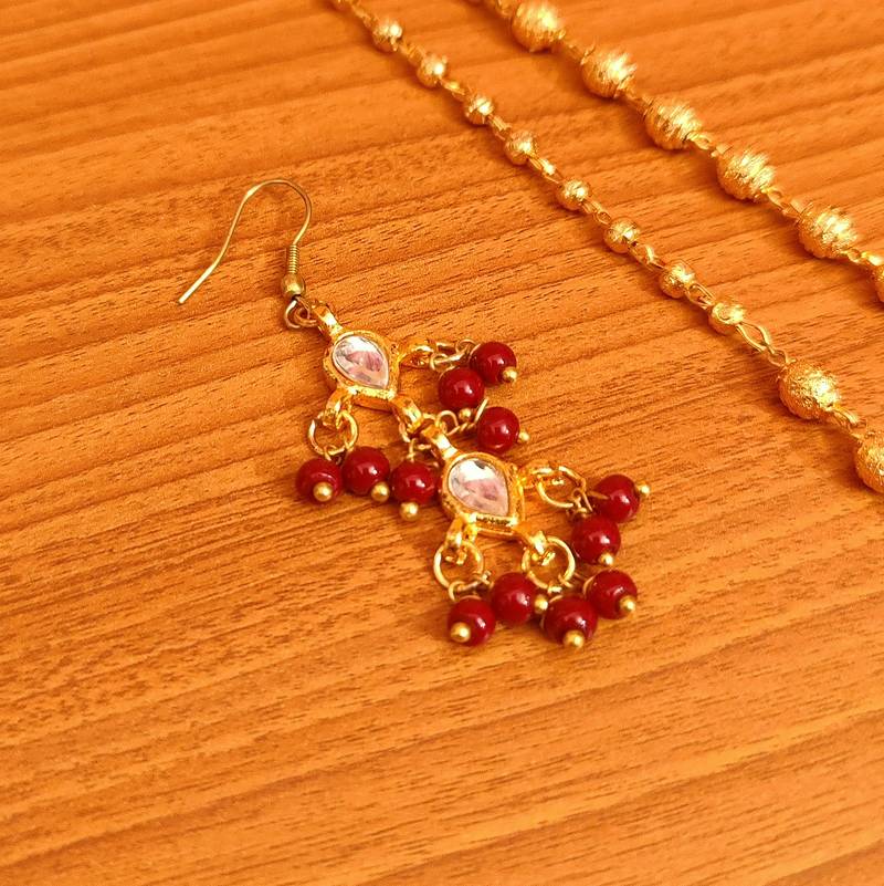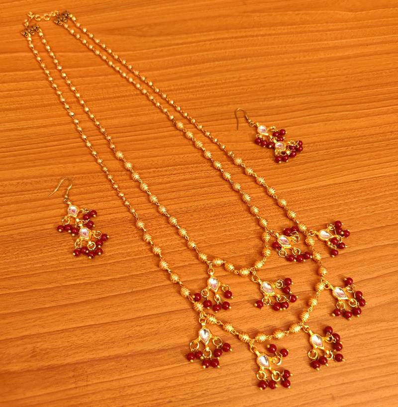 This Kundan Polki Necklace Set Is Handcrafted In copper Alloy With Imitation red colour beads And Kundan Polki Stones Of Fine Quality , The Necklace Set Is Plated In 18kt Gold Plating And The Design Itself Is Perfect For Wedding Attires.