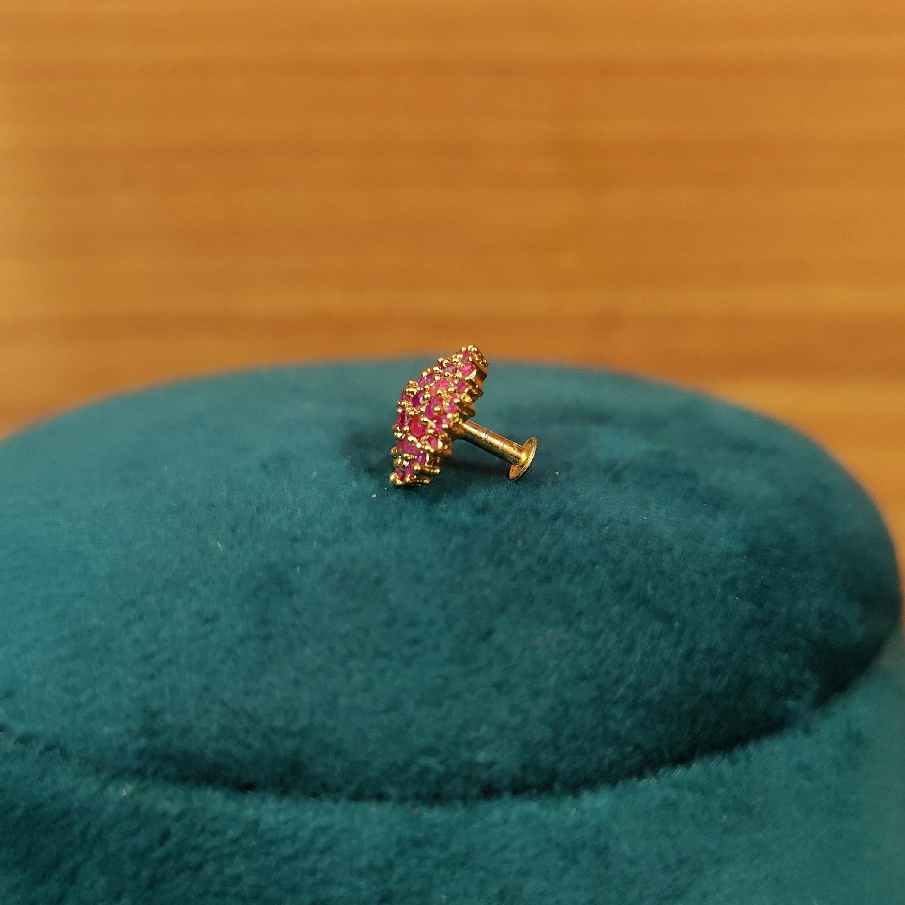 This flower pattern piercing nose ring is handcrafted in silver alloy with imitation ruby colour cz stones of very fine quality , the nose ring is very light in weight and plated with 18kt gold rhodium to give it a real gold look.