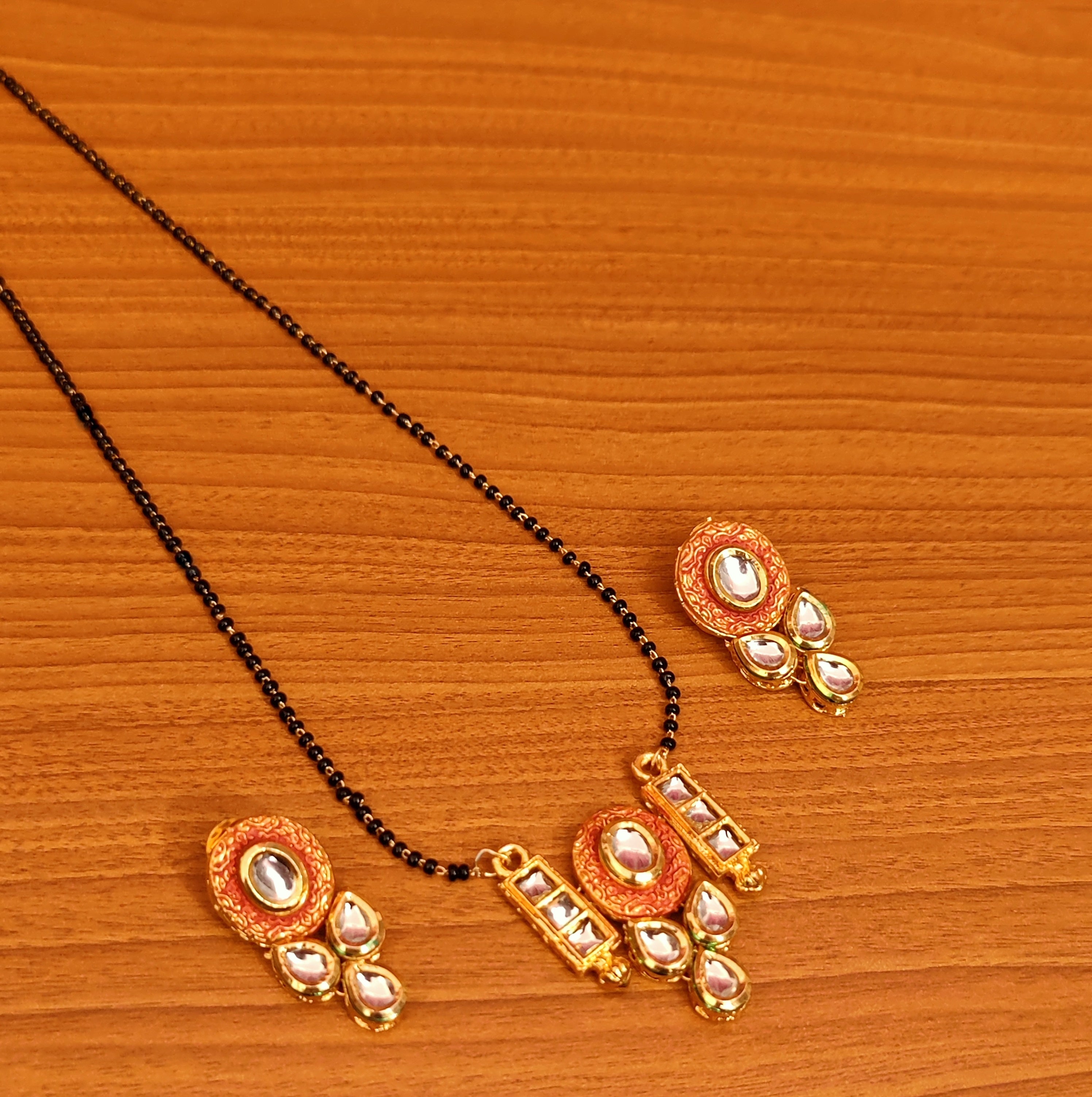 This beautiful mangalsutra is handcrafted in brass alloy with imitation kundan with orange meenakari work of very fine quality , this mangalsutra is coated with 18 kt nickle free gold plating to avoid skin allergies and its very light in weight .