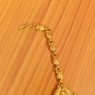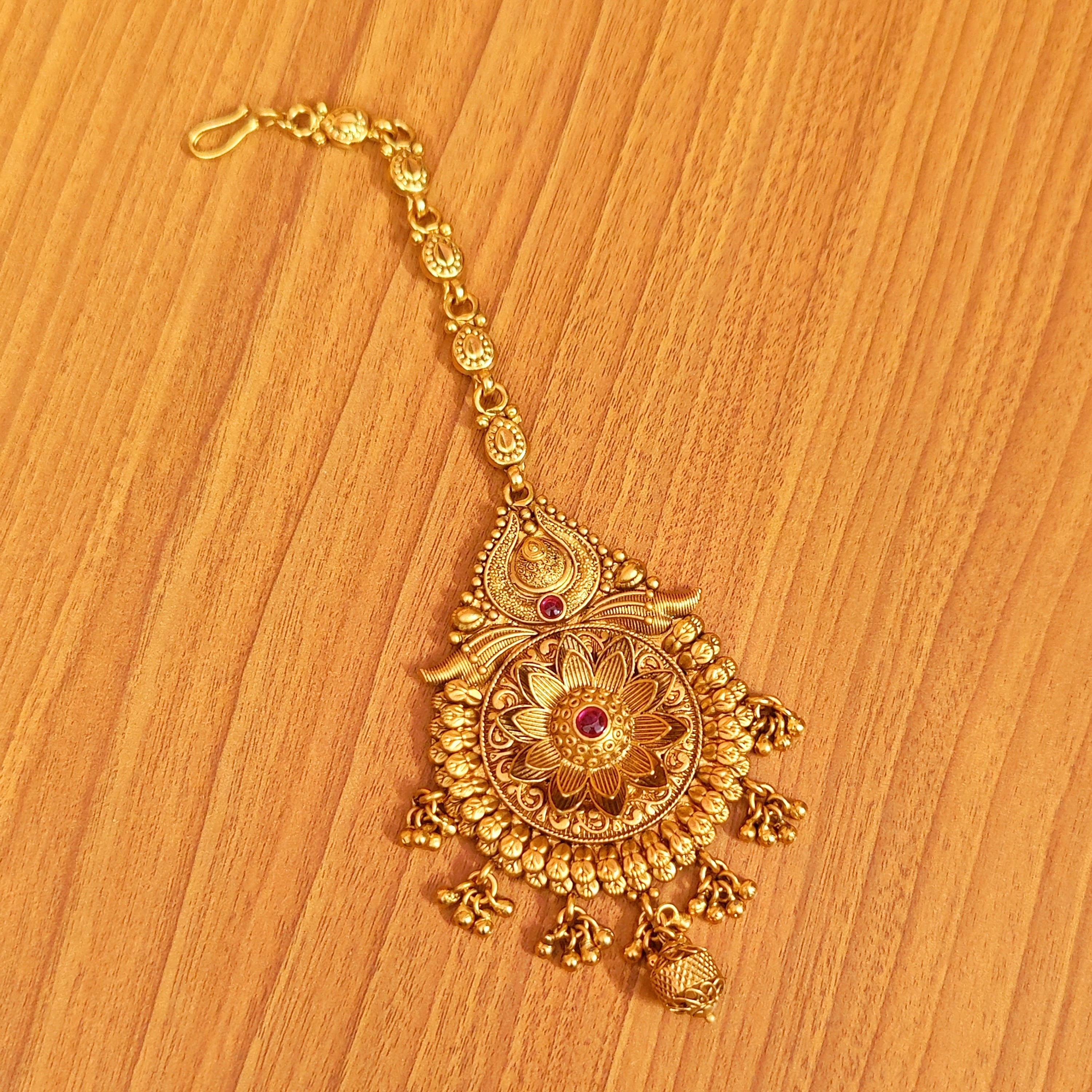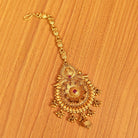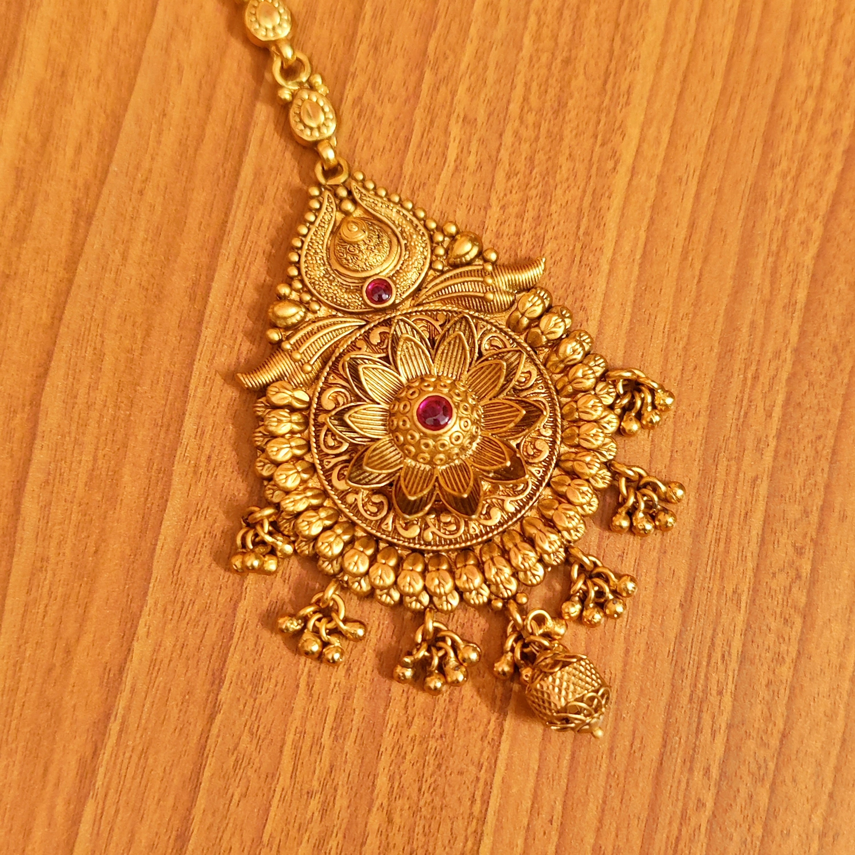 This beautiful bridal look mathapatti is handcrafted in copper alloy with minute & intricate gold work of very fine quality . This mathapatti is coated with 22 Kt matt gold plating which gives a very real look to the design . An absolutely gorgeous piece and is very light in weight.