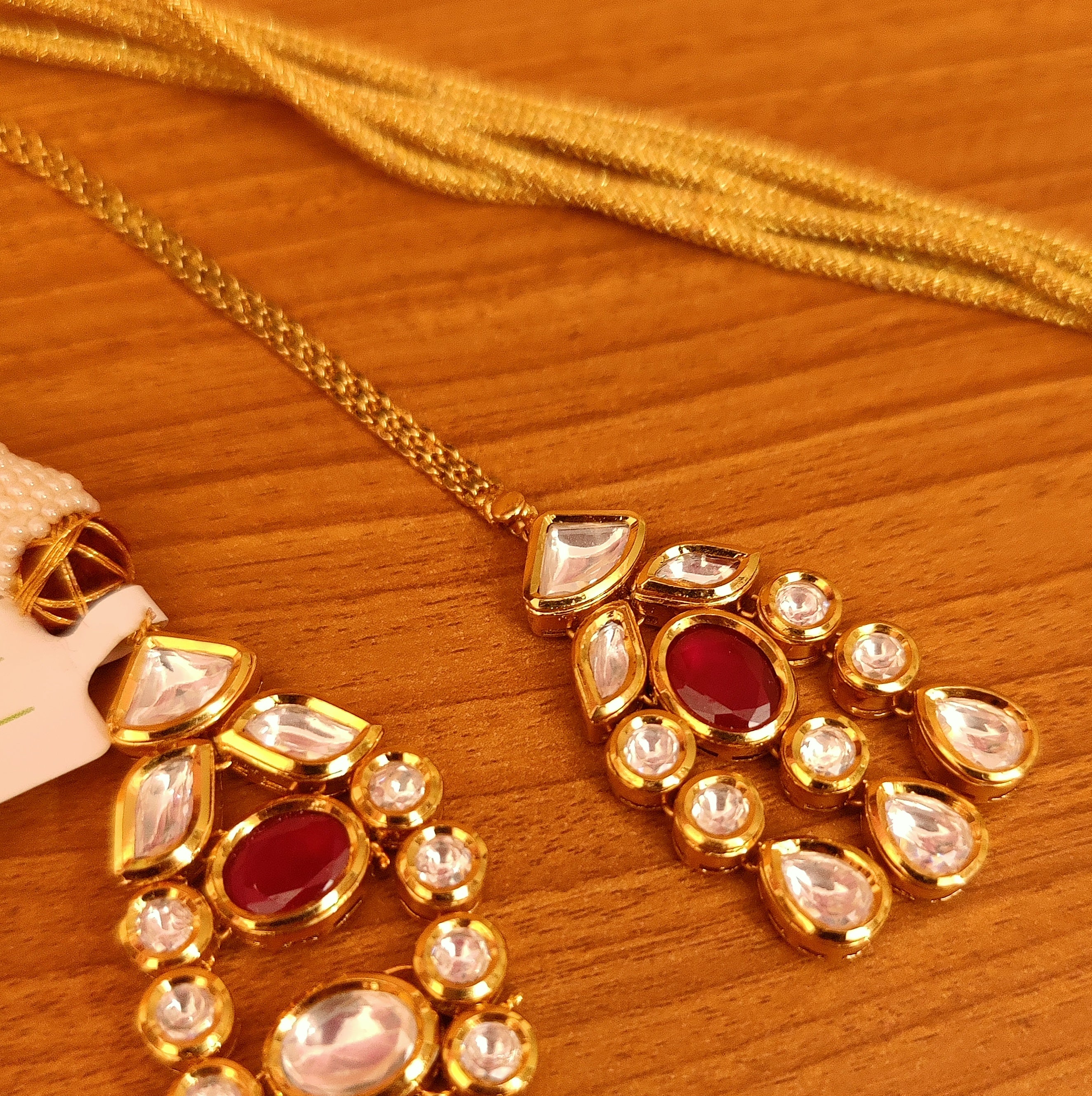 This Beautiful Necklace Set Is Handcrafted In Brass Alloy With Imitation Ruby & Kundan Work Of Very Fine Quality . This Neckace Set Is Coated With 18 Kt Gold Polish Which Give Them A Unique Look . An Absolutely Stunning Piece To Own And Are Very Light In Weight.