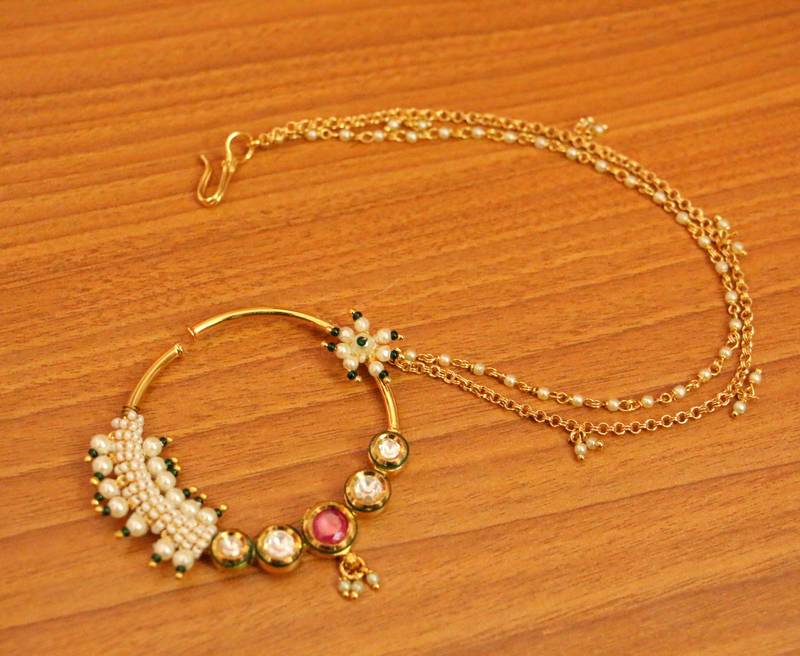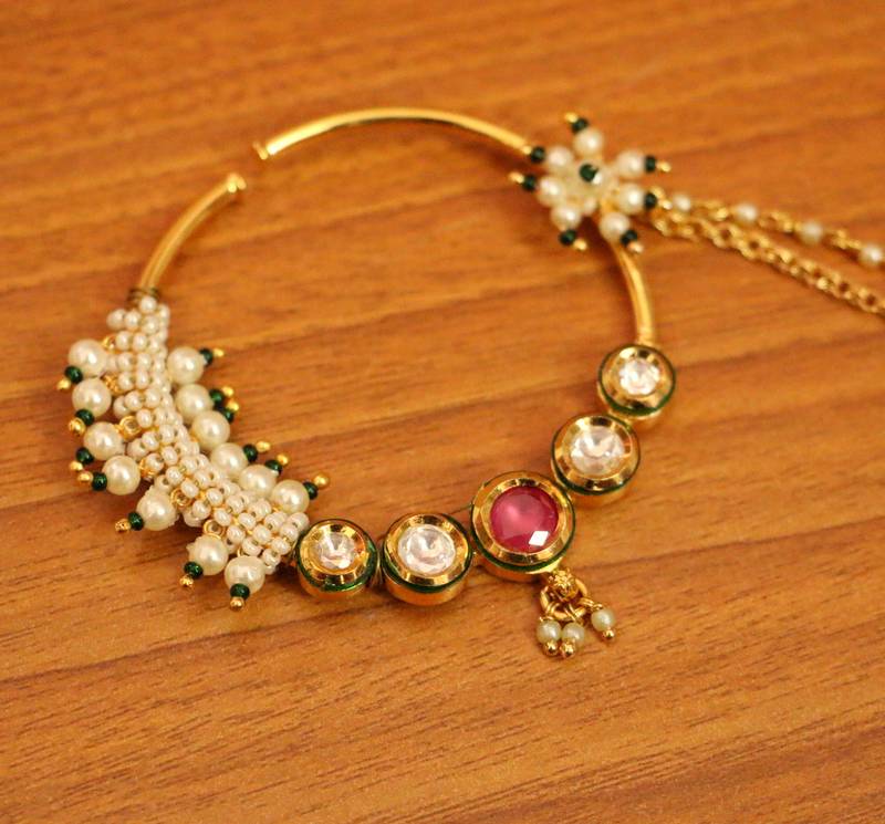 This Multilayered Kundan Nose Ring Is Handcrafted In Silver Alloy With Imitation Ruby , Kundan Stone , Pearls And Gold Plated Chains Of Very Fine Quality , The Nose Ring Is Very Light In Weight And Plated With Gold Rhodium To Give It A Real Gold Look.