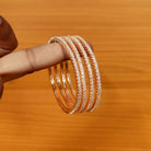 These gorgeous single line bangles are handcrafted in silver & brass alloy with american diamond stones of very fine quality. These bangles are coated with 18 Kt rose gold plating that gives a real look to the design and comes as a set of 4 bangles.