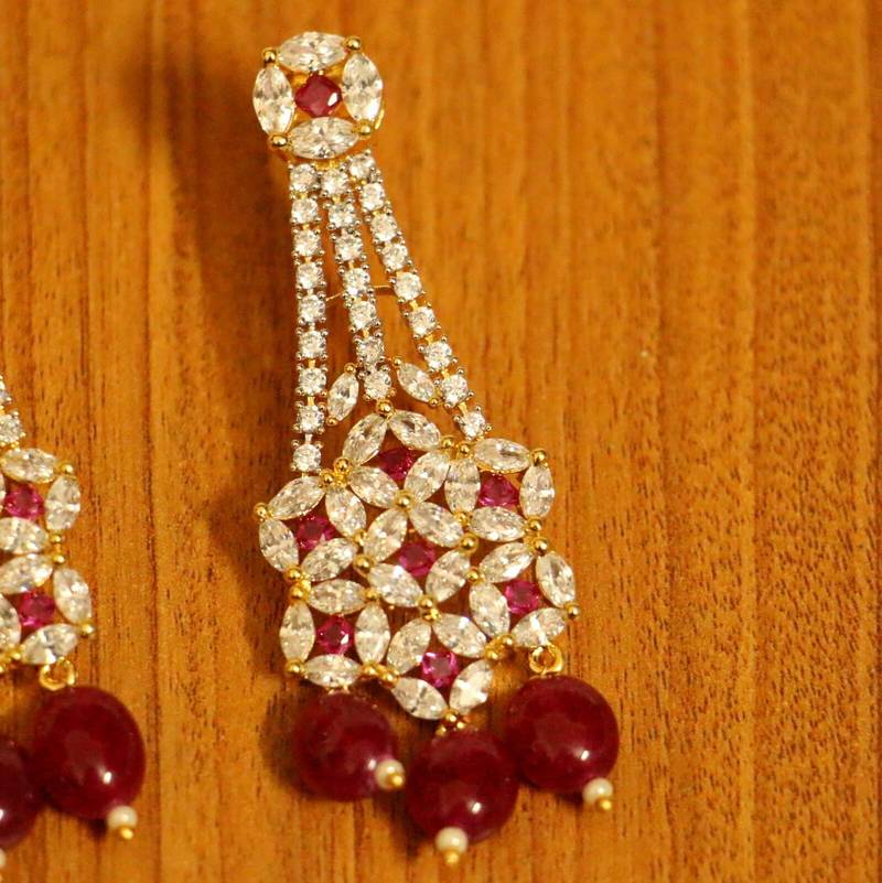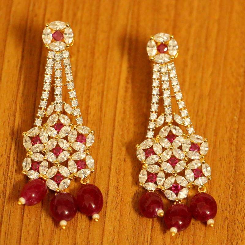 These diamond look danglers are handcrafted in silver alloy with imitation ruby colour stones & cz stones of very fine quality. These earrings are plated in 18kt gold rhodium plating which gives the design a real jewelry look .