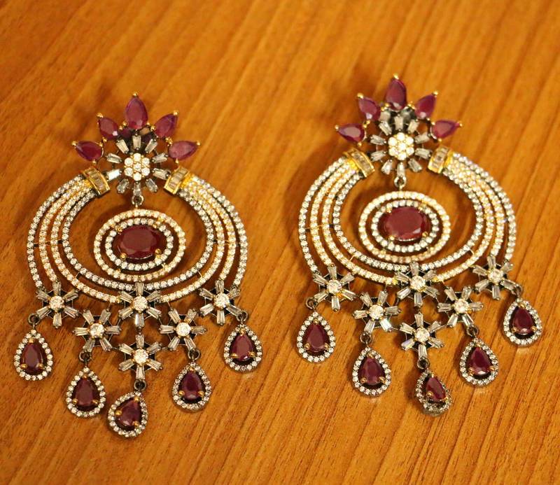 These diamond look danglers are handcrafted in silver alloy with imitation ruby colour quartz & cz stones of very fine quality. These earrings are plated in black rhodium plating which gives the design a real jewelry look .