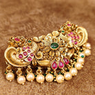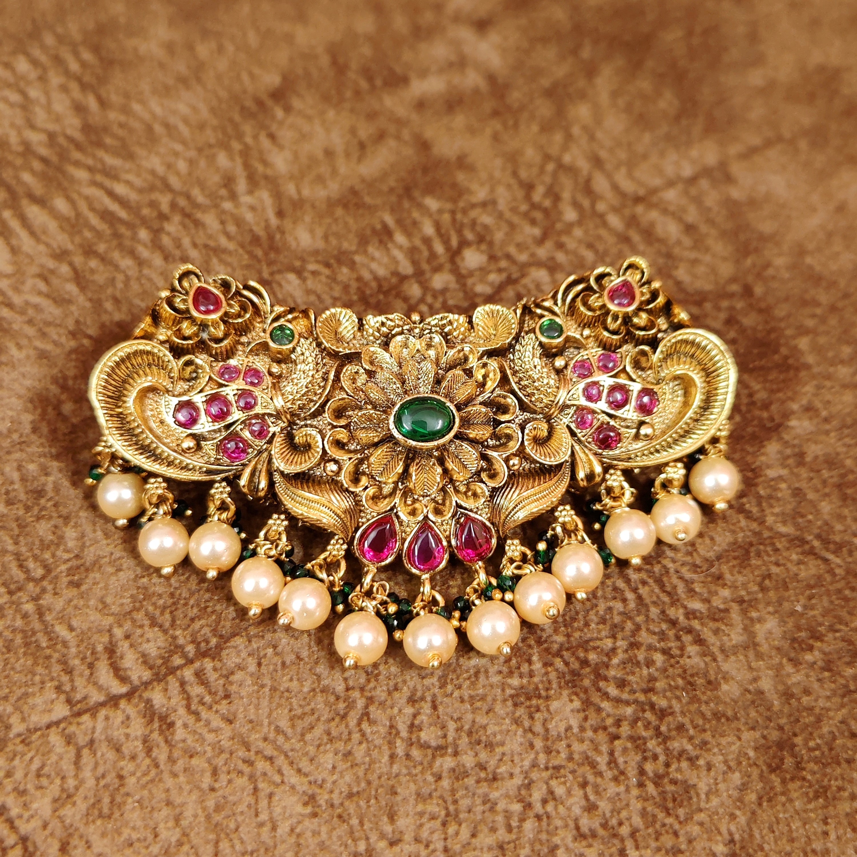 Add a regal charm to your hairstyle with this Ruby & Emerald Antique Gold Look Real Kemp Stone Hairclip. Designed with exquisite craftsmanship, this hair accessory features real Kemp stones in rich ruby and emerald hues, set in an antique gold-plated finish. The intricate detailing makes it a perfect match for traditional, bridal, and festive outfits. Secure yet stylish, this hairclip is a timeless piece that enhances your ethnic elegance effortlessly.